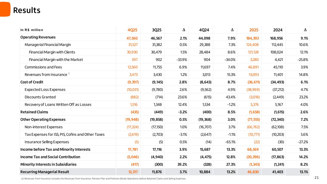 ‘‘ Income statement base for 2026 guidance (1) The consolidation of Avenue’s results will occur in 1Q26, as a consequence of the acquisition of control occurred in January-26. (2) Insurance results represents the income from insurance, pension plan and premium bonds operations (-) expenses for claims (-) insurance, pension plan and premium bonds selling expenses. (3) Main reclassifications represent approximately 90% of total reclassifications. Changes in managerial classifications and the consolidation of Avenue’s¹ results. 2 Main reclassifications³: • Expenses related to card network fee: From Non-interest Expenses to Commissions • Net margin from receivables discounting and cost of funding of automatic receivables discounting of the acquiring business: From Financial Margin with Clients to Commissions • Discount on loans in arrears up to 90 days overdue: From Financial Margin with Clients to Cost of Credit In R $ billio n 2025 as reported Reclassifications Avenue 2025 Adjusted Financial Margin with Clients 121.1 2.8 0.1 124.1 Financial margin with the market 3.3 - - 3.3 Cost of credit (36.6) (1.5) - (38.1) Commissions and Insurance Results 58.3 (2.8) 0.3 55.8 Non-interest expenses (66.8) 1.7 (0.5) (65.6) Tax expenses and other (10.8) (0.1) (0.0) (10.9) Income before tax and minority interests 68.6 0.1 (0.0) 68.6 Income before tax and minority interests (20.4) (0.1) 0.0 (20.5) Minority interests in subsidiaries (1.3) - 0.0 (1.3) Recurring managerial result 46.8 - - 46.8 Base for Guidance 2026 spreadsheet – Click here 19