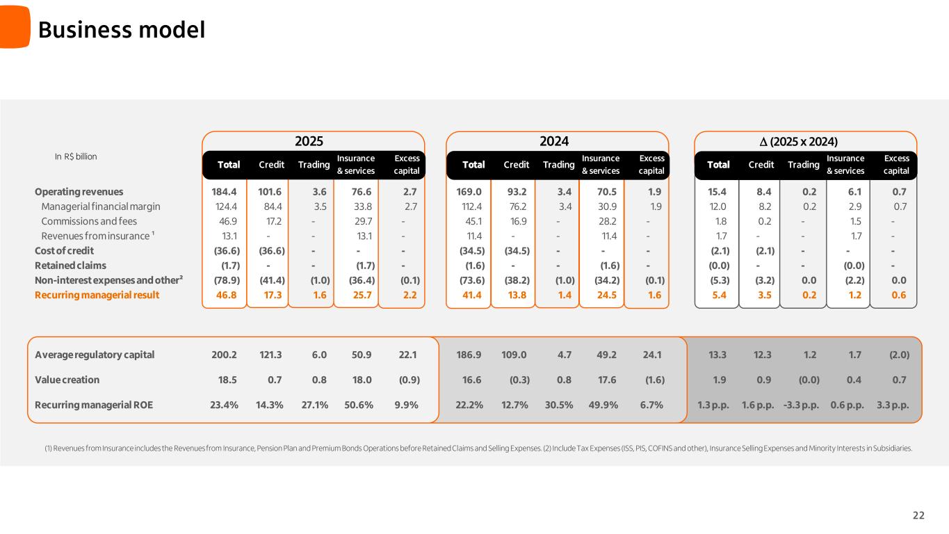 21 Results (1) Revenues from Insurance includes the Revenues from Insurance, Pension Plan and Premium Bonds Operations before Retained Claims and Selling Expenses. In R $ millio n 4Q25 3Q25 4Q24 2025 2024 Operating Revenues 47,560 46,567 2.1% 44,098 7.9% 184,393 168,956 9.1% Managerial Financial Margin 31,527 31,382 0.5% 29,388 7.3% 124,408 112,445 10.6% Financial Margin with Clients 30,930 30,479 1.5% 28,484 8.6% 121,128 108,024 12.1% Financial Margin with the Market 597 902 -33.9% 904 -34.0% 3,280 4,421 -25.8% Commissions and Fees 12,560 11,755 6.9% 11,697 7.4% 46,891 45,110 3.9% Revenues from Insurance 1 3,473 3,430 1.2% 3,013 15.3% 13,093 11,401 14.8% Cost of Credit (9,397) (9,145) 2.8% (8,643) 8.7% (36,611) (34,493) 6.1% Expected Loss Expenses (10,031) (9,780) 2.6% (9,562) 4.9% (38,969) (37,212) 4.7% Discounts Granted (882) (714) 23.6% (615) 43.4% (3,018) (2,449) 23.2% Recovery of Loans Written Off as Losses 1,516 1,348 12.4% 1,534 -1.2% 5,376 5,167 4.0% Retained Claims (435) (449) -3.2% (400) 8.5% (1,658) (1,615) 2.6% Other Operating Expenses (19,948) (19,858) 0.5% (19,368) 3.0% (77,555) (72,340) 7.2% Non-interest Expenses (17,324) (17,150) 1.0% (16,707) 3.7% (66,762) (62,108) 7.5% Tax Expenses for ISS, PIS, Cofins and Other Taxes (2,619) (2,703) -3.1% (2,647) -1.1% (10,771) (10,203) 5.6% Insurance Selling Expenses (5) (5) 0.5% (14) -65.1% (22) (30) -27.2% Income before Tax and Minority Interests 17,781 17,116 3.9% 15,687 13.3% 68,569 60,507 13.3% Income Tax and Social Contribution (5,046) (4,940) 2.2% (4,475) 12.8% (20,396) (17,863) 14.2% Minority Interests in Subsidiaries (417) (300) 39.2% (328) 27.3% (1,343) (1,241) 8.2% Recurring Managerial Result 12,317 11,876 3.7% 10,884 13.2% 46,830 41,403 13.1% D' D' D'