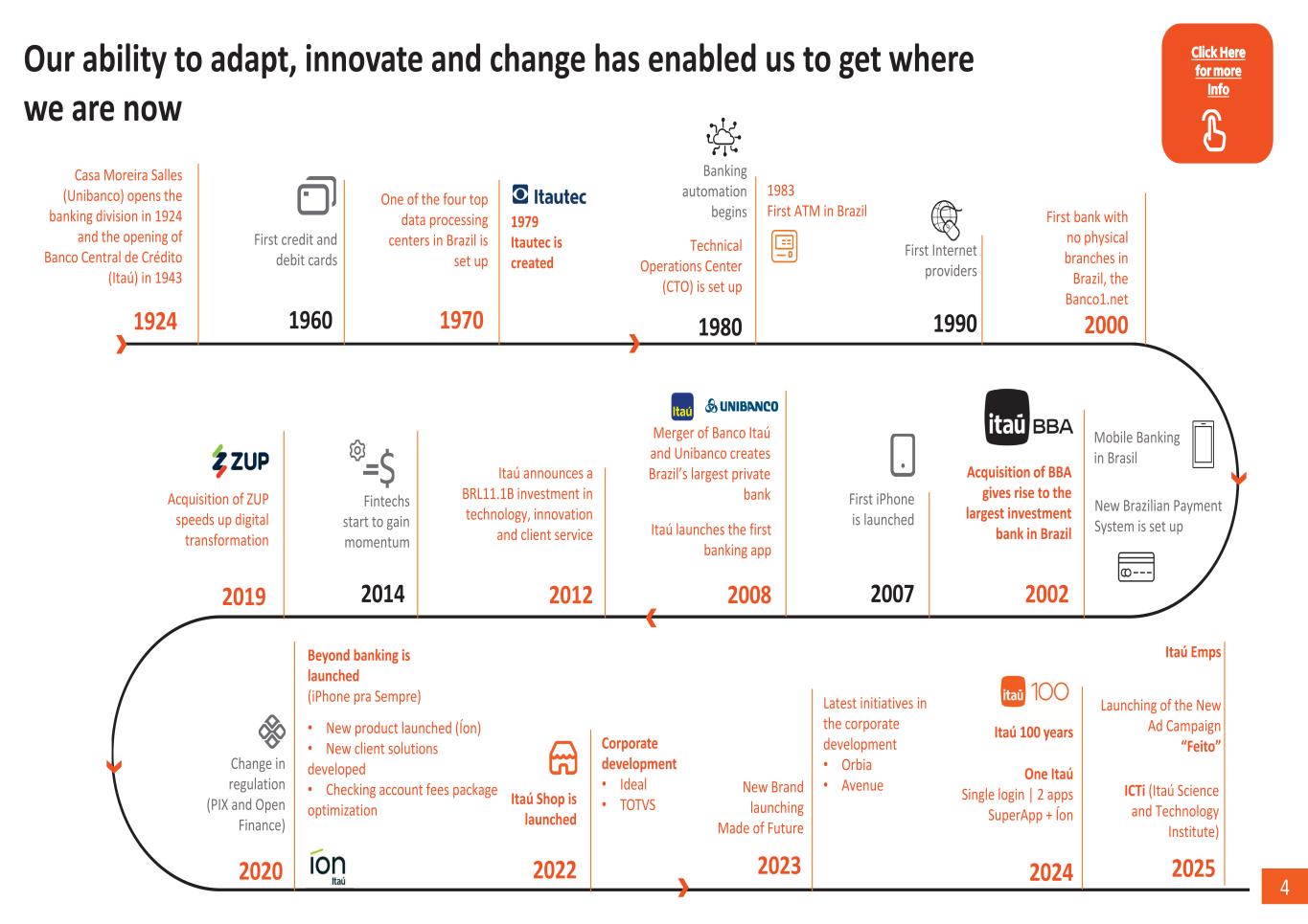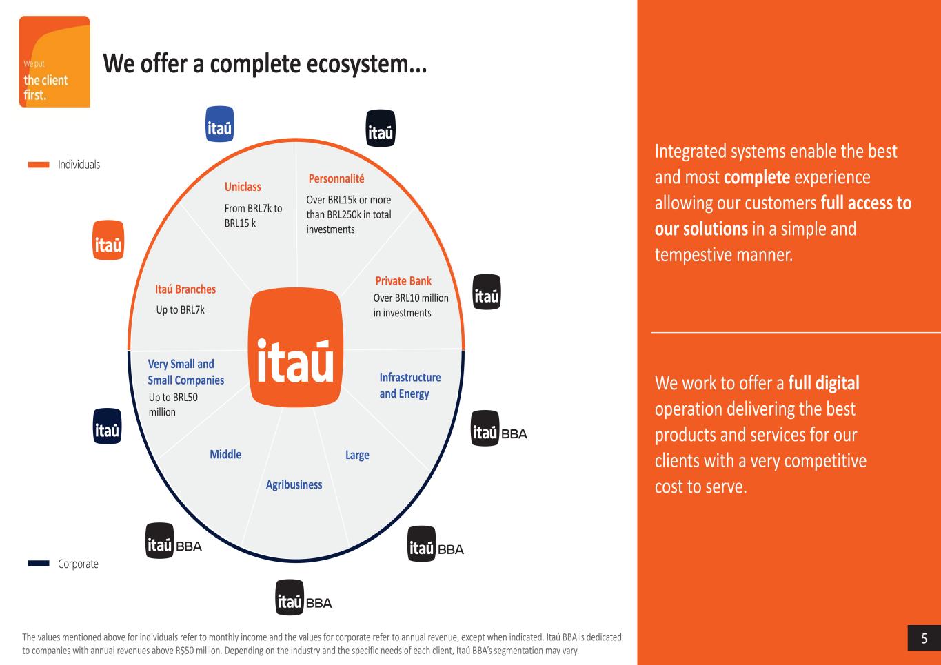 4 1924 Casa Moreira Salles (Unibanco) opens the banking division in 1924 and the opening of Banco Central de Crédito (Itaú) in 1943 1960 First credit and debit cards Our ability to adapt, innovate and change has enabled us to get where we are now 1970 1980 2000 200220072008201220142019 2020 2022 2023 2024 One of the four top data processing centers in Brazil is set up 1979 Itautec is created Banking automation begins Technical Operations Center (CTO) is set up First bank with no physical branches in Brazil, the Banco1.net Acquisition of BBA gives rise to the largest investment bank in Brazil Mobile Banking in Brasil New Brazilian Payment System is set up First iPhone is launched Merger of Banco Itaú and Unibanco creates Brazil’s largest private bank Itaú launches the first banking app Itaú announces a BRL11.1B investment in technology, innovation and client service Fintechs start to gain momentum Acquisition of ZUP speeds up digital transformation Change in regulation (PIX and Open Finance) • New product launched (Íon) • New client solutions developed • Checking account fees package optimization Itaú Shop is launched New Brand launching Made of Future Latest initiatives in the corporate development • Orbia • Avenue One Itaú Single login | 2 apps SuperApp + Íon 1990 First Internet providers 1983 First ATM in Brazil Beyond banking is launched (iPhone pra Sempre) Corporate development • Ideal • TOTVS Itaú 100 years 2025 ICTi (Itaú Science and Technology Institute) Launching of the New Ad Campaign “Feito” Click Here for more Info Itaú Emps
