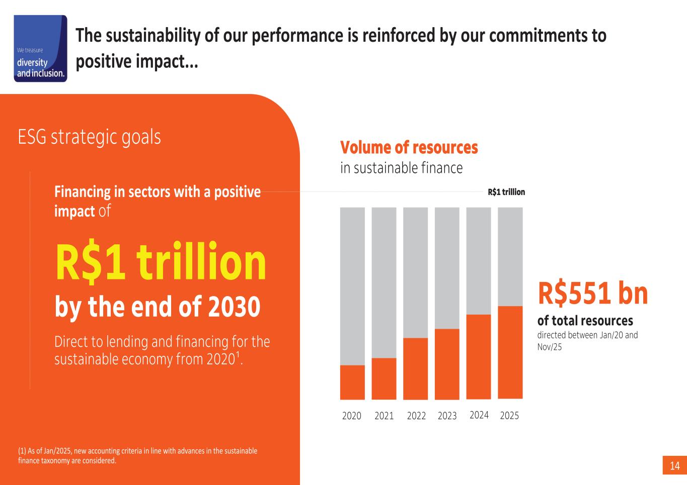 of R$1 trillion by the end of 2030 Direct to lending and financing for the sustainable economy from 2020¹. R$551 bn of total resources directed between Jan/20 and Nov/25 2020 2021 2022 2023 2024 2025 R$1 trillion Volume of resources in sustainable finance ESG strategic goals