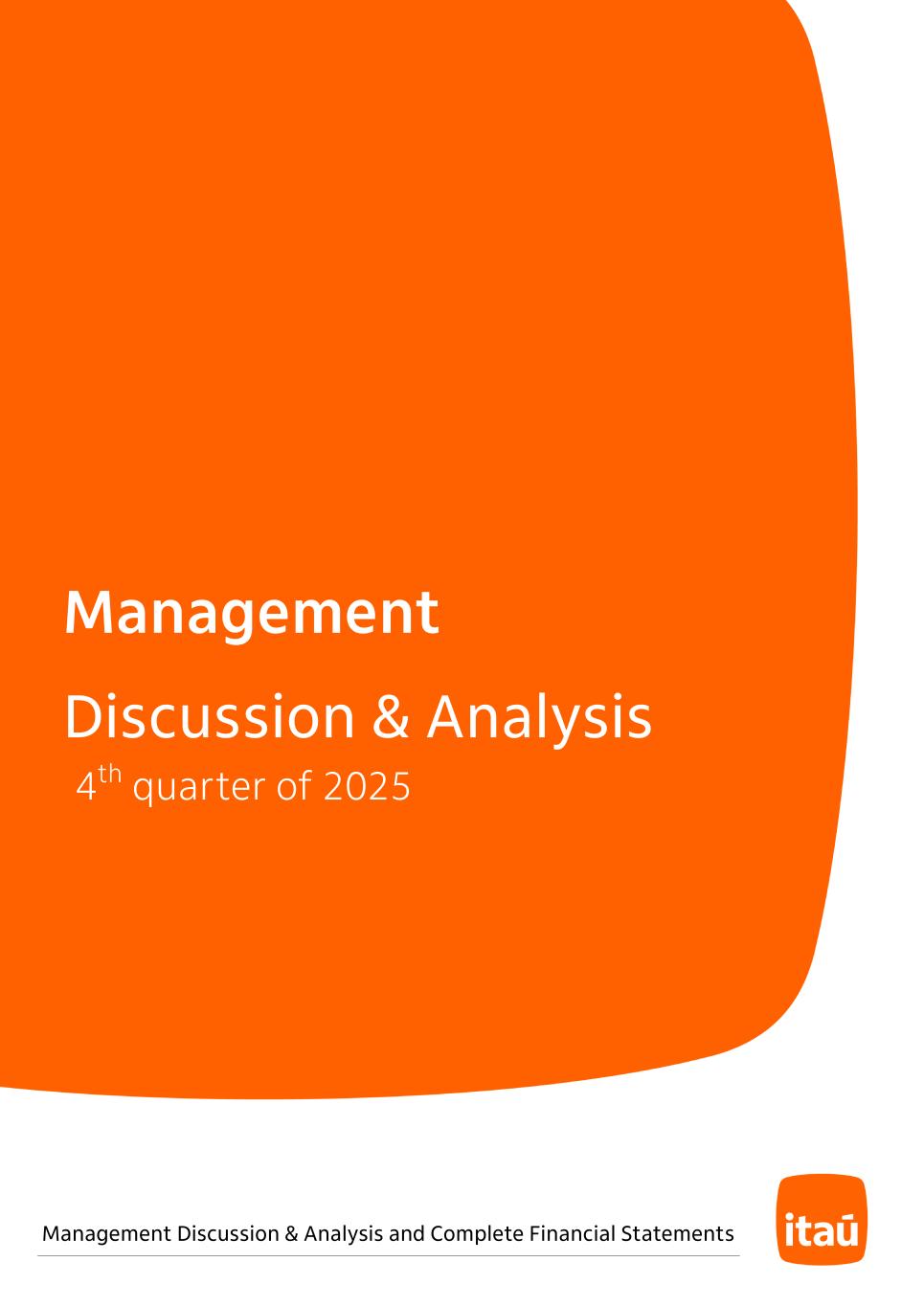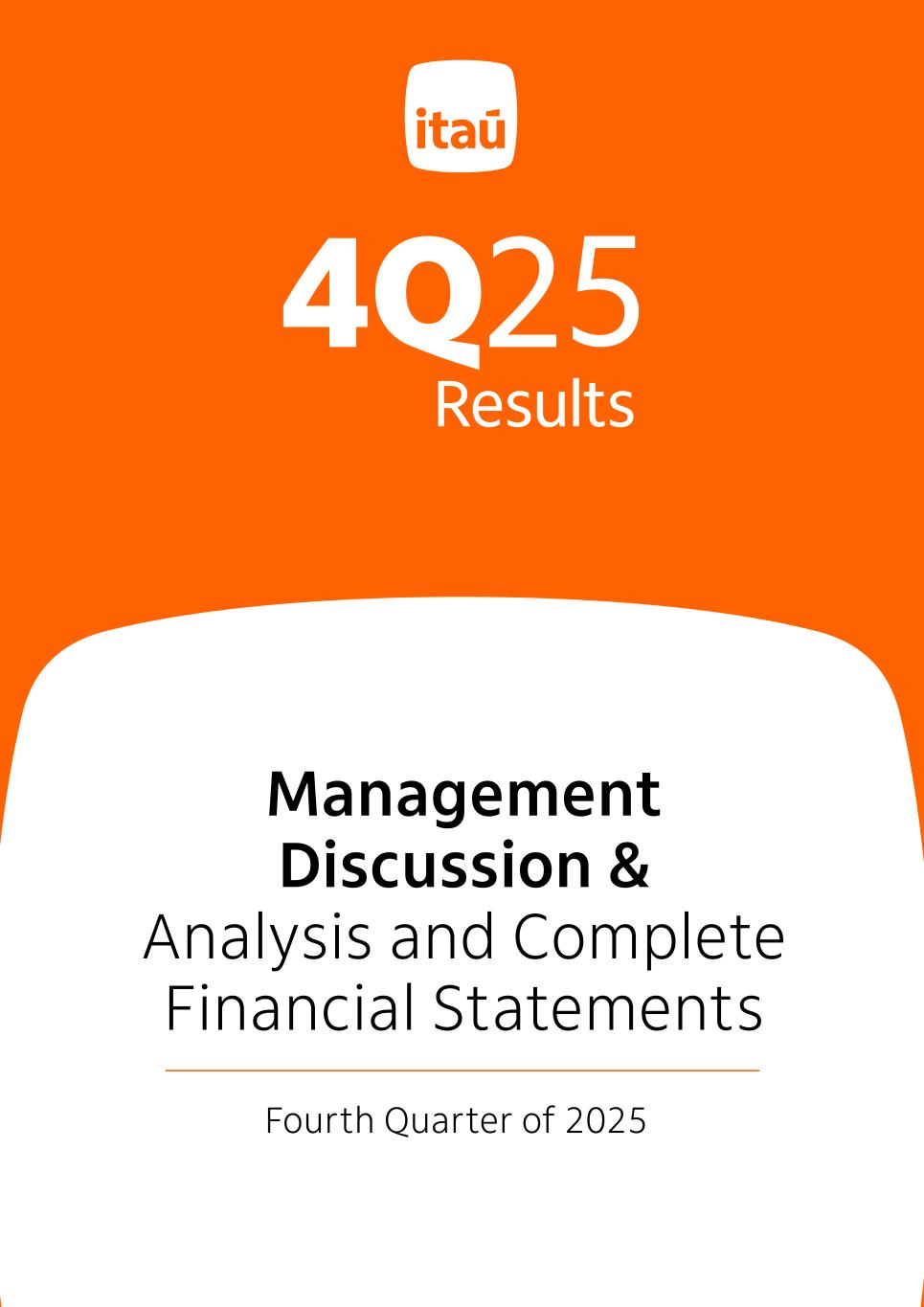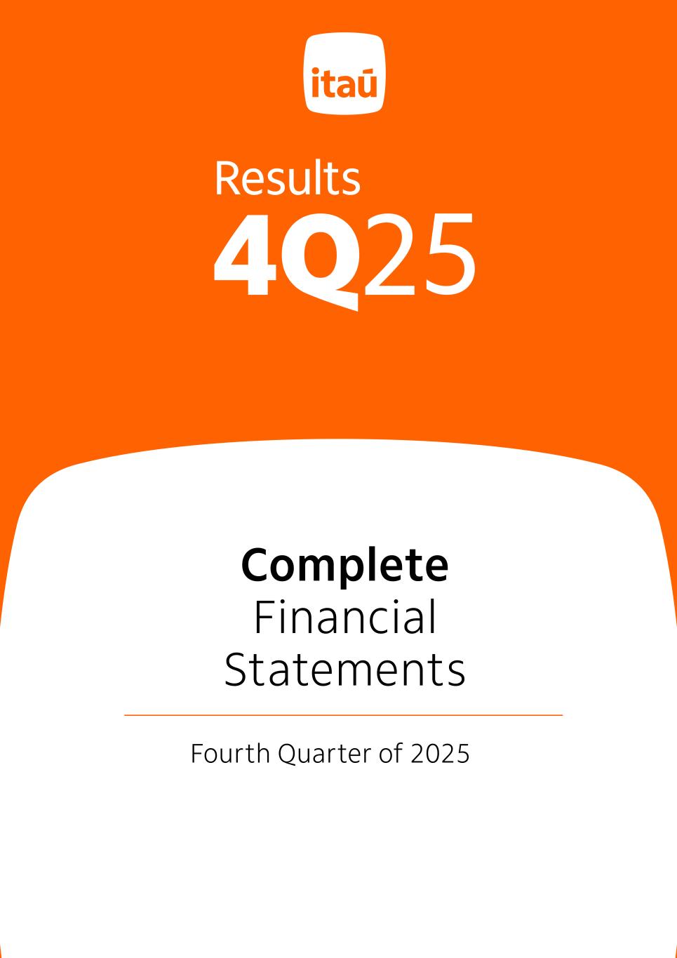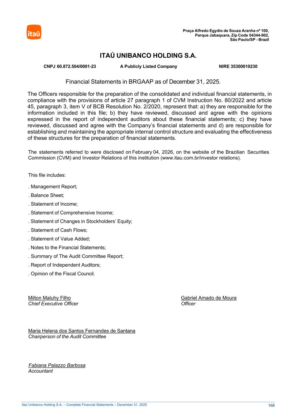 Itaú Unibanco Holding S.A. – Complete Financial Statements – December 31, 2025 Praça Alfredo Egydio de Souza Aranha nº 100, Parque Jabaquara, Zip Code 04344-902, São Paulo/SP - Brazil ITAÚ UNIBANCO HOLDING S.A. CNPJ 60.872.504/0001-23 A Publicly Listed Company NIRE 35300010230 Financial Statements in BRGAAP as of December 31, 2025. The Officers responsible for the preparation of the consolidated and individual financial statements, in compliance with the provisions of article 27 paragraph 1 of CVM Instruction No. 80/2022 and article 45, paragraph 3, item V of BCB Resolution No. 2/2020, represent that: a) they are responsible for the information included in this file; b) they have reviewed, discussed and agree with the opinions expressed in the report of independent auditors about these financial statements; c) they have reviewed, discussed and agree with the Company’s financial statements and d) are responsible for establishing and maintaining the appropriate internal control structure and evaluating the effectiveness of these structures for the preparation of financial statements. The statements referred to were disclosed on February 04, 2026, on the website of the Brazilian Securities Commission (CVM) and Investor Relations of this institution (www.itau.com.br/investor relations). This file includes: . Management Report; . Balance Sheet; . Statement of Income; . Statement of Comprehensive Income; . Statement of Changes in Stockholders’ Equity; . Statement of Cash Flows; . Statement of Value Added; . Notes to the Financial Statements; . Summary of The Audit Committee Report; . Report of Independent Auditors; . Opinion of the Fiscal Council. Milton Maluhy Filho Gabriel Amado de Moura Chief Executive Officer Officer Maria Helena dos Santos Fernandes de Santana Chairperson of the Audit Committee Fabiana Palazzo Barbosa Accountant 168
