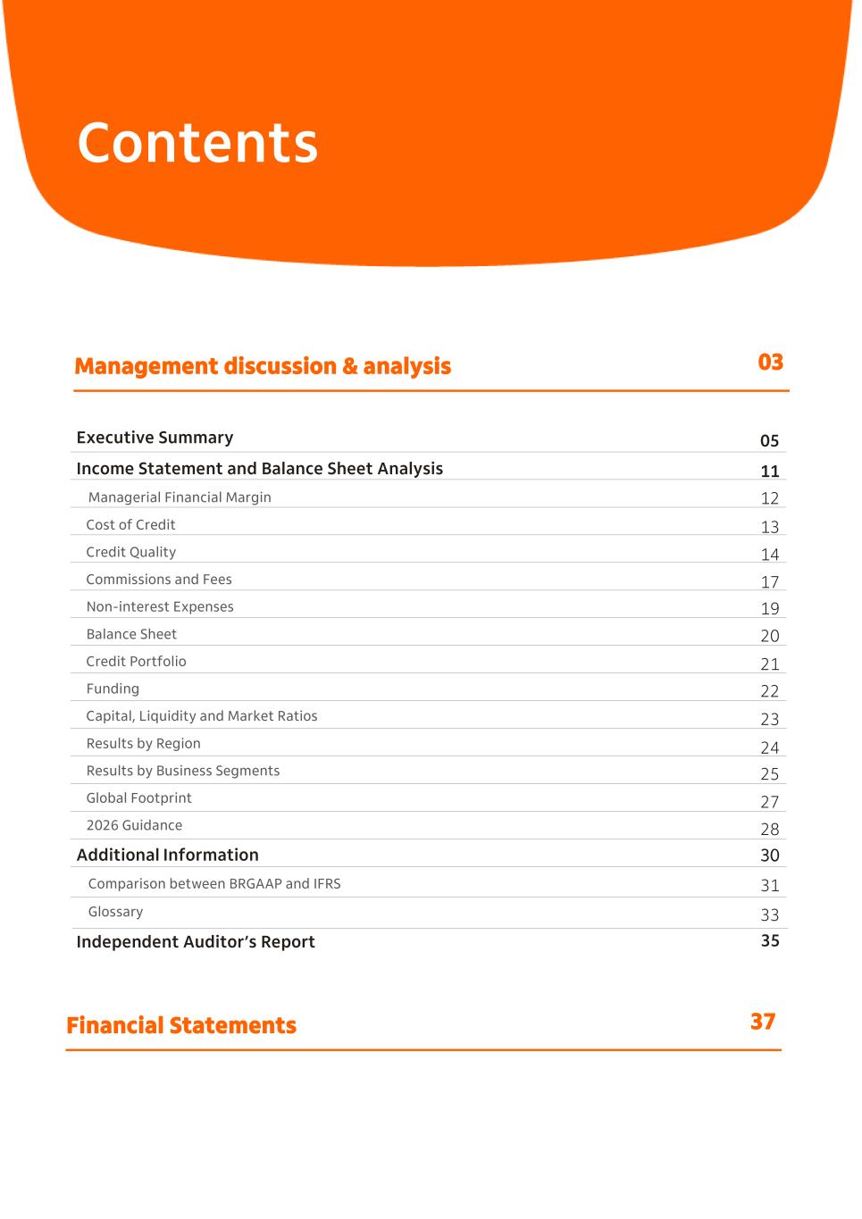 Contents Executive Summary Income Statement and Balance Sheet Analysis Managerial Financial Margin Cost of Credit Credit Quality Commissions and Fees Non-interest Expenses Balance Sheet Credit Portfolio Funding Capital, Liquidity and Market Ratios Results by Region Results by Business Segments Global Footprint 2026 Guidance Additional Information Comparison between BRGAAP and IFRS Glossary Independent Auditor’s Report 05 11 12 13 14 17 19 20 21 22 23 24 25 27 28 30 31 33 Management discussion & analysis 03 Financial Statements 37 35