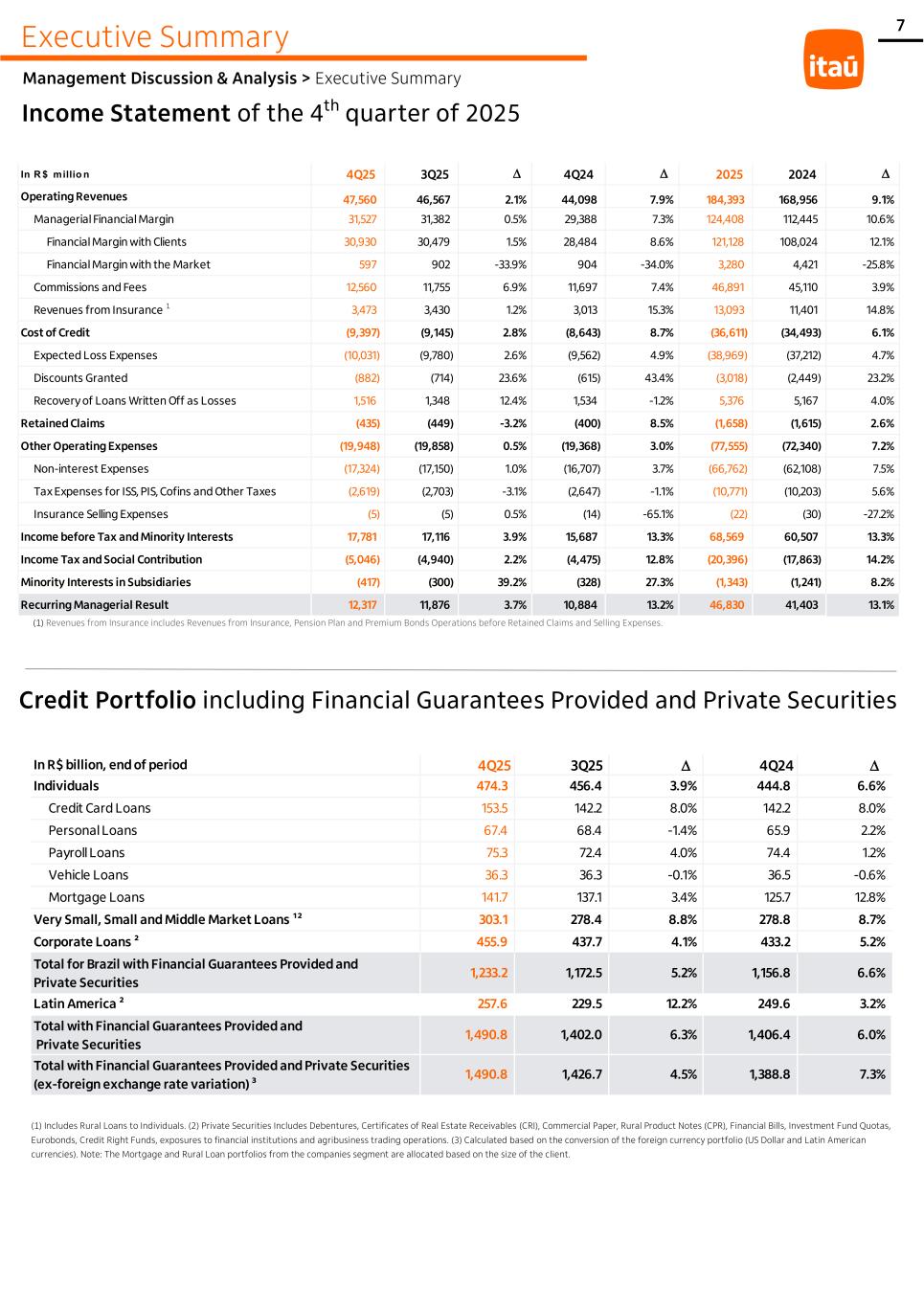 Executive Summary Management Discussion & Analysis > Executive Summary Income Statement of the 4th quarter of 2025 Credit Portfolio including Financial Guarantees Provided and Private Securities (1) Revenues from Insurance includes Revenues from Insurance, Pension Plan and Premium Bonds Operations before Retained Claims and Selling Expenses. 7 (1) Includes Rural Loans to Individuals. (2) Private Securities Includes Debentures, Certificates of Real Estate Receivables (CRI), Commercial Paper, Rural Product Notes (CPR), Financial Bills, Investment Fund Quotas, Eurobonds, Credit Right Funds, exposures to financial institutions and agribusiness trading operations. (3) Calculated based on the conversion of the foreign currency portfolio (US Dollar and Latin American currencies). Note: The Mortgage and Rural Loan portfolios from the companies segment are allocated based on the size of the client. In R$ billion, end of period 4Q25 3Q25 D' 4Q24 D' Individuals 474.3 456.4 3.9% 444.8 6.6% Credit Card Loans 153.5 142.2 8.0% 142.2 8.0% Personal Loans 67.4 68.4 -1.4% 65.9 2.2% Payroll Loans 75.3 72.4 4.0% 74.4 1.2% Vehicle Loans 36.3 36.3 -0.1% 36.5 -0.6% Mortgage Loans 141.7 137.1 3.4% 125.7 12.8% Very Small, Small and Middle Market Loans ¹² 303.1 278.4 8.8% 278.8 8.7% Corporate Loans ² 455.9 437.7 4.1% 433.2 5.2% Total for Brazil with Financial Guarantees Provided and Private Securities 1,233.2 1,172.5 5.2% 1,156.8 6.6% Latin America ² 257.6 229.5 12.2% 249.6 3.2% Total with Financial Guarantees Provided and Private Securities 1,490.8 1,402.0 6.3% 1,406.4 6.0% Total with Financial Guarantees Provided and Private Securities (ex-foreign exchange rate variation) ³ 1,490.8 1,426.7 4.5% 1,388.8 7.3% In R $ millio n 4Q25 3Q25 4Q24 2025 2024 Operating Revenues 47,560 46,567 2.1% 44,098 7.9% 184,393 168,956 9.1% Managerial Financial Margin 31,527 31,382 0.5% 29,388 7.3% 124,408 112,445 10.6% Financial Margin with Clients 30,930 30,479 1.5% 28,484 8.6% 121,128 108,024 12.1% Financial Margin with the Market 597 902 -33.9% 904 -34.0% 3,280 4,421 -25.8% Commissions and Fees 12,560 11,755 6.9% 11,697 7.4% 46,891 45,110 3.9% Revenues from Insurance 1 3,473 3,430 1.2% 3,013 15.3% 13,093 11,401 14.8% Cost of Credit (9,397) (9,145) 2.8% (8,643) 8.7% (36,611) (34,493) 6.1% Expected Loss Expenses (10,031) (9,780) 2.6% (9,562) 4.9% (38,969) (37,212) 4.7% Discounts Granted (882) (714) 23.6% (615) 43.4% (3,018) (2,449) 23.2% Recovery of Loans Written Off as Losses 1,516 1,348 12.4% 1,534 -1.2% 5,376 5,167 4.0% Retained Claims (435) (449) -3.2% (400) 8.5% (1,658) (1,615) 2.6% Other Operating Expenses (19,948) (19,858) 0.5% (19,368) 3.0% (77,555) (72,340) 7.2% Non-interest Expenses (17,324) (17,150) 1.0% (16,707) 3.7% (66,762) (62,108) 7.5% Tax Expenses for ISS, PIS, Cofins and Other Taxes (2,619) (2,703) -3.1% (2,647) -1.1% (10,771) (10,203) 5.6% Insurance Selling Expenses (5) (5) 0.5% (14) -65.1% (22) (30) -27.2% Income before Tax and Minority Interests 17,781 17,116 3.9% 15,687 13.3% 68,569 60,507 13.3% Income Tax and Social Contribution (5,046) (4,940) 2.2% (4,475) 12.8% (20,396) (17,863) 14.2% Minority Interests in Subsidiaries (417) (300) 39.2% (328) 27.3% (1,343) (1,241) 8.2% Recurring Managerial Result 12,317 11,876 3.7% 10,884 13.2% 46,830 41,403 13.1% D' D' D'