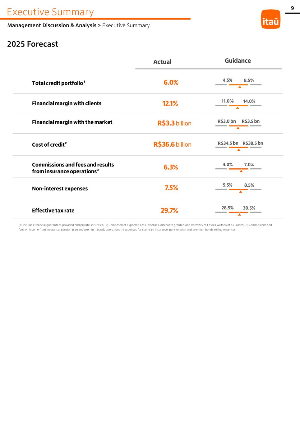 Executive Summary Management Discussion & Analysis > Executive Summary 2025 Forecast (1) Includes financial guarantees provided and private securities; (2) Composed of Expected Loss Expenses, discounts granted and Recovery of Losses Written of as Losses; (3) Commissions and fees (+) income from insurance, pension plan and premium bonds operations (-) expenses for claims (-) insurance, pension plan and premium bonds selling expenses. 9 Total credit portfolio¹ Financial margin with clients Financial margin with the market Cost of credit² Commissions and fees and results from insurance operations³ Non-interest expenses Effective tax rate 6.0% 12.1% R$3.3 billion R$36.6 billion 6.3% 7.5% 29.7% Actual 28.5% 30.5% 5.5% 8.5% 4.5% 8.5% 11.0% 14.0% 4.0% 7.0% R$3.0 bn R$3.5 bn R$34.5 bn R$38.5 bn Guidance