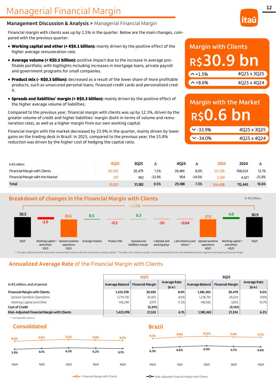 Managerial Financial Margin Management Discussion & Analysis > Managerial Financial Margin (1) (1) (2) Consolidated Brazil 12 (1) Average daily balance. 30.5 26.6 ​ 27.0 30.9 -3.9 -0.3 -0.1 -0.04 ​ 0.5 0.3 4.0 3Q25 Working capital and others 3Q25 Spread-sensitive operations 3Q25 Average Volume Product Mix Spreads and liabilities' margin Calendar and working days Latin America and others Spread-sensitive operations 4Q25 Working capital and others 4Q25 4Q25 Breakdown of changes in the Financial Margin with Clients In R$ billion (1) Includes capital allocated to business areas (except treasury) and the corporation working capital. (2) Includes Latin America margin, structured operations from the wholesale business segment and acquiring financial margin. + 1.5% Annualized Average Rate of the Financial Margin with Clients In R$ million 4Q25 3Q25  4Q24  2025 2024  Financial Margin with Clients 30,930 30,479 1.5% 28,484 8.6% 121,128 108,024 12.1% Financial Margin with the Market 597 902 -33.9% 904 -34.0% 3,280 4,421 -25.8% Total 31,527 31,382 0.5% 29,388 7.3% 124,408 112,445 10.6% Financial margin with clients was up by 1.5% in the quarter. Below are the main changes, com- pared with the previous quarter: • Working capital and other (+ R$0.1 billion): mainly driven by the positive effect of the higher average remuneration rate. • Average volume (+ R$0.5 billion): positive impact due to the increase in average pro- fitable portfolio, with highlights including increases in mortgage loans, private payroll and government programs for small companies. • Product mix (- R$0.3 billion): decreased as a result of the lower share of more profitable products, such as unsecured personal loans, financed credit cards and personalized cred- it. • Spreads and liabilities’ margin (+ R$0.3 billion): mainly driven by the positive effect of the higher average volume of liabilities. Compared to the previous year, financial margin with clients was up by 12.1%, driven by the greater volume of credit and higher liabilities’ margin (both in terms of volume and remu- neration rate), as well as a higher margin from our own working capital. Financial margin with the market decreased by 33.9% in the quarter, mainly driven by lower gains on the trading desk in Brazil. In 2025, compared to the previous year, the 25.8% reduction was driven by the higher cost of hedging the capital ratio. Margin with Clients R$30.9 bn +1.5% +8.6% 4Q25 x 3Q25 4Q25 x 4Q24 Margin with the Market R$0.6 bn -33.9% -34.0% 4Q25 x 3Q25 4Q25 x 4Q24 In R$ million, end of period Average Balance Financial Margin Average Rate (p.a.) Average Balance Financial Margin Average Rate (p.a.) Financial Margin with Clients 1,425,978 30,930 8.9% 1,385,363 30,479 9.0% Spread-Sensitive Operations 1,279,730 26,955 8.6% 1,236,781 26,629 8.8% Working Capital and Other 146,248 3,975 11.2% 148,582 3,850 10.7% Cost of Credit (9,397) (9,145) Risk-Adjusted Financial Margin with Clients 1,425,978 21,533 6.1% 1,385,363 21,334 6.2% 4Q25 3Q25 (1) (1) 8.6% 9.0% 9.2% 9.0% 8.9% 5.9% 6.1% 6.3% 6.2% 6.1% 4Q24 1Q25 2Q25 3Q25 4Q25 9.3% 9.8% 10.0% 9.8% 9.7% 6.3% 6.6% 6.9% 6.7% 6.6% 4Q24 1Q25 2Q25 3Q25 4Q25 Financial Margin with Clients Risk-Adjusted Financial Margin with Clients