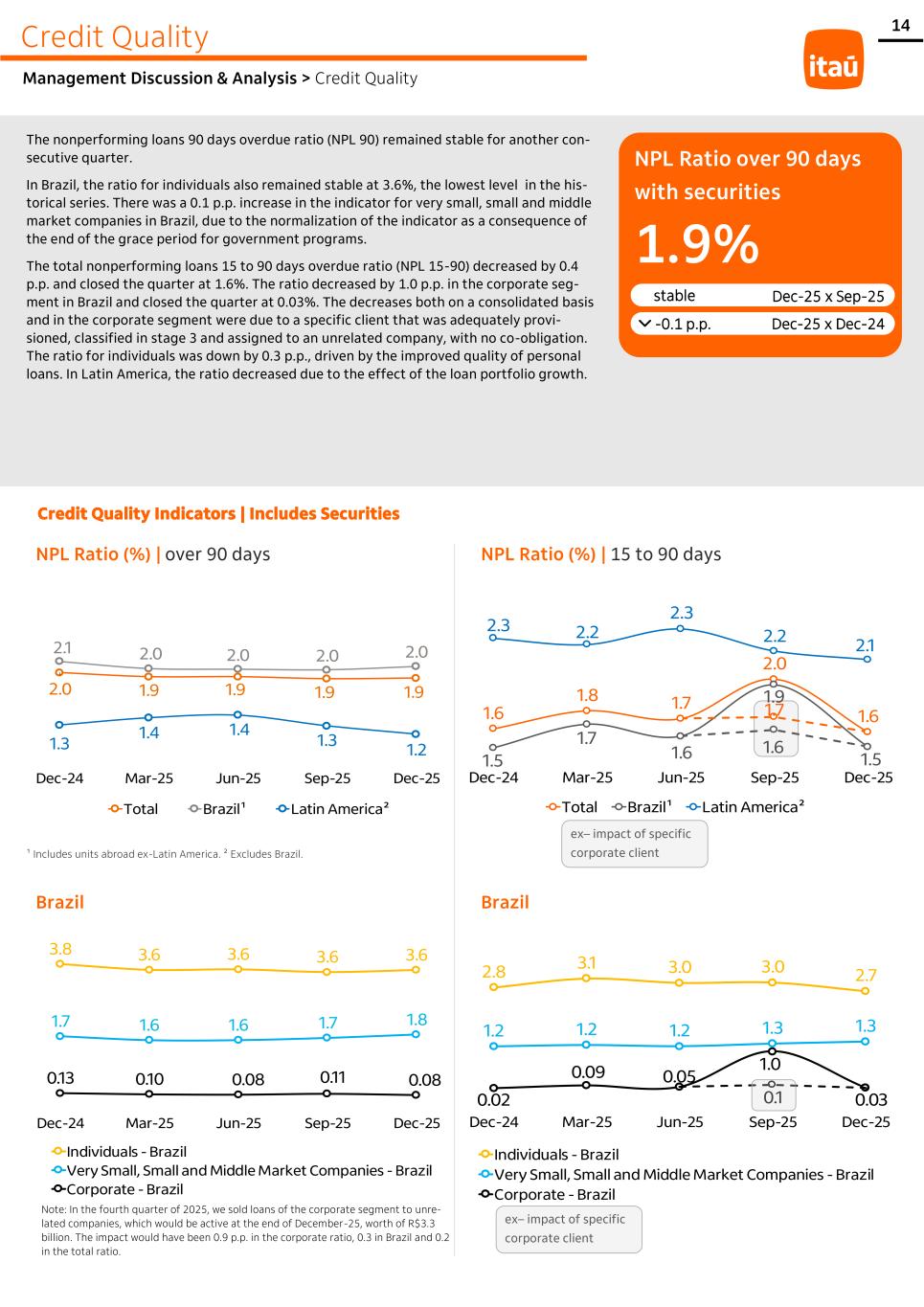 14 Credit Quality Management Discussion & Analysis > Credit Quality The nonperforming loans 90 days overdue ratio (NPL 90) remained stable for another con- secutive quarter. In Brazil, the ratio for individuals also remained stable at 3.6%, the lowest level in the his- torical series. There was a 0.1 p.p. increase in the indicator for very small, small and middle market companies in Brazil, due to the normalization of the indicator as a consequence of the end of the grace period for government programs. The total nonperforming loans 15 to 90 days overdue ratio (NPL 15-90) decreased by 0.4 p.p. and closed the quarter at 1.6%. The ratio decreased by 1.0 p.p. in the corporate seg- ment in Brazil and closed the quarter at 0.03%. The decreases both on a consolidated basis and in the corporate segment were due to a specific client that was adequately provi- sioned, classified in stage 3 and assigned to an unrelated company, with no co-obligation. The ratio for individuals was down by 0.3 p.p., driven by the improved quality of personal loans. In Latin America, the ratio decreased due to the effect of the loan portfolio growth. NPL Ratio (%) | over 90 days NPL Ratio (%) | 15 to 90 days Brazil Brazil ¹ Includes units abroad ex-Latin America. ² Excludes Brazil. -0.1 p.p. Dec-25 x Dec-24 stable Dec-25 x Sep-25 1.9% NPL Ratio over 90 days with securities ex– impact of specific corporate client 3.8 3.6 3.6 3.6 3.6 1.7 1.6 1.6 1.7 1.8 0.13 0.10 0.08 0.11 0.08 Dec-24 Mar-25 Jun-25 Sep-25 Dec-25 Individuals - Brazil Very Small, Small and Middle Market Companies - Brazil Corporate - Brazil 2.0 1.9 1.9 1.9 1.9 2.1 2.0 2.0 2.0 2.0 1.3 1.4 1.4 1.3 1.2 Dec-24 Mar-25 Jun-25 Sep-25 Dec-25 Total Brazil¹ Latin America² 1.6 1.8 1.7 2.0 1.6 1.5 1.7 1.6 1.9 1.5 2.3 2.2 2.3 2.2 2.1 1.7 1.6 Dec-24 Mar-25 Jun-25 Sep-25 Dec-25 Total Brazil¹ Latin America² 2.8 3.1 3.0 3.0 2.7 1.2 1.2 1.2 1.3 1.3 0.02 0.09 0.05 1.0 0.030.1 Dec-24 Mar-25 Jun-25 Sep-25 Dec-25 Individuals - Brazil Very Small, Small and Middle Market Companies - Brazil Corporate - Brazil ex– impact of specific corporate client Credit Quality Indicators | Includes Securities Note: In the fourth quarter of 2025, we sold loans of the corporate segment to unre- lated companies, which would be active at the end of December-25, worth of R$3.3 billion. The impact would have been 0.9 p.p. in the corporate ratio, 0.3 in Brazil and 0.2 in the total ratio.