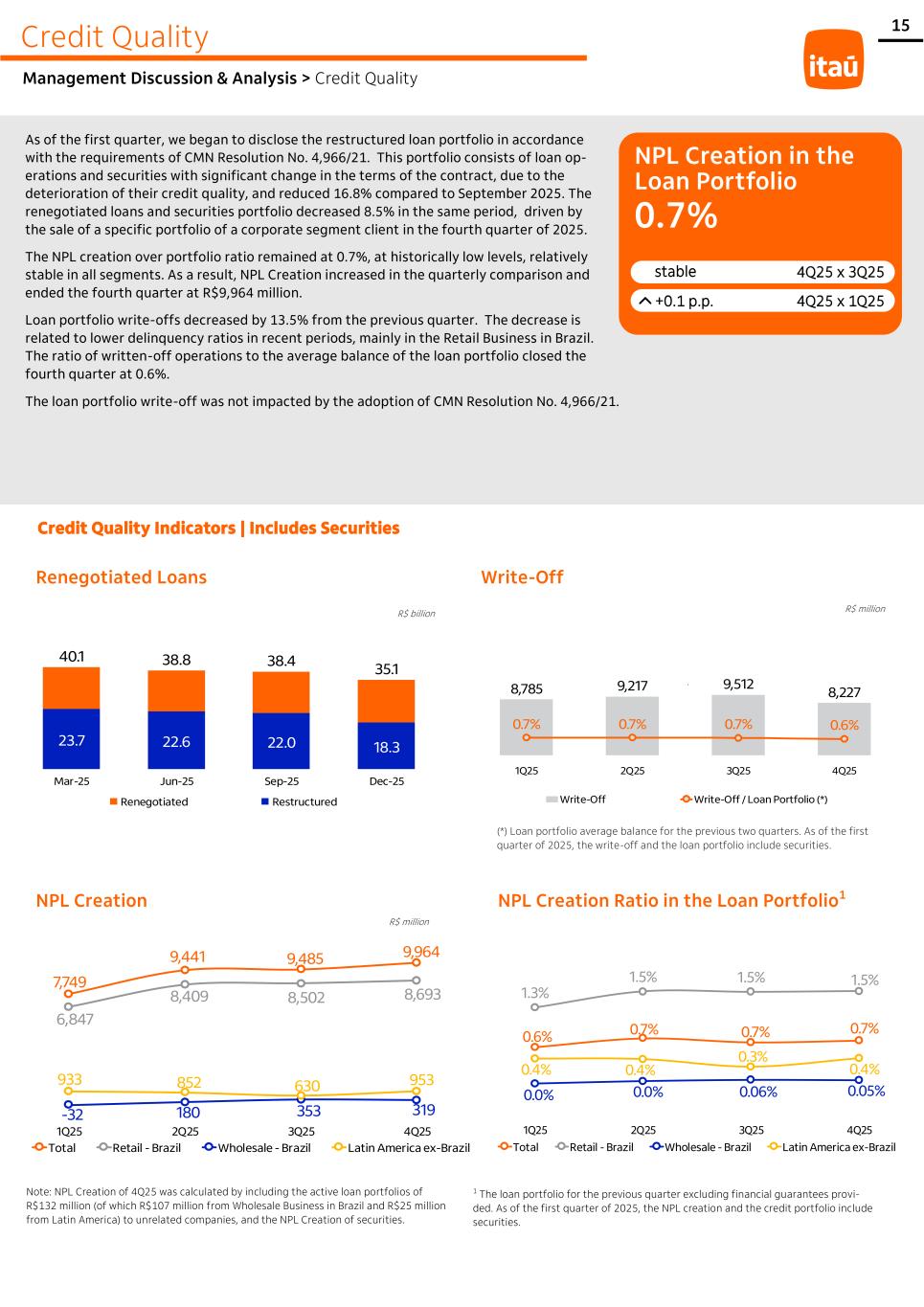 15 8,785 9,217 9,512 8,227 0.7% 0.7% 0.7% 0.6% 1Q25 2Q25 3Q25 4Q25 Write-Off Write-Off / Loan Portfolio (*) ' ' Credit Quality Management Discussion & Analysis > Credit Quality As of the first quarter, we began to disclose the restructured loan portfolio in accordance with the requirements of CMN Resolution No. 4,966/21. This portfolio consists of loan op- erations and securities with significant change in the terms of the contract, due to the deterioration of their credit quality, and reduced 16.8% compared to September 2025. The renegotiated loans and securities portfolio decreased 8.5% in the same period, driven by the sale of a specific portfolio of a corporate segment client in the fourth quarter of 2025. The NPL creation over portfolio ratio remained at 0.7%, at historically low levels, relatively stable in all segments. As a result, NPL Creation increased in the quarterly comparison and ended the fourth quarter at R$9,964 million. Loan portfolio write-offs decreased by 13.5% from the previous quarter. The decrease is related to lower delinquency ratios in recent periods, mainly in the Retail Business in Brazil. The ratio of written-off operations to the average balance of the loan portfolio closed the fourth quarter at 0.6%. The loan portfolio write-off was not impacted by the adoption of CMN Resolution No. 4,966/21. NPL Creation 0.6% 0.7% 0.7% 0.7% 1.3% 1.5% 1.5% 1.5% 0.0% 0.0% 0.06% 0.05% 0.4% 0.4% 0.3% 0.4% 1Q25 2Q25 3Q25 4Q25 Total Retail - Brazil Wholesale - Brazil Latin America ex-Brazil NPL Creation Ratio in the Loan Portfolio1 Renegotiated Loans Write-Off 1 The loan portfolio for the previous quarter excluding financial guarantees provi- ded. As of the first quarter of 2025, the NPL creation and the credit portfolio include securities. R$ million R$ million R$ billion (*) Loan portfolio average balance for the previous two quarters. As of the first quarter of 2025, the write-off and the loan portfolio include securities. Note: NPL Creation of 4Q25 was calculated by including the active loan portfolios of R$132 million (of which R$107 million from Wholesale Business in Brazil and R$25 million from Latin America) to unrelated companies, and the NPL Creation of securities. +0.1 p.p. 4Q25 x 1Q25 0.7% NPL Creation in the Loan Portfolio 4Q25 x 3Q25 stable 40.1 38.8 38.4 35.1 23.7 22.6 22.0 18.3 Mar-25 Jun-25 Sep-25 Dec-25 Renegotiated Restructured Credit Quality Indicators | Includes Securities 7,749 9,441 9,485 9,964 6,847 8,409 8,502 8,693 -32 180 353 319 933 852 630 953 1Q25 2Q25 3Q25 4Q25 Total Retail - Brazil Wholesale - Brazil Latin America ex-Brazil