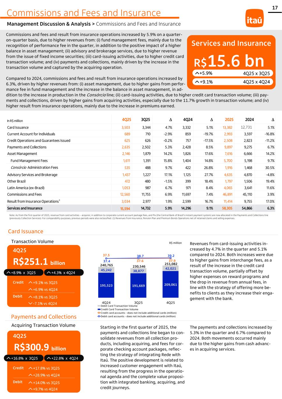 17 Commissions and Fees and Insurance Management Discussion & Analysis > Commissions and Fees and Insurance Commissions and fees and result from insurance operations increased by 5.9% on a quarter- on-quarter basis, due to higher revenues from: (i) fund management fees, mainly due to the recognition of performance fee in the quarter, in addition to the positive impact of a higher balance in asset management; (ii) advisory and brokerage services, due to higher revenue from the issue of fixed income securities; (iii) card-issuing activities, due to higher credit card transaction volume; and (iv) payments and collections, mainly driven by the increase in the transaction volume and captured by the acquiring operation. Compared to 2024, commissions and fees and result from insurance operations increased by 6.3%, driven by higher revenues from: (i) asset management, due to higher gains from perfor- mance fee in fund management and the increase in the balance in asset management, in ad- dition to the increase in production in the Consórcio line; (ii) card-issuing activities, due to higher credit card transaction volume; (iii) pay- ments and collections, driven by higher gains from acquiring activities, especially due to the 11.7% growth in transaction volume; and (iv) higher result from insurance operations, mainly due to the increase in premiums earned. Services and Insurance R$15.6 bn +5.9% +9.1% 4Q25 x 3Q25 4Q25 x 4Q24 Card Issuance Transaction Volume R$ million 4Q25 R$251.1 billion +8.9% x 3Q25 +4.3% x 4Q24 Credit +9.1% vs 3Q25 +6.9% vs 4Q24 Debit +8.1% vs 3Q25 -7.1% vs 4Q24 Payments and Collections 195,523 191,669 209,061 45,242 38,877 42,021 240,765 230,546 251,082 37.5 37.6 37.937.4 38.7 39.2 4Q24 3Q25 4Q25 Debit Card Transaction Volume Credit Card Transaction Volume Credit card accounts - does not include additional cards (million) Debit card accounts - does not include additional cards (million) Revenues from card-issuing activities in- creased by 4.7% in the quarter and 5.1% compared to 2024. Both increases were due to higher gains from interchange fees, as a result of the increase in the credit card transaction volume, partially offset by higher expenses on reward programs and the drop in revenue from annual fees, in line with the strategy of offering more be- nefits to clients as they increase their enga- gement with the bank. Acquiring Transaction Volume 4Q25 R$300.9 billion +16.8% x 3Q25 +22.8% x 4Q24 Credit +17.8% vs 3Q25 +28.9% vs 4Q24 Debit +14.0% vs 3Q25 +9.7% vs 4Q24 Note: As from the first quarter of 2025, revenue from card activities – acquirer, in addition to corporate current account package fees, and Pix (the Central Bank of Brazil's instant payment system) are now allocated in the Payments and Collections line (previously Collection Services). For comparability purposes, previous periods were also reclassified. (1) Revenues from Insurance, Pension Plan and Premium Bonds Operations net of retained claims and selling expenses. Starting in the first quarter of 2025, the payments and collections line began to con- solidate revenues from all collection pro- ducts, including acquiring, and fees for cor- porate checking account packages, reflec- ting the strategy of integrating Rede with Itaú. The positive development is related to increased customer engagement with Itaú, resulting from the progress in the operatio- nal agenda and the complete value proposi- tion with integrated banking, acquiring, and credit journeys. The payments and collections increased by 5.3% in the quarter and 6.7% compared to 2024. Both movements occurred mainly due to the higher gains from cash advanc- es in acquiring services. In R$ million 4Q25 3Q25 D 4Q24 D 2025 2024 D Card Issuance 3,503 3,344 4.7% 3,332 5.1% 13,382 12,731 5.1% Current Account for Individuals 689 710 -2.9% 859 -19.7% 2,993 3,597 -16.8% Credit Operations and Guarantees Issued 625 626 -0.2% 757 -17.5% 2,508 2,823 -11.2% Payments and Collections 2,635 2,502 5.3% 2,428 8.5% 9,897 9,275 6.7% Asset Management 2,146 1,879 14.2% 1,826 17.6% 7,616 6,666 14.2% Fund Management Fees 1,611 1,391 15.8% 1,404 14.8% 5,700 5,198 9.7% Consórcio Administration Fees 535 488 9.7% 422 26.8% 1,916 1,468 30.5% Advisory Services and Brokerage 1,437 1,227 17.1% 1,125 27.7% 4,635 4,870 -4.8% Other Brazil 472 480 -1.5% 399 18.4% 1,797 1,506 19.4% Latin America (ex-Brazil) 1,053 987 6.7% 971 8.4% 4,065 3,641 11.6% Commissions and Fees 12,560 11,755 6.9% 11,697 7.4% 46,891 45,110 3.9% Result from Insurance Operations¹ 3,034 2,977 1.9% 2,599 16.7% 11,414 9,755 17.0% Services and Insurance 15,594 14,732 5.9% 14,296 9.1% 58,305 54,866 6.3%