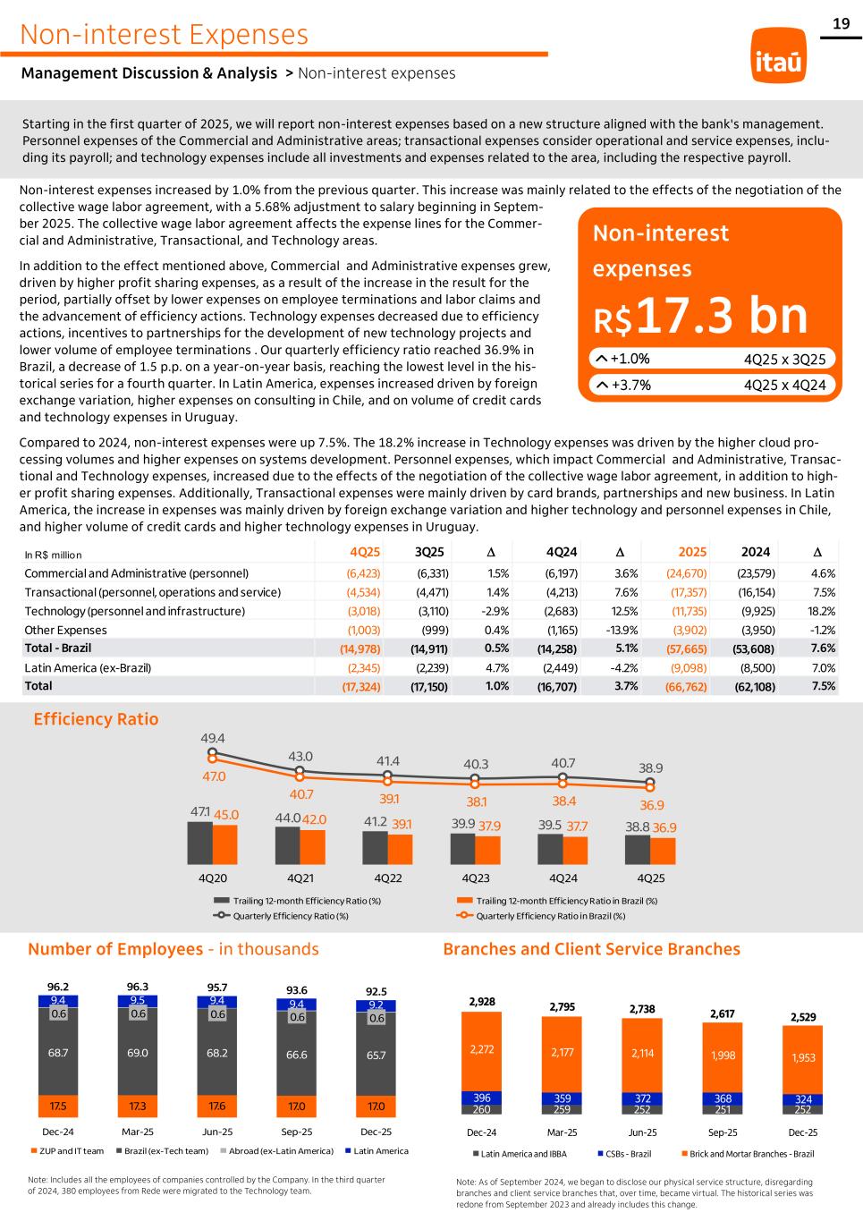 19 In R$ million 4Q25 3Q25 D 4Q24 D 2025 2024 D Commercial and Administrative (personnel) (6,423) (6,331) 1.5% (6,197) 3.6% (24,670) (23,579) 4.6% Transactional (personnel, operations and service) (4,534) (4,471) 1.4% (4,213) 7.6% (17,357) (16,154) 7.5% Technology (personnel and infrastructure) (3,018) (3,110) -2.9% (2,683) 12.5% (11,735) (9,925) 18.2% Other Expenses (1,003) (999) 0.4% (1,165) -13.9% (3,902) (3,950) -1.2% Total - Brazil (14,978) (14,911) 0.5% (14,258) 5.1% (57,665) (53,608) 7.6% Latin America (ex-Brazil) (2,345) (2,239) 4.7% (2,449) -4.2% (9,098) (8,500) 7.0% Total (17,324) (17,150) 1.0% (16,707) 3.7% (66,762) (62,108) 7.5% 17.5 17.3 17.6 17.0 17.0 68.7 69.0 68.2 66.6 65.7 0.6 0.6 0.6 0.6 0.6 9.4 9.5 9.4 9.4 9.2 96.2 96.3 95.7 93.6 92.5 Dec-24 Mar-25 Jun-25 Sep-25 Dec-25 ZUP and IT team Brazil (ex-Tech team) Abroad (ex-Latin America) Latin America Non-interest Expenses Management Discussion & Analysis > Non-interest expenses Non-interest expenses increased by 1.0% from the previous quarter. This increase was mainly related to the effects of the negotiation of the collective wage labor agreement, with a 5.68% adjustment to salary beginning in Septem- ber 2025. The collective wage labor agreement affects the expense lines for the Commer- cial and Administrative, Transactional, and Technology areas. In addition to the effect mentioned above, Commercial and Administrative expenses grew, driven by higher profit sharing expenses, as a result of the increase in the result for the period, partially offset by lower expenses on employee terminations and labor claims and the advancement of efficiency actions. Technology expenses decreased due to efficiency actions, incentives to partnerships for the development of new technology projects and lower volume of employee terminations . Our quarterly efficiency ratio reached 36.9% in Brazil, a decrease of 1.5 p.p. on a year-on-year basis, reaching the lowest level in the his- torical series for a fourth quarter. In Latin America, expenses increased driven by foreign exchange variation, higher expenses on consulting in Chile, and on volume of credit cards and technology expenses in Uruguay. Compared to 2024, non-interest expenses were up 7.5%. The 18.2% increase in Technology expenses was driven by the higher cloud pro- cessing volumes and higher expenses on systems development. Personnel expenses, which impact Commercial and Administrative, Transac- tional and Technology expenses, increased due to the effects of the negotiation of the collective wage labor agreement, in addition to high- er profit sharing expenses. Additionally, Transactional expenses were mainly driven by card brands, partnerships and new business. In Latin America, the increase in expenses was mainly driven by foreign exchange variation and higher technology and personnel expenses in Chile, and higher volume of credit cards and higher technology expenses in Uruguay. R$17.3 bn Non-interest expenses +1.0% +3.7% 4Q25 x 3Q25 4Q25 x 4Q24 Number of Employees - in thousands Note: Includes all the employees of companies controlled by the Company. In the third quarter of 2024, 380 employees from Rede were migrated to the Technology team. Efficiency Ratio Branches and Client Service Branches Starting in the first quarter of 2025, we will report non-interest expenses based on a new structure aligned with the bank's management. Personnel expenses of the Commercial and Administrative areas; transactional expenses consider operational and service expenses, inclu- ding its payroll; and technology expenses include all investments and expenses related to the area, including the respective payroll. 47.1 44.0 41.2 39.9 39.5 38.8 45.0 42.0 39.1 37.9 37.7 36.9 49.4 43.0 41.4 40.3 40.7 38.9 47.0 40.7 39.1 38.1 38.4 36.9 4Q20 4Q21 4Q22 4Q23 4Q24 4Q25 Trailing 12-month Efficiency Ratio (%) Trailing 12-month Efficiency Ratio in Brazil (%) Quarterly Efficiency Ratio (%) Quarterly Efficiency Ratio in Brazil (%) Note: As of September 2024, we began to disclose our physical service structure, disregarding branches and client service branches that, over time, became virtual. The historical series was redone from September 2023 and already includes this change. 260 259 252 251 252 396 359 372 368 324 2,272 2,177 2,114 1,998 1,953 2,928 2,795 2,738 2,617 2,529 Dec-24 Mar-25 Jun-25 Sep-25 Dec-25 Latin America and IBBA CSBs - Brazil Brick and Mortar Branches - Brazil