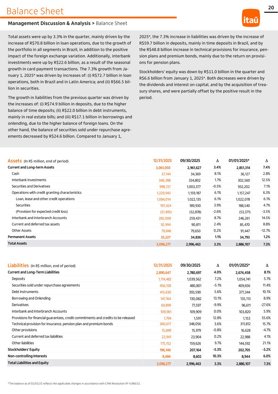 20 Balance Sheet Management Discussion & Analysis > Balance Sheet Total assets were up by 3.3% in the quarter, mainly driven by the increase of R$70.8 billion in loan operations, due to the growth of the portfolio in all segments in Brazil, in addition to the positive impact of the foreign exchange variation. Additionally, interbank investments were up by R$22.6 billion, as a result of the seasonal growth in card payment transactions. The 7.3% growth from Ja- nuary 1, 2025* was driven by increases of: (i) R$72.7 billion in loan operations, both in Brazil and in Latin America; and (ii) R$66.5 bil- lion in securities. The growth in liabilities from the previous quarter was driven by the increases of: (i) R$74.9 billion in deposits, due to the higher balance of time deposits; (ii) R$22.0 billion in debt instruments, mainly in real estate bills; and (iii) R$17.1 billion in borrowings and onlending, due to the higher balance of foreign loans. On the other hand, the balance of securities sold under repurchase agre- ements decreased by R$24.6 billion. Compared to January 1, 2025*, the 7.3% increase in liabilities was driven by the increase of R$59.7 billion in deposits, mainly in time deposits in Brazil, and by the R$48.8 billion increase in technical provisions for insurance, pen- sion plans and premium bonds, mainly due to the return on provisi- ons for pension plans. Stockholders' equity was down by R$11.0 billion in the quarter and R$6.6 billion from January 1, 2025*. Both decreases were driven by the dividends and interest on capital, and by the acquisition of trea- sury shares, and were partially offset by the positive result in the period. *The balance as of 01/01/25 reflects the applicable changes in accordance with CMN Resolution Nº 4,966/21. Assets (In R$ million, end of period) 12/31/2025 09/30/2025 D' 01/01/2025* D' Current and Long-term Assets 3,061,050 2,961,627 3.4% 2,851,314 7.4% Cash 37,144 34,369 8.1% 36,127 2.8% Interbank Investments 340,388 334,802 1.7% 302,560 12.5% Securities and Derivatives 998,727 1,003,377 -0.5% 932,202 7.1% Operations with credit granting characteristics 1,229,943 1,159,187 6.1% 1,157,247 6.3% Loan, lease and other credit operations 1,084,014 1,022,135 6.1% 1,022,078 6.1% Securities 197,424 189,930 3.9% 188,540 4.7% (Provision for expected credit loss) (51,495) (52,878) -2.6% (53,371) -3.5% Interbank and Interbranch Accounts 282,008 259,431 8.7% 246,261 14.5% Current and deferred tax assets 92,994 90,811 2.4% 85,470 8.8% Other Assets 79,846 79,650 0.2% 91,447 -12.7% Permanent Assets 35,227 34,836 1.1% 34,793 1.2% Total Assets 3,096,277 2,996,463 3.3% 2,886,107 7.3% Liabilities (In R$ million, end of period) 12/31/2025 09/30/2025 D' 01/01/2025* D' Current and Long-Term Liabilities 2,890,647 2,780,697 4.0% 2,674,458 8.1% Deposits 1,114,482 1,039,562 7.2% 1,054,741 5.7% Securities sold under repurchase agreements 456,158 480,801 -5.1% 409,656 11.4% Debt instruments 415,630 393,590 5.6% 377,344 10.1% Borrowing and Onlending 147,164 130,082 13.1% 135,113 8.9% Derivatives 69,899 77,597 -9.9% 96,611 -27.6% Interbank and Interbranch Accounts 109,961 109,909 0.0% 103,820 5.9% Provisions for financial guarantees, credit commitments and credits to be released 1,794 1,591 12.8% 1,153 55.6% Technical provision for insurance, pension plan and premium bonds 360,617 348,056 3.6% 311,812 15.7% Other provisions 15,849 15,979 -0.8% 16,628 -4.7% Current and deferred tax liabilities 23,941 23,904 0.2% 22,988 4.1% Other liabilities 175,152 159,626 9.7% 144,592 21.1% Stockholders' Equity 196,146 207,164 -5.3% 202,705 -3.2% Non-controlling Interests 9,484 8,602 10.3% 8,944 6.0% Total Liabilities and Equity 3,096,277 2,996,463 3.3% 2,886,107 7.3%