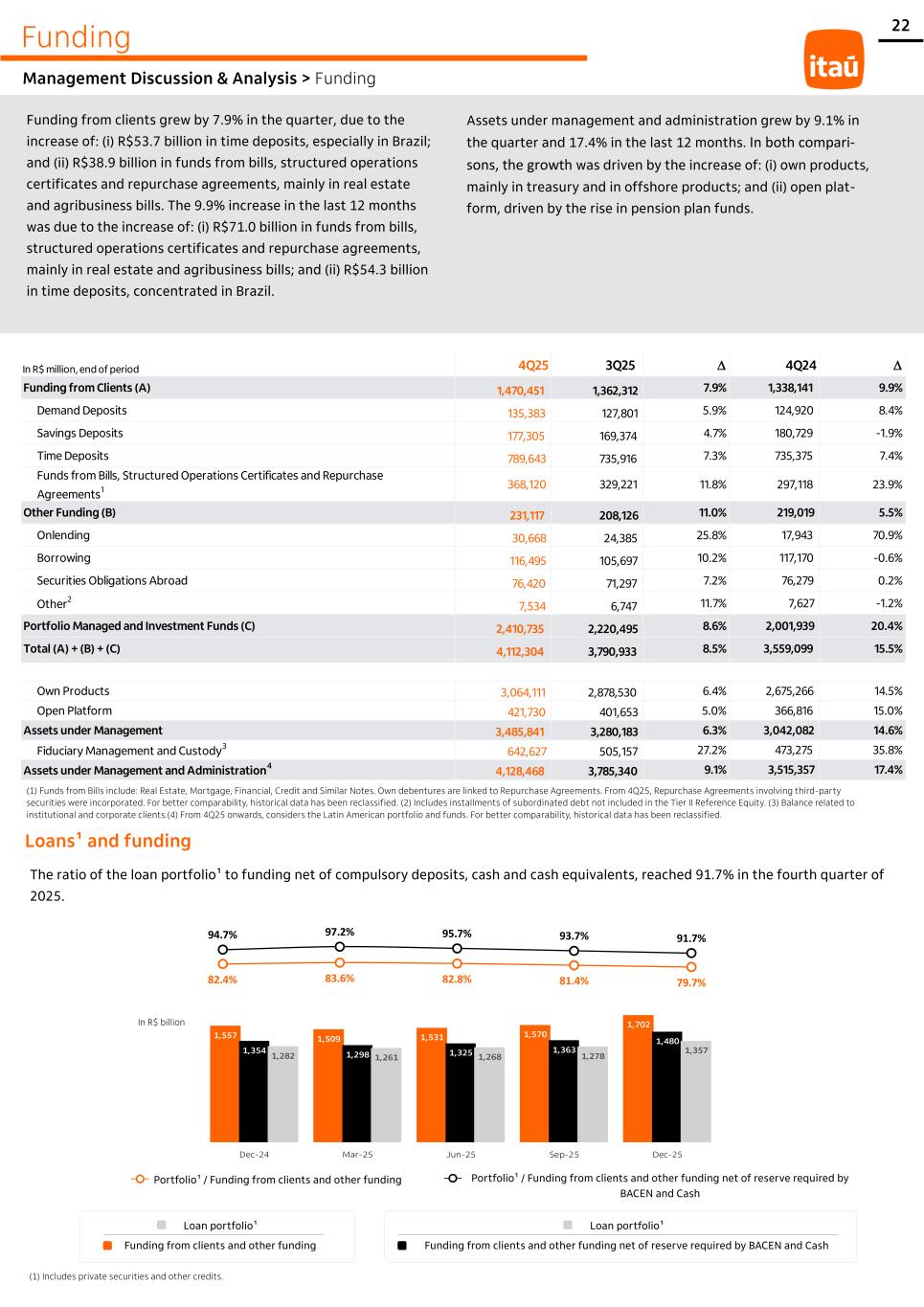 22 1,557 1,509 1,531 1,570 1,702 1,354 1,298 1,325 1,363 1,480 1,282 1,261 1,268 1,278 1,357 Dec-24 Mar-25 Jun-25 Sep-25 Dec-25 94.7% 97.2% 95.7% 93.7% 91.7% 82.4% 83.6% 82.8% 81.4% 79.7% Funding Management Discussion & Analysis > Funding Funding from clients grew by 7.9% in the quarter, due to the increase of: (i) R$53.7 billion in time deposits, especially in Brazil; and (ii) R$38.9 billion in funds from bills, structured operations certificates and repurchase agreements, mainly in real estate and agribusiness bills. The 9.9% increase in the last 12 months was due to the increase of: (i) R$71.0 billion in funds from bills, structured operations certificates and repurchase agreements, mainly in real estate and agribusiness bills; and (ii) R$54.3 billion in time deposits, concentrated in Brazil. Assets under management and administration grew by 9.1% in the quarter and 17.4% in the last 12 months. In both compari- sons, the growth was driven by the increase of: (i) own products, mainly in treasury and in offshore products; and (ii) open plat- form, driven by the rise in pension plan funds. Portfolio¹ / Funding from clients and other funding (1) Funds from Bills include: Real Estate, Mortgage, Financial, Credit and Similar Notes. Own debentures are linked to Repurchase Agreements. From 4Q25, Repurchase Agreements involving third-party securities were incorporated. For better comparability, historical data has been reclassified. (2) Includes installments of subordinated debt not included in the Tier II Reference Equity. (3) Balance related to institutional and corporate clients.(4) From 4Q25 onwards, considers the Latin American portfolio and funds. For better comparability, historical data has been reclassified. Loans¹ and funding The ratio of the loan portfolio¹ to funding net of compulsory deposits, cash and cash equivalents, reached 91.7% in the fourth quarter of 2025. Portfolio¹ / Funding from clients and other funding net of reserve required by BACEN and Cash Loan portfolio¹ Funding from clients and other funding net of reserve required by BACEN and Cash (1) Includes private securities and other credits. Loan portfolio¹ Funding from clients and other funding In R$ billion In R$ million, end of period 4Q25 3Q25 D 4Q24 D Funding from Clients (A) 1,470,451 1,362,312 7.9% 1,338,141 9.9% Demand Deposits 135,383 127,801 5.9% 124,920 8.4% Savings Deposits 177,305 169,374 4.7% 180,729 -1.9% Time Deposits 789,643 735,916 7.3% 735,375 7.4% Funds from Bills, Structured Operations Certificates and Repurchase Agreements1 368,120 329,221 11.8% 297,118 23.9% Other Funding (B) 231,117 208,126 11.0% 219,019 5.5% Onlending 30,668 24,385 25.8% 17,943 70.9% Borrowing 116,495 105,697 10.2% 117,170 -0.6% Securities Obligations Abroad 76,420 71,297 7.2% 76,279 0.2% Other2 7,534 6,747 11.7% 7,627 -1.2% Portfolio Managed and Investment Funds (C) 2,410,735 2,220,495 8.6% 2,001,939 20.4% Total (A) + (B) + (C) 4,112,304 3,790,933 8.5% 3,559,099 15.5% Own Products 3,064,111 2,878,530 6.4% 2,675,266 14.5% Open Platform 421,730 401,653 5.0% 366,816 15.0% Assets under Management 3,485,841 3,280,183 6.3% 3,042,082 14.6% Fiduciary Management and Custody3 642,627 505,157 27.2% 473,275 35.8% Assets under Management and Administration 4 4,128,468 3,785,340 9.1% 3,515,357 17.4%