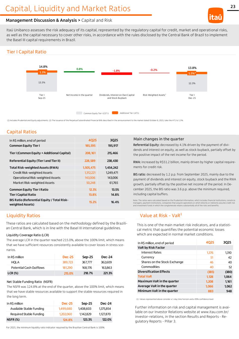 23 In R$ million Dec-25 Sep-25 Dec-24 HQLA 389,723 367,777 362,609 Potential Cash Outflows 181,290 168,176 163,863 LCR (%) 215.0% 218.7% 221.3% 13.5% 12.3% 1.3% 0.8% -1.8% -0.2% 1.5%² 14.8% 13.8% Tier I Sep-25 Net Income in the quarter Dividends, Interest on Own Capital and Stock Buyback Risk-Weighted Assets¹ Tier I Dec-25 Capital, Liquidity and Market Ratios Itaú Unibanco assesses the risk adequacy of its capital, represented by the regulatory capital for credit, market and operational risks, as well as the capital necessary to cover other risks, in accordance with the rules disclosed by the Central Bank of Brazil to implement the Basel III capital requirements in Brazil. R$ milhões R$217, 7 bilhões Tier I Capital Ratio Common Equity Tier I (CET I) Additional Tier I (AT1) (1) Includes Prudential and Equity adjustments. (2) The issuance of the Perpetual Subordinated Financial Bills described in the announcement to the market dated October 8, 2025, take the AT1 to 1.5%. Capital Ratios Main changes in the quarter Note: The ratios were calculated based on the Prudential information, which includes financial institutions, consórcio managers, payment institutions, companies that acquire operations or which directly or indirectly assume credit risk and investment funds in which the conglomerate retains substantially all of the risks and benefits. Referential Equity: decreased by 4.1% driven by the payment of divi- dends and interest on equity, as well as stock buyback, partially offset by the positive impact of the net income for the period. RWA: increased by R$51.2 billion, mainly driven by higher capital require- ments for credit risk. BIS ratio: decreased by 1.2 p.p. from September 2025, mainly due to the payment of dividends and interest on equity, stock buyback and the RWA growth, partially offset by the positive net income of the period. In De- cember 2025, the BIS ratio was 3.6 p.p. above the minimum required, including capital buffers. Liquidity Ratios These ratios are calculated based on the methodology defined by the Brazili- an Central Bank, which is in line with the Basel III international guidelines. Liquidity Coverage Ratio (LCR) The average LCR in the quarter reached 215.0%, above the 100% limit, which means that we have sufficient resources consistently available to cover losses in stress sce- narios. Net Stable Funding Ratio (NSFR) The NSFR was 124.8% at the end of the quarter, above the 100% limit, which means that we have stable resources available to support the stable resources required in the long term. For 2025, the minimum liquidity ratio indicator required by the Brazilian Central Bank is 100%. Value at Risk - VaR1 This is one of the main market risk indicators, and a statisti- cal metric that quantifies the potential economic losses which are expected in normal market conditions. (1) Values represented above consider a 1-day time horizon and a 99% confidence level. Further information on risk and capital management is avai- lable on our Investor Relations website at www.itau.com.br/ investor-relations, in the section Results and Reports - Re- gulatory Reports - Pillar 3. Management Discussion & Analysis > Capital and Risk In R$ million, end of period 4Q25 3Q25 Common Equity Tier I 185,595 195,917 Tier I (Common Equity + Additional Capital) 208,161 215,466 Referential Equity (Tier I and Tier II) 228,589 238,430 Total Risk-weighted Assets (RWA) 1,505,475 1,454,242 Credit Risk-weighted Assets 1,312,221 1,249,471 Operational Risk-weighted Assets 143,006 143,006 Market Risk-weighted Assets 50,248 61,765 Common Equity Tier I Ratio 12.3% 13.5% Tier I Capital Ratio 13.8% 14.8% BIS Ratio (Referential Equity / Total Risk- weighted Assets) 15.2% 16.4% In R$ million, end of period 4Q25 3Q25 VaR by Risk Factor Interest Rates 1,376 1,310 Currency 51 42 Shares on the Stock Exchange 46 40 Commodities 40 52 Diversification Effects (385) (380) Total VaR 1,128 1,064 Maximum VaR in the quarter 1,208 1,161 Average VaR in the quarter 1,066 1,062 Minimum VaR in the quarter 883 948 In R$ million Dec-25 Sep-25 Dec-24 Available Stable Funding 1,499,680 1,408,603 1,375,854 Required Stable Funding 1,202,060 1,142,829 1,127,870 NSFR (%) 124.8% 123.3% 122.0%
