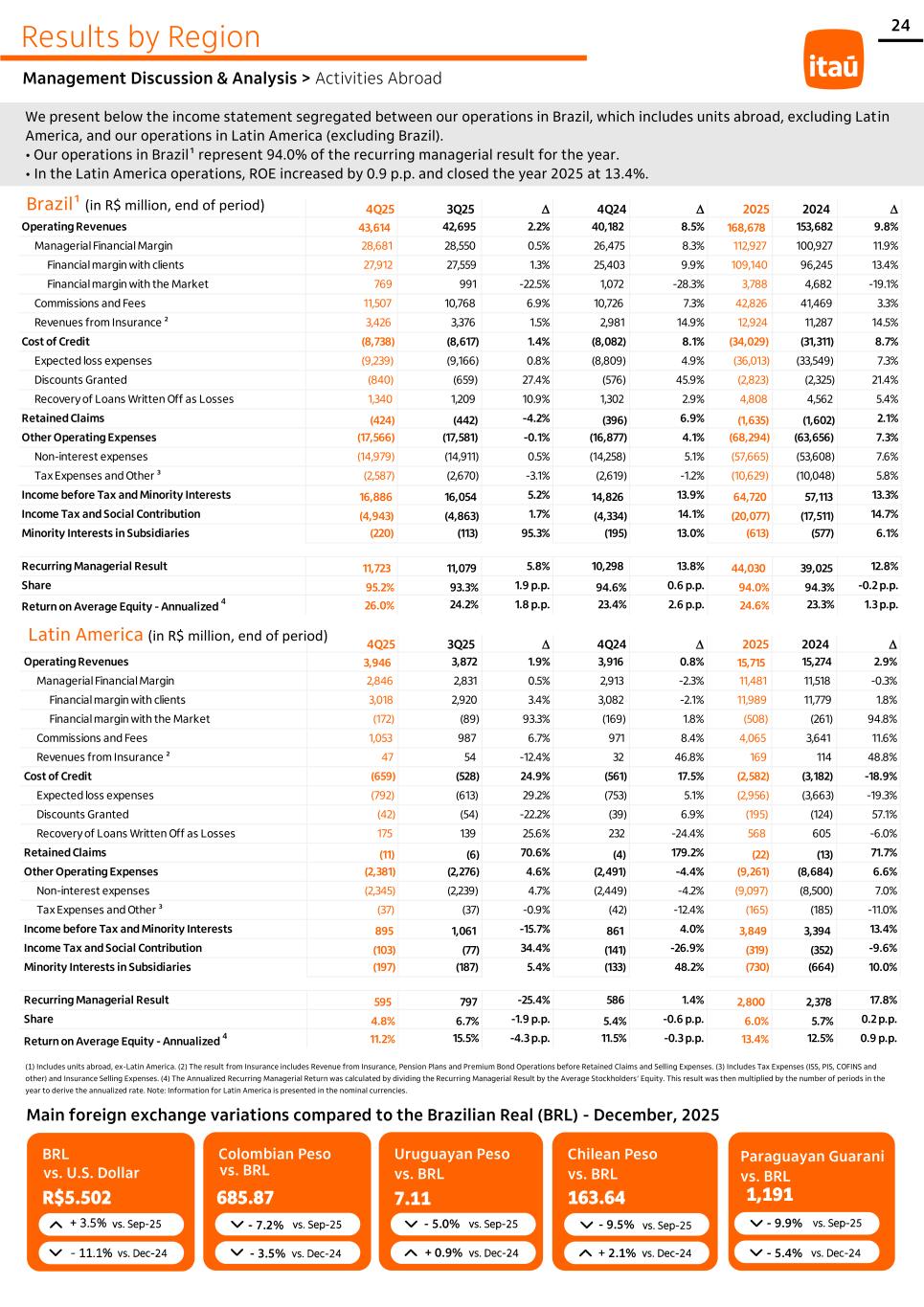 24 4Q25 3Q25 D 4Q24 D 2025 2024 D Operating Revenues 3,946 3,872 1.9% 3,916 0.8% 15,715 15,274 2.9% Managerial Financial Margin 2,846 2,831 0.5% 2,913 -2.3% 11,481 11,518 -0.3% Financial margin with clients 3,018 2,920 3.4% 3,082 -2.1% 11,989 11,779 1.8% Financial margin with the Market (172) (89) 93.3% (169) 1.8% (508) (261) 94.8% Commissions and Fees 1,053 987 6.7% 971 8.4% 4,065 3,641 11.6% Revenues from Insurance ² 47 54 -12.4% 32 46.8% 169 114 48.8% Cost of Credit (659) (528) 24.9% (561) 17.5% (2,582) (3,182) -18.9% Expected loss expenses (792) (613) 29.2% (753) 5.1% (2,956) (3,663) -19.3% Discounts Granted (42) (54) -22.2% (39) 6.9% (195) (124) 57.1% Recovery of Loans Written Off as Losses 175 139 25.6% 232 -24.4% 568 605 -6.0% Retained Claims (11) (6) 70.6% (4) 179.2% (22) (13) 71.7% Other Operating Expenses (2,381) (2,276) 4.6% (2,491) -4.4% (9,261) (8,684) 6.6% Non-interest expenses (2,345) (2,239) 4.7% (2,449) -4.2% (9,097) (8,500) 7.0% Tax Expenses and Other ³ (37) (37) -0.9% (42) -12.4% (165) (185) -11.0% Income before Tax and Minority Interests 895 1,061 -15.7% 861 4.0% 3,849 3,394 13.4% Income Tax and Social Contribution (103) (77) 34.4% (141) -26.9% (319) (352) -9.6% Minority Interests in Subsidiaries (197) (187) 5.4% (133) 48.2% (730) (664) 10.0% Recurring Managerial Result 595 797 -25.4% 586 1.4% 2,800 2,378 17.8% Share 4.8% 6.7% -1.9 p.p. 5.4% -0.6 p.p. 6.0% 5.7% 0.2 p.p. Return on Average Equity - Annualized 4 11.2% 15.5% -4.3 p.p. 11.5% -0.3 p.p. 13.4% 12.5% 0.9 p.p. 4Q25 3Q25 D 4Q24 D 2025 2024 D Operating Revenues 43,614 42,695 2.2% 40,182 8.5% 168,678 153,682 9.8% Managerial Financial Margin 28,681 28,550 0.5% 26,475 8.3% 112,927 100,927 11.9% Financial margin with clients 27,912 27,559 1.3% 25,403 9.9% 109,140 96,245 13.4% Financial margin with the Market 769 991 -22.5% 1,072 -28.3% 3,788 4,682 -19.1% Commissions and Fees 11,507 10,768 6.9% 10,726 7.3% 42,826 41,469 3.3% Revenues from Insurance ² 3,426 3,376 1.5% 2,981 14.9% 12,924 11,287 14.5% Cost of Credit (8,738) (8,617) 1.4% (8,082) 8.1% (34,029) (31,311) 8.7% Expected loss expenses (9,239) (9,166) 0.8% (8,809) 4.9% (36,013) (33,549) 7.3% Discounts Granted (840) (659) 27.4% (576) 45.9% (2,823) (2,325) 21.4% Recovery of Loans Written Off as Losses 1,340 1,209 10.9% 1,302 2.9% 4,808 4,562 5.4% Retained Claims (424) (442) -4.2% (396) 6.9% (1,635) (1,602) 2.1% Other Operating Expenses (17,566) (17,581) -0.1% (16,877) 4.1% (68,294) (63,656) 7.3% Non-interest expenses (14,979) (14,911) 0.5% (14,258) 5.1% (57,665) (53,608) 7.6% Tax Expenses and Other ³ (2,587) (2,670) -3.1% (2,619) -1.2% (10,629) (10,048) 5.8% Income before Tax and Minority Interests 16,886 16,054 5.2% 14,826 13.9% 64,720 57,113 13.3% Income Tax and Social Contribution (4,943) (4,863) 1.7% (4,334) 14.1% (20,077) (17,511) 14.7% Minority Interests in Subsidiaries (220) (113) 95.3% (195) 13.0% (613) (577) 6.1% Recurring Managerial Result 11,723 11,079 5.8% 10,298 13.8% 44,030 39,025 12.8% Share 95.2% 93.3% 1.9 p.p. 94.6% 0.6 p.p. 94.0% 94.3% -0.2 p.p. Return on Average Equity - Annualized 4 26.0% 24.2% 1.8 p.p. 23.4% 2.6 p.p. 24.6% 23.3% 1.3 p.p. Results by Region We present below the income statement segregated between our operations in Brazil, which includes units abroad, excluding Latin America, and our operations in Latin America (excluding Brazil). • Our operations in Brazil¹ represent 94.0% of the recurring managerial result for the year. • In the Latin America operations, ROE increased by 0.9 p.p. and closed the year 2025 at 13.4%. Brazil¹ (in R$ million, end of period) Latin America (in R$ million, end of period) Main foreign exchange variations compared to the Brazilian Real (BRL) - December, 2025 (1) Includes units abroad, ex-Latin America. (2) The result from Insurance includes Revenue from Insurance, Pension Plans and Premium Bond Operations before Retained Claims and Selling Expenses. (3) Includes Tax Expenses (ISS, PIS, COFINS and other) and Insurance Selling Expenses. (4) The Annualized Recurring Managerial Return was calculated by dividing the Recurring Managerial Result by the Average Stockholders’ Equity. This result was then multiplied by the number of periods in the year to derive the annualized rate. Note: Information for Latin America is presented in the nominal currencies. BRL R$5.502 + 3.5% - 11.1% vs. Sep-25 vs. Dec-24 Colombian Peso 685.87 vs. Sep-25 - 7.2% vs. Dec-24 - 3.5% Uruguayan Peso vs. BRL 7.11 vs. Sep-25 - 5.0% vs. Dec-24 + 0.9% Chilean Peso vs. BRL 163.64 vs. Sep-25 - 9.5% vs. Dec-24 + 2.1% Paraguayan Guarani vs. BRL 1,191 vs. Sep-25 - 9.9% vs. Dec-24 - 5.4% vs. U.S. Dollar vs. BRL Management Discussion & Analysis > Activities Abroad
