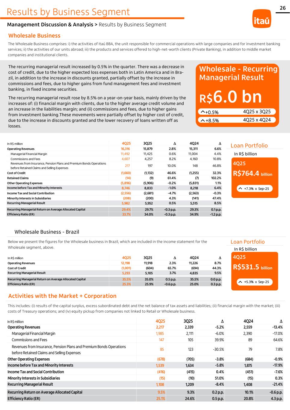 26 The recurring managerial result increased by 0.5% in the quarter. There was a decrease in cost of credit, due to the higher expected loss expenses both in Latin America and in Bra- zil, in addition to the increase in discounts granted, partially offset by the increase in commissions and fees, due to higher gains from fund management fees and investment banking, in fixed income securities. The recurring managerial result rose by 8.5% on a year-on-year basis, mainly driven by the increases of: (i) financial margin with clients, due to the higher average credit volume and an increase in the liabilities margin; and (ii) commissions and fees, due to higher gains from investment banking.These movements were partially offset by higher cost of credit, due to the increase in discounts granted and the lower recovery of loans written off as losses. Wholesale - Recurring Managerial Result R$6.0 bn +0.5% +8.5% 4Q25 x 3Q25 4Q25 x 4Q24 Wholesale Business The Wholesale Business comprises: i) the activities of Itaú BBA, the unit responsible for commercial operations with large companies and for investment banking services; ii) the activities of our units abroad; iii) the products and services offered to high-net-worth clients (Private Banking), in addition to middle market companies and institutional clients. Activities with the Market + Corporation This includes: (i) results of the capital surplus, excess subordinated debt and the net balance of tax assets and liabilities; (ii) financial margin with the market; (iii) costs of Treasury operations; and (iv) equity pickup from companies not linked to Retail or Wholesale business. Results by Business Segment Management Discussion & Analysis > Results by Business Segment In R$ million 4Q25 3Q25 D 4Q24 D Operating Revenues 2,217 2,339 -5.2% 2,559 -13.4% Managerial Financial Margin 1,985 2,111 -6.0% 2,390 -17.0% Commissions and Fees 147 105 39.9% 89 64.6% Revenues from Insurance, Pension Plans and Premium Bonds Operations before Retained Claims and Selling Expenses 85 123 -30.5% 79 7.8% Other Operating Expenses (678) (705) -3.8% (684) -0.9% Income before Tax and Minority Interests 1,539 1,634 -5.8% 1,875 -17.9% Income Tax and Social Contribution (416) (415) 0.4% (451) -7.6% Minority Interests in Subsidiaries (15) (10) 51.0% (15) 0.3% Recurring Managerial Result 1,108 1,209 -8.4% 1,408 -21.4% Recurring Return on Average Allocated Capital 9.5% 9.3% 0.2 p.p. 10.1% -0.6 p.p. Efficiency Ratio (ER) 25.1% 24.6% 0.5 p.p. 20.8% 4.3 p.p. In R$ million 4Q25 3Q25 D 4Q24 D Operating Revenues 16,316 15,879 2.8% 15,311 6.6% Managerial Financial Margin 11,492 11,425 0.6% 11,004 4.4% Commissions and Fees 4,607 4,257 8.2% 4,160 10.8% Revenues from Insurance, Pension Plans and Premium Bonds Operations before Retained Claims and Selling Expenses 217 197 10.0% 148 46.8% Cost of Credit (1,660) (1,132) 46.6% (1,255) 32.3% Retained Claims (14) (9) 61.4% (7) 102.2% Other Operating Expenses (5,896) (5,906) -0.2% (5,831) 1.1% Income before Tax and Minority Interests 8,746 8,833 -1.0% 8,218 6.4% Income Tax and Social Contribution (2,556) (2,681) -4.7% (2,563) -0.3% Minority Interests in Subsidiaries (208) (200) 4.3% (141) 47.4% Recurring Managerial Result 5,982 5,952 0.5% 5,515 8.5% Recurring Managerial Return on Average Allocated Capital 29.4% 29.7% -0.3 p.p. 29.3% 0.1 p.p. Efficiency Ratio (ER) 33.7% 34.0% -0.3 p.p. 34.9% -1.2 p.p. Loan Portfolio In R$ billion 4Q25 R$764.4 billion +7.3% x Sep-25 Wholesale Business - Brazil In R$ million 4Q25 3Q25 D 4Q24 D Operating Revenues 12,198 11,918 2.3% 11,226 8.7% Cost of Credit (1,001) (604) 65.7% (694) 44.3% Recurring Managerial Result 5,293 5,105 3.7% 4,835 9.5%- - - - - Recurring Managerial Return on Average Allocated Capital 35.5% 35.0% 0.5 p.p. 35.5% 0.0 p.p. Efficiency Ratio (ER) 25.3% 25.9% -0.6 p.p. 25.0% 0.3 p.p. Loan Portfolio In R$ billion 4Q25 R$531.5 billion +5.3% x Sep-25 Below we present the figures for the Wholesale business in Brazil, which are included in the income statement for the Wholesale segment, above.