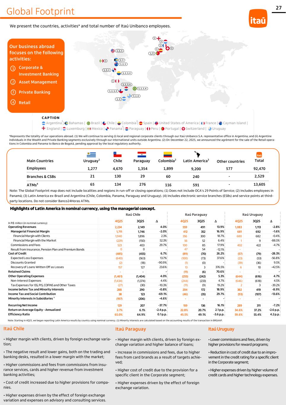 27 Global Footprint We present the countries, activities* and total number of Itaú Unibanco employees. Our business abroad focuses on the following activities: Corporate & Investment Banking 1 Asset Management Private Banking Retail 2 3 4 *Represents the totality of our operations abroad. (1) We will continue to serving (i) local and regional corporate clients through our Itaú Unibanco S.A. representative office in Argentina; and (ii) Argentine individuals in the Wealth and Private Banking segments exclusively through our international units outside Argentina. (2) On December 22, 2025, we announced the agrément for the sale of the Retail opera- tions in Colombia and Panama to Banco de Bogotá, pending approval by the local regulatory authority. Main Countries Employees Branches & CSBs ATMs4 Uruguay1 1,277 21 65 Chile 4,670 130 134 Paraguay 1,354 29 276 Colombia2 1,899 60 116 Latin America3 9,200 240 591 Other countries 577 - - Total 92,470 2,529 13,605 Note: Starting in 4Q25, we began reporting Latin America results by country using nominal currency. (1) Minority interests are calculated based on the accounting results of the transaction in BRGAAP. Itaú Uruguay • Lower commissions and fees, driven by higher provisions for reward programs; • Reduction in cost of credit due to an impro- vement in the credit rating for a specific client in the Corporate segment; • Higher expenses driven by higher volume of credit cards and higher technology expenses. Itaú Paraguay • Higher margin with clients, driven by foreign ex- change variation and higher balance of loans; • Increase in commissions and fees, due to higher fees from card brands as a result of targets achie- ved; • Higher cost of credit due to the provision for a specific client in the Corporate segment; • Higher expenses driven by the effect of foreign exchange variation. Itaú Chile • Higher margin with clients, driven by foreign exchange varia- tion; • The negative result and lower gains, both on the trading and banking desks, resulted in a lower margin with the market; • Higher commissions and fees from commissions from insu- rance services, cards and higher revenue from investment banking activities; • Cost of credit increased due to higher provisions for compa- nies. • Higher expenses driven by the effect of foreign exchange variation and expenses on advisory and consulting services. In R$ million (in nominal currency) 4Q25 3Q25 D 4Q25 3Q25 D 4Q25 3Q25 D Operating Revenues 2,234 2,149 4.0% 559 491 13.9% 1,083 1,113 -2.8% Managerial Financial Margin 1,711 1,746 -2.0% 412 352 16.9% 681 692 -1.6% Financial Margin with Clients 1,940 1,896 2.3% 356 300 18.7% 680 682 -0.4% Financial Margin with the Market (229) (150) 52.3% 56 52 6.4% 1 9 -88.5% Commissions and Fees 523 403 29.7% 100 85 17.9% 402 422 -4.7% Result from Insurance, Pension Plan and Premium Bonds 0 0 - 47 54 -12.1% - - - Cost of Credit (485) (455) 6.7% (89) (70) 26.2% (57) (79) -28.3% Expected Loss Expenses (640) (563) 13.7% (100) (73) 37.6% (23) (53) -56.8% Discounts Granted (2) (18) -90.9% (1) (0) - (39) (36) 9.5% Recovery of Loans Written Off as Losses 157 127 23.6% 13 3 376.5% 6 10 -42.5% Retained Claims - - - (11) (6) 70.6% - - - Other Operating Expenses (1,461) (1,404) 4.0% (255) (242) 5.3% (644) (616) 4.7% Non-Interest Expenses (1,434) (1,374) 4.4% (244) (233) 4.7% (646) (618) 4.5% Tax Expenses for ISS, PIS, COFINS and Other Taxes (27) (30) -10.3% (11) (9) 19.2% 2 3 -39.2% Income before Tax and Minority Interests 288 290 -0.8% 204 172 18.9% 382 419 -8.9% Income Tax and Social Contribution 38 123 -69.1% (46) (35) 29.7% (93) (107) -13.6% Minority Interests in Subsidiaries ¹ (197) (206) -4.6% - - - - - - Recurring Net Income 129 207 -37.7% 159 136 16.1% 289 311 -7.2% Return on Average Equity - Annualized 3.7% 6.1% -2.4 p.p. 22.8% 20.7% 2.1 p.p. 34.6% 37.2% -2.6 p.p. Efficiency Ratio 65.0% 64.9% 0.1 p.p. 45.5% 49.1% -3.6 p.p. 59.6% 55.4% 4.2 p.p. Itaú Chile Itaú Paraguay Itaú Uruguay Note: The Global Footprint map does not include localities and regions in run-off or closing operations; (1) Does not include OCA’s 29 Points of Service; (2) Includes employees in Panamá; (3) Latin America ex-Brazil and Argentina (Chile, Colombia, Panama, Paraguay and Uruguay). (4) Includes electronic service branches (ESBs) and service points at third- party locations. Do not consider Banco24Horas ATMs. Highlights of Latin America in nominal currency, using the managerial concept. 1 2 2