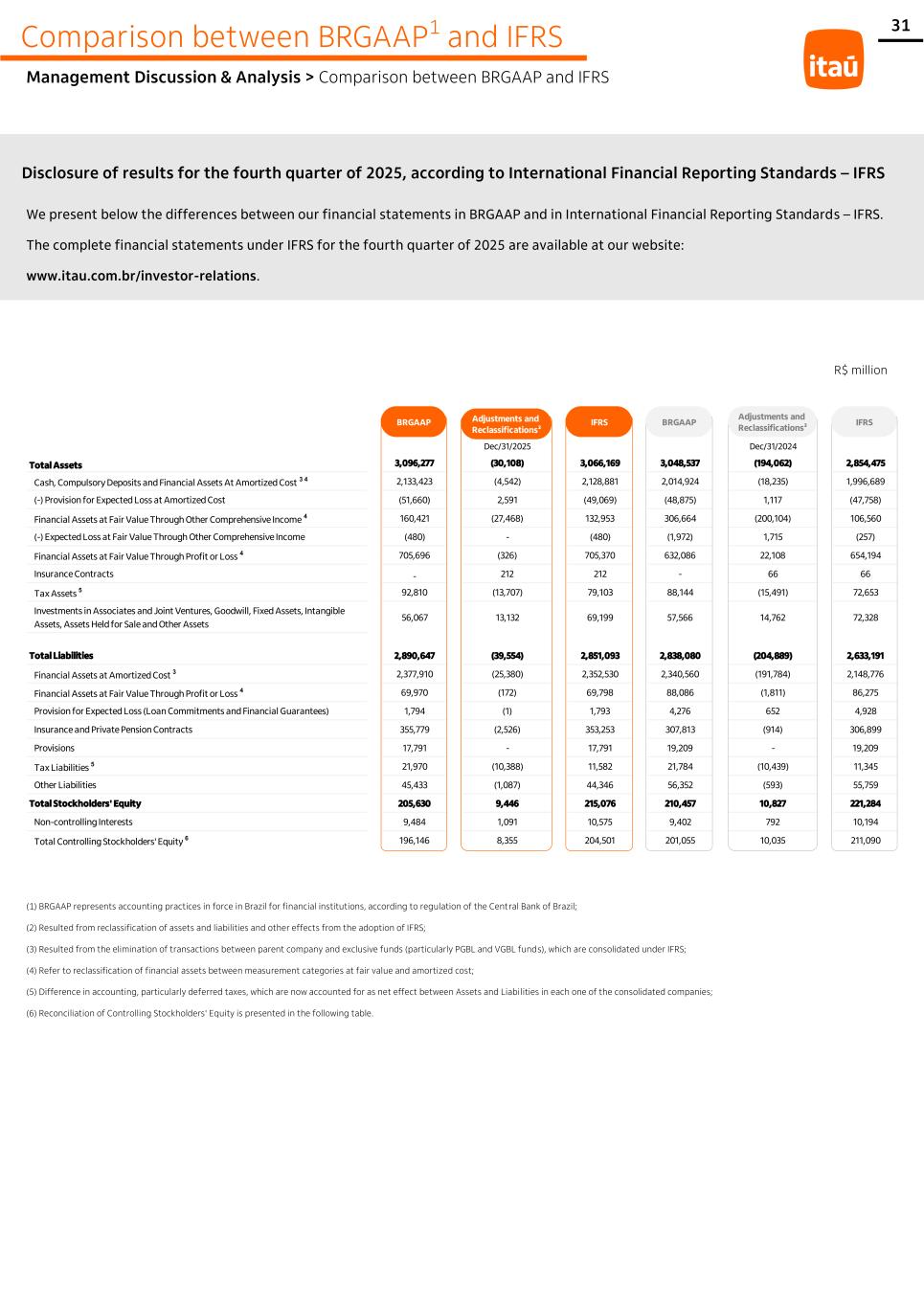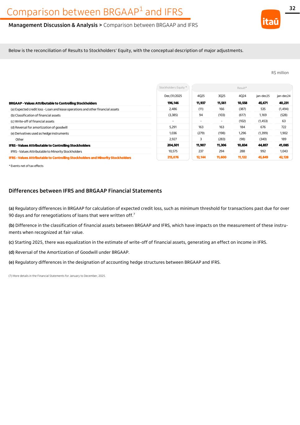 31 Comparison between BRGAAP1 and IFRS Management Discussion & Analysis > Comparison between BRGAAP and IFRS We present below the differences between our financial statements in BRGAAP and in International Financial Reporting Standards – IFRS. The complete financial statements under IFRS for the fourth quarter of 2025 are available at our website: www.itau.com.br/investor-relations. (1) BRGAAP represents accounting practices in force in Brazil for financial institutions, according to regulation of the Central Bank of Brazil; (2) Resulted from reclassification of assets and liabilities and other effects from the adoption of IFRS; (3) Resulted from the elimination of transactions between parent company and exclusive funds (particularly PGBL and VGBL funds), which are consolidated under IFRS; (4) Refer to reclassification of financial assets between measurement categories at fair value and amortized cost; (5) Difference in accounting, particularly deferred taxes, which are now accounted for as net effect between Assets and Liabilities in each one of the consolidated companies; (6) Reconciliation of Controlling Stockholders' Equity is presented in the following table. Disclosure of results for the fourth quarter of 2025, according to International Financial Reporting Standards – IFRS R$ million BRGAAP Adjustments and Reclassifications² IFRS BRGAAP Adjustments and Reclassifications² IFRS Dec/31/2025 Dec/31/2024 Total Assets 3,096,277 (30,108) 3,066,169 3,048,537 (194,062) 2,854,475 Cash, Compulsory Deposits and Financial Assets At Amortized Cost 3 4 2,133,423 (4,542) 2,128,881 2,014,924 (18,235) 1,996,689 (-) Provision for Expected Loss at Amortized Cost (51,660) 2,591 (49,069) (48,875) 1,117 (47,758) Financial Assets at Fair Value Through Other Comprehensive Income 4 160,421 (27,468) 132,953 306,664 (200,104) 106,560 (-) Expected Loss at Fair Value Through Other Comprehensive Income (480) - (480) (1,972) 1,715 (257) Financial Assets at Fair Value Through Profit or Loss 4 705,696 (326) 705,370 632,086 22,108 654,194 Insurance Contracts - 212 212 - 66 66 Tax Assets 5 92,810 (13,707) 79,103 88,144 (15,491) 72,653 Investments in Associates and Joint Ventures, Goodwill, Fixed Assets, Intangible Assets, Assets Held for Sale and Other Assets 56,067 13,132 69,199 57,566 14,762 72,328 Total Liabilities 2,890,647 (39,554) 2,851,093 2,838,080 (204,889) 2,633,191 Financial Assets at Amortized Cost 3 2,377,910 (25,380) 2,352,530 2,340,560 (191,784) 2,148,776 Financial Assets at Fair Value Through Profit or Loss 4 69,970 (172) 69,798 88,086 (1,811) 86,275 Provision for Expected Loss (Loan Commitments and Financial Guarantees) 1,794 (1) 1,793 4,276 652 4,928 Insurance and Private Pension Contracts 355,779 (2,526) 353,253 307,813 (914) 306,899 Provisions 17,791 - 17,791 19,209 - 19,209 Tax Liabilities 5 21,970 (10,388) 11,582 21,784 (10,439) 11,345 Other Liabilities 45,433 (1,087) 44,346 56,352 (593) 55,759 Total Stockholders' Equity 205,630 9,446 215,076 210,457 10,827 221,284 Non-controlling Interests 9,484 1,091 10,575 9,402 792 10,194 Total Controlling Stockholders' Equity 6 196,146 8,355 204,501 201,055 10,035 211,090 Adjustments and Reclassifications² Adjustments and Reclassifications² IFRS IFRSBRGAAPBRGAAP