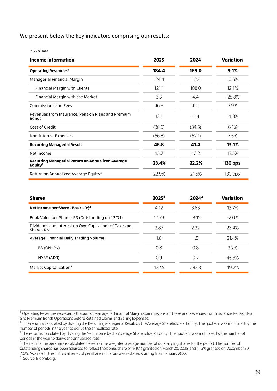 We present below the key indicators comprising our results: In R$ billions Income information 2025 2024 Variation Operating Revenues1 184.4 169.0 9.1% Managerial Financial Margin 124.4 112.4 10.6% Financial Margin with Clients 121.1 108.0 12.1% Financial Margin with the Market 3.3 4.4 -25.8% Commissions and Fees 46.9 45.1 3.9% Revenues from Insurance, Pension Plans and Premium Bonds 13.1 11.4 14.8% Cost of Credit (36.6) (34.5) 6.1% Non-interest Expenses (66.8) (62.1) 7.5% Recurring Managerial Result 46.8 41.4 13.1% Net Income 45.7 40.2 13.5% Recurring Managerial Return on Annualized Average Equity2 23.4% 22.2% 130 bps Return on Annualized Average Equity3 22.9% 21.5% 130 bps Shares 20254 2024 Variation Net Income per Share - Basic - R$4 4.12 3.63 13.7% Book Value per Share - R$ (Outstanding on 12/31) 17.79 18.15 -2.0% Dividends and Interest on Own Capital net of Taxes per Share - R$ 2.87 2.32 23.4% Average Financial Daily Trading Volume 1.8 1.5 21.4% B3 (ON+PN) 0.8 0.8 2.2% NYSE (ADR) 0.9 0.7 45.3% Market Capitalization5 422.5 282.3 49.7% 39 4 1 Operating Revenues represents the sum of Managerial Financial Margin, Commissions and Fees and Revenues from Insurance, Pension Plan and Premium Bonds Operations before Retained Claims and Selling Expenses. 2 The return is calculated by dividing the Recurring Managerial Result by the Average Shareholders’ Equity. The quotient was multiplied by the number of periods in the year to derive the annualized rate. 3 The return is calculated by dividing the Net Income by the Average Shareholders’ Equity. The quotient was multiplied by the number of periods in the year to derive the annualized rate. 4 The net income per share is calculated based on the weighted average number of outstanding shares for the period. The number of outstanding shares has been adjusted to reflect the bonus share of (i) 10% granted on March 20, 2025; and (ii) 3% granted on December 30, 2025. As a result, the historical series of per share indicators was restated starting from January 2022. 5 Source: Bloomberg.