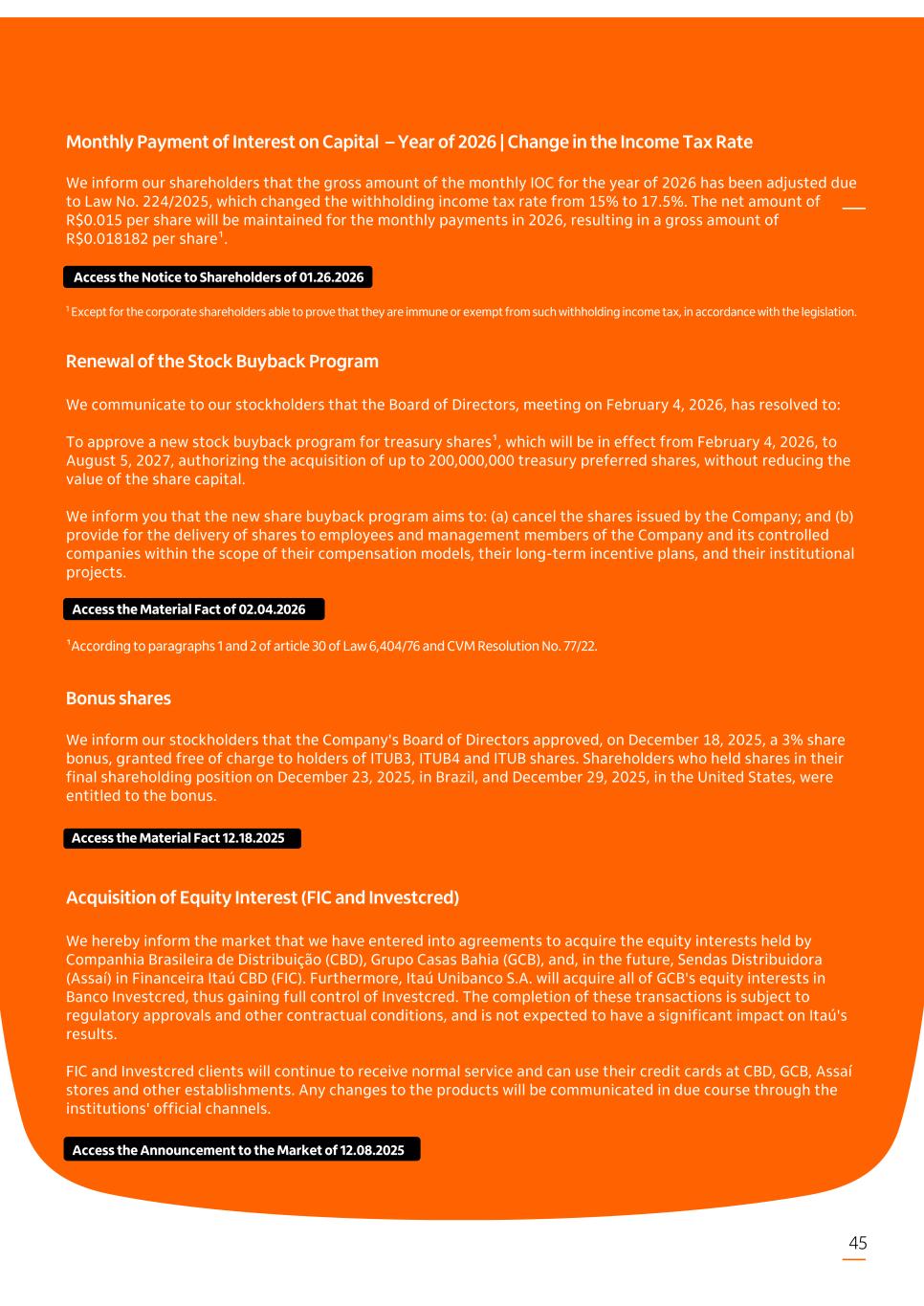 Monthly Payment of Interest on Capital – Year of 2026 | Change in the Income Tax Rate We inform our shareholders that the gross amount of the monthly IOC for the year of 2026 has been adjusted due to Law No. 224/2025, which changed the withholding income tax rate from 15% to 17.5%. The net amount of R$0.015 per share will be maintained for the monthly payments in 2026, resulting in a gross amount of R$0.018182 per share¹. 1 Except for the corporate shareholders able to prove that they are immune or exempt from such withholding income tax, in accordance with the legislation. Renewal of the Stock Buyback Program We communicate to our stockholders that the Board of Directors, meeting on February 4, 2026, has resolved to: To approve a new stock buyback program for treasury shares¹, which will be in effect from February 4, 2026, to August 5, 2027, authorizing the acquisition of up to 200,000,000 treasury preferred shares, without reducing the value of the share capital. We inform you that the new share buyback program aims to: (a) cancel the shares issued by the Company; and (b) provide for the delivery of shares to employees and management members of the Company and its controlled companies within the scope of their compensation models, their long-term incentive plans, and their institutional projects. ¹According to paragraphs 1 and 2 of article 30 of Law 6,404/76 and CVM Resolution No. 77/22. Bonus shares We inform our stockholders that the Company's Board of Directors approved, on December 18, 2025, a 3% share bonus, granted free of charge to holders of ITUB3, ITUB4 and ITUB shares. Shareholders who held shares in their final shareholding position on December 23, 2025, in Brazil, and December 29, 2025, in the United States, were entitled to the bonus. Acquisition of Equity Interest (FIC and Investcred) We hereby inform the market that we have entered into agreements to acquire the equity interests held by Companhia Brasileira de Distribuição (CBD), Grupo Casas Bahia (GCB), and, in the future, Sendas Distribuidora (Assaí) in Financeira Itaú CBD (FIC). Furthermore, Itaú Unibanco S.A. will acquire all of GCB's equity interests in Banco Investcred, thus gaining full control of Investcred. The completion of these transactions is subject to regulatory approvals and other contractual conditions, and is not expected to have a significant impact on Itaú's results. FIC and Investcred clients will continue to receive normal service and can use their credit cards at CBD, GCB, Assaí stores and other establishments. Any changes to the products will be communicated in due course through the institutions' official channels. WWD 45 Access the Announcement to the Market of 12.08.2025 Access the Material Fact 12.18.2025 Access the Material Fact of 02.04.2026 Access the Notice to Shareholders of 01.26.2026