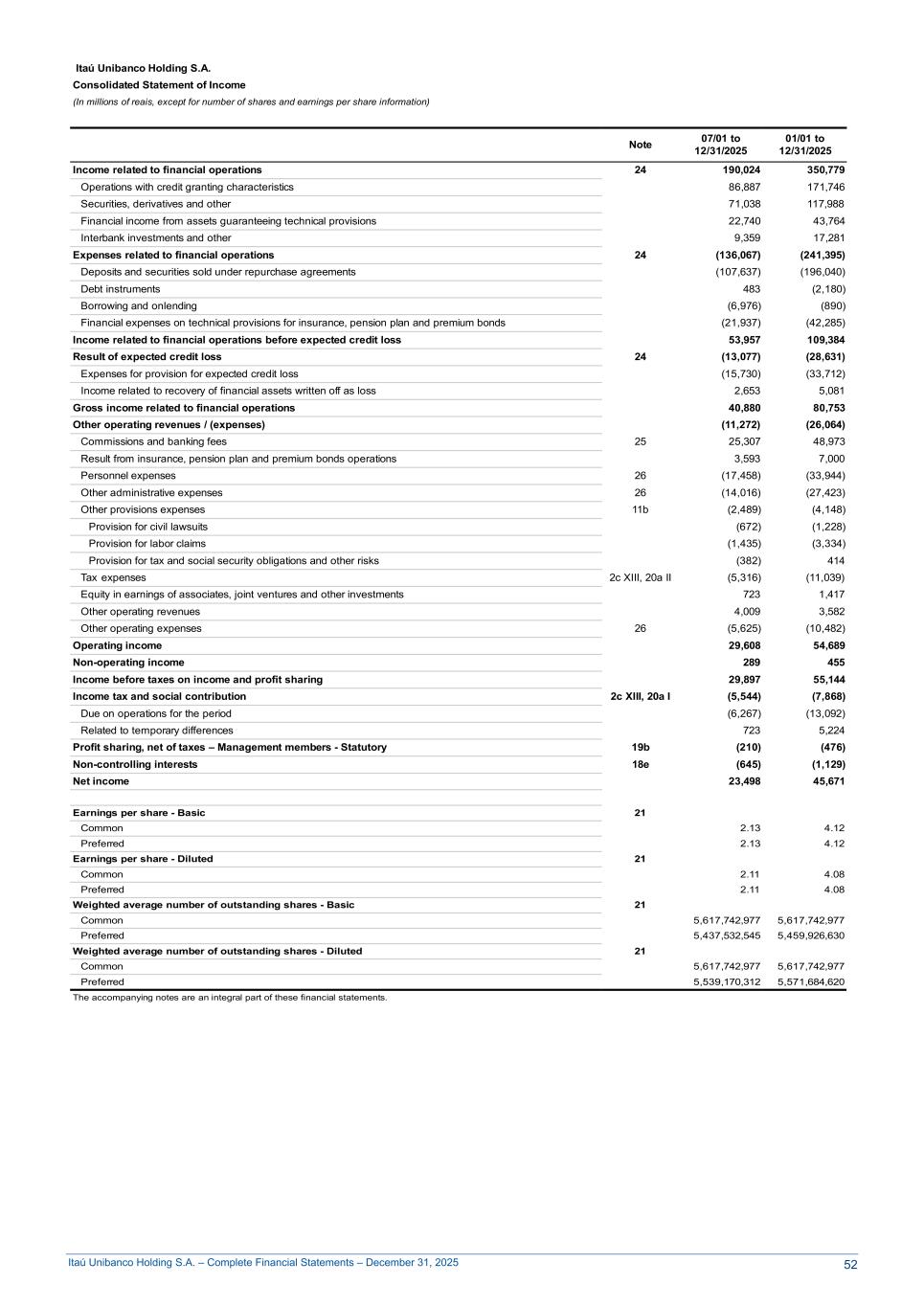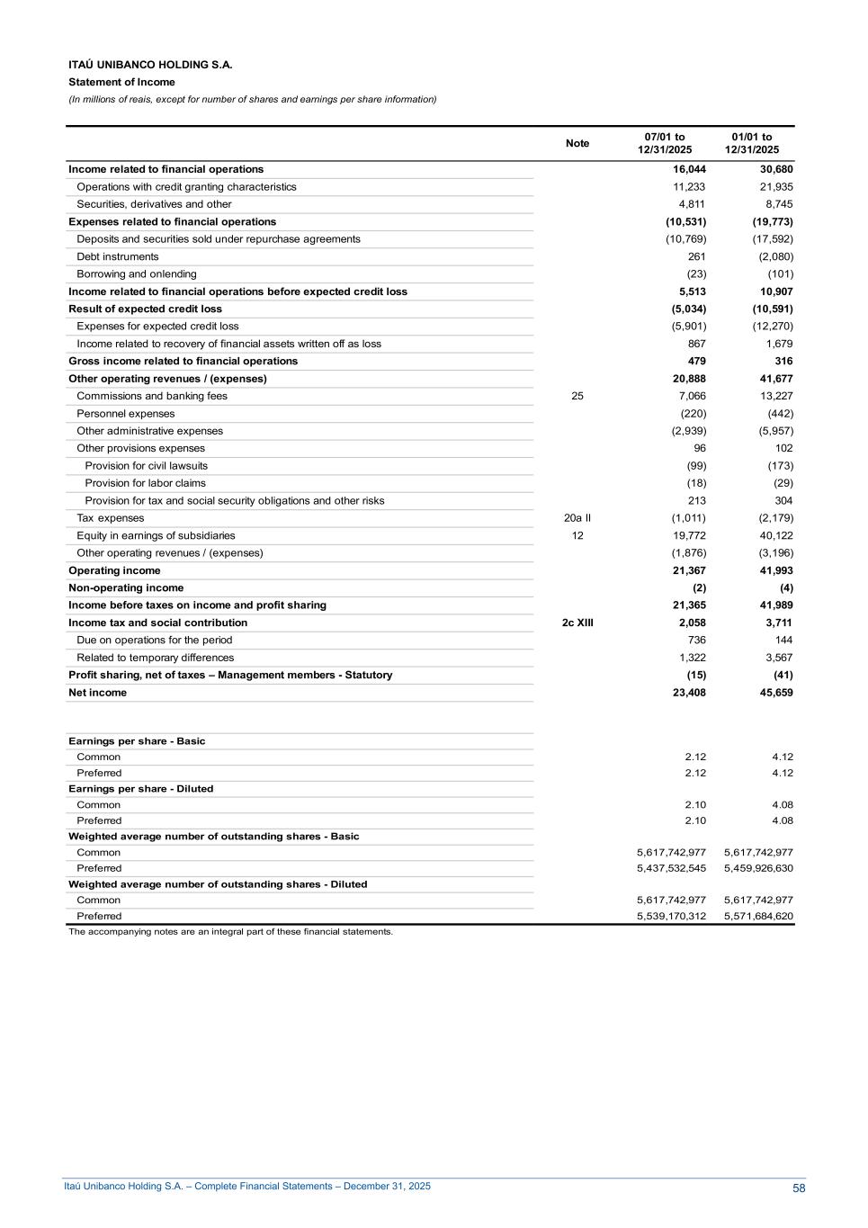 Itaú Unibanco Holding S.A. – Complete Financial Statements – December 31, 2025 ITAÚ UNIBANCO HOLDING S.A. Statement of Income (In millions of reais, except for number of shares and earnings per share information) Note 07/01 to 12/31/2025 01/01 to 12/31/2025 Income related to financial operations 16,044 30,680 Operations with credit granting characteristics 11,233 21,935 Securities, derivatives and other 4,811 8,745 Expenses related to financial operations (10,531) (19,773) Deposits and securities sold under repurchase agreements (10,769) (17,592) Debt instruments 261 (2,080) Borrowing and onlending (23) (101) Income related to financial operations before expected credit loss 5,513 10,907 Result of expected credit loss (5,034) (10,591) Expenses for expected credit loss (5,901) (12,270) Income related to recovery of financial assets written off as loss 867 1,679 Gross income related to financial operations 479 316 Other operating revenues / (expenses) 20,888 41,677 Commissions and banking fees 25 7,066 13,227 Personnel expenses (220) (442) Other administrative expenses (2,939) (5,957) Other provisions expenses 96 102 Provision for civil lawsuits (99) (173) Provision for labor claims (18) (29) Provision for tax and social security obligations and other risks 213 304 Tax expenses 20a II (1,011) (2,179) Equity in earnings of subsidiaries 12 19,772 40,122 Other operating revenues / (expenses) (1,876) (3,196) Operating income 21,367 41,993 Non-operating income (2) (4) Income before taxes on income and profit sharing 21,365 41,989 Income tax and social contribution 2c XIII 2,058 3,711 Due on operations for the period 736 144 Related to temporary differences 1,322 3,567 Profit sharing, net of taxes – Management members - Statutory (15) (41) Net income 23,408 45,659 Earnings per share - Basic Common 2.12 4.12 Preferred 2.12 4.12 Earnings per share - Diluted Common 2.10 4.08 Preferred 2.10 4.08 Weighted average number of outstanding shares - Basic Common 5,617,742,977 5,617,742,977 Preferred 5,437,532,545 5,459,926,630 Weighted average number of outstanding shares - Diluted Common 5,617,742,977 5,617,742,977 Preferred 5,539,170,312 5,571,684,620 The accompanying notes are an integral part of these financial statements. 58