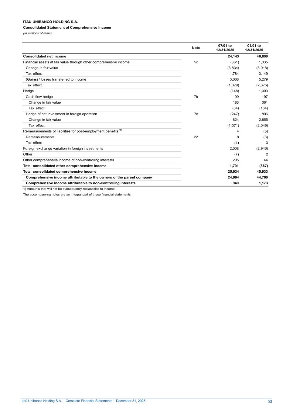 Itaú Unibanco Holding S.A. – Complete Financial Statements – December 31, 2025 ITAÚ UNIBANCO HOLDING S.A. Consolidated Statement of Comprehensive Income (In millions of reais) Note 07/01 to 12/31/2025 01/01 to 12/31/2025 Consolidated net income 24,143 46,800 Financial assets at fair value through other comprehensive income 5c (361) 1,035 Change in fair value (3,834) (5,018) Tax effect 1,784 3,149 (Gains) / losses transferred to income 3,068 5,279 Tax effect (1,379) (2,375) Hedge (148) 1,003 Cash flow hedge 7b 99 197 Change in fair value 183 361 Tax effect (84) (164) Hedge of net investment in foreign operation 7c (247) 806 Change in fair value 824 2,855 Tax effect (1,071) (2,049) Remeasurements of liabilities for post-employment benefits (1) 4 (5) Remeasurements 22 8 (8) Tax effect (4) 3 Foreign exchange variation in foreign investments 2,008 (2,946) Other (7) 2 Other comprehensive income of non-controlling interests 295 44 Total consolidated other comprehensive income 1,791 (867) Total consolidated comprehensive income 25,934 45,933 Comprehensive income attributable to the owners of the parent company 24,994 44,760 Comprehensive income attributable to non-controlling interests 940 1,173 1) Amounts that will not be subsequently reclassified to income. The accompanying notes are an integral part of these financial statements. 53