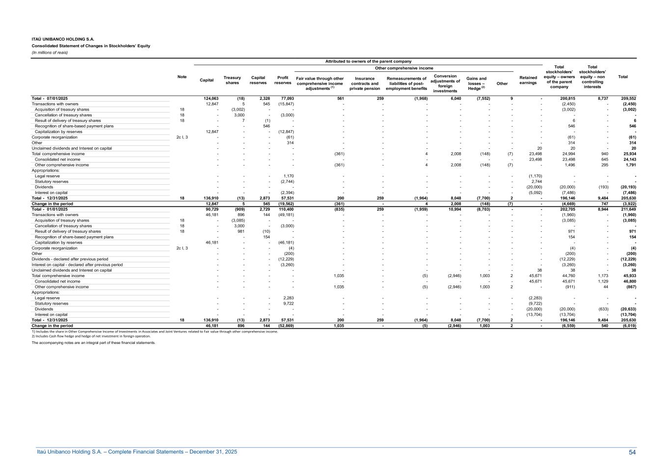 Itaú Unibanco Holding S.A. – Complete Financial Statements – December 31, 2025 ITAÚ UNIBANCO HOLDING S.A. Consolidated Statement of Changes in Stockholders’ Equity (In millions of reais) Note Attributed to owners of the parent company Total stockholders’ equity – owners of the parent company Total stockholders’ equity – non controlling interests Total Capital Treasury shares Capital reserves Profit reserves Other comprehensive income Retained earnings Fair value through other comprehensive income adjustments (1) Insurance contracts and private pension Remeasurements of liabilities of post- employment benefits Conversion adjustments of foreign investments Gains and losses – Hedge (2) Other Total - 07/01/2025 124,063 (18) 2,328 77,093 561 259 (1,968) 6,040 (7,552) 9 - 200,815 8,737 209,552 Transactions with owners 12,847 5 545 (15,847) - - - - - - - (2,450) - (2,450) Acquisition of treasury shares 18 - (3,002) - - - - - - - - - (3,002) - (3,002) Cancellation of treasury shares 18 - 3,000 - (3,000) - - - - - - - - - - Result of delivery of treasury shares 18 - 7 (1) - - - - - - - - 6 - 6 Recognition of share-based payment plans - - 546 - - - - - - - - 546 - 546 Capitalization by reserves 12,847 - - (12,847) - - - - - - - - - - Corporate reorganization 2c I, 3 - - - (61) - - - - - - - (61) - (61) Other - - - 314 - - - - - - - 314 - 314 Unclaimed dividends and Interest on capital - - - - - - - - - - 20 20 - 20 Total comprehensive income - - - - (361) - 4 2,008 (148) (7) 23,498 24,994 940 25,934 Consolidated net income - - - - - - - - - - 23,498 23,498 645 24,143 Other comprehensive income - - - - (361) - 4 2,008 (148) (7) - 1,496 295 1,791 Appropriations: Legal reserve - - - 1,170 - - - - - - (1,170) - - - Statutory reserves - - - (2,744) - - - - - - 2,744 - - - Dividends - - - - - - - - - - (20,000) (20,000) (193) (20,193) Interest on capital - - - (2,394) - - - - - - (5,092) (7,486) - (7,486) Total - 12/31/2025 18 136,910 (13) 2,873 57,531 200 259 (1,964) 8,048 (7,700) 2 - 196,146 9,484 205,630 Change in the period 12,847 5 545 (19,562) (361) - 4 2,008 (148) (7) - (4,669) 747 (3,922) Total - 01/01/2025 90,729 (909) 2,729 110,400 (835) 259 (1,959) 10,994 (8,703) - - 202,705 8,944 211,649 Transactions with owners 46,181 896 144 (49,181) - - - - - - - (1,960) - (1,960) Acquisition of treasury shares 18 - (3,085) - - - - - - - - - (3,085) - (3,085) Cancellation of treasury shares 18 - 3,000 - (3,000) - - - - - - - - - - Result of delivery of treasury shares 18 - 981 (10) - - - - - - - - 971 - 971 Recognition of share-based payment plans - - 154 - - - - - - - - 154 - 154 Capitalization by reserves 46,181 - - (46,181) - - - - - - - - - - Corporate reorganization 2c I, 3 - - - (4) - - - - - - - (4) - (4) Other - - - (200) - - - - - - - (200) - (200) Dividends - declared after previous period - - - (12,229) - - - - - - - (12,229) - (12,229) Interest on capital - declared after previous period - - - (3,260) - - - - - - - (3,260) - (3,260) Unclaimed dividends and Interest on capital - - - - - - - - - - 38 38 - 38 Total comprehensive income - - - - 1,035 - (5) (2,946) 1,003 2 45,671 44,760 1,173 45,933 Consolidated net income - - - - - - - - - - 45,671 45,671 1,129 46,800 Other comprehensive income - - - - 1,035 - (5) (2,946) 1,003 2 - (911) 44 (867) Appropriations: Legal reserve - - - 2,283 - - - - - - (2,283) - - - Statutory reserves - - - 9,722 - - - - - - (9,722) - - - Dividends - - - - - - - - - - (20,000) (20,000) (633) (20,633) Interest on capital - - - - - - - - - - (13,704) (13,704) - (13,704) Total - 12/31/2025 18 136,910 (13) 2,873 57,531 200 259 (1,964) 8,048 (7,700) 2 - 196,146 9,484 205,630 Change in the period 46,181 896 144 (52,869) 1,035 - (5) (2,946) 1,003 2 - (6,559) 540 (6,019) 1) Includes the share in Other Comprehensive Income of Investments in Associates and Joint Ventures related to Fair value through other comprehensive income. 2) Includes Cash flow hedge and hedge of net investment in foreign operation. The accompanying notes are an integral part of these financial statements. 54