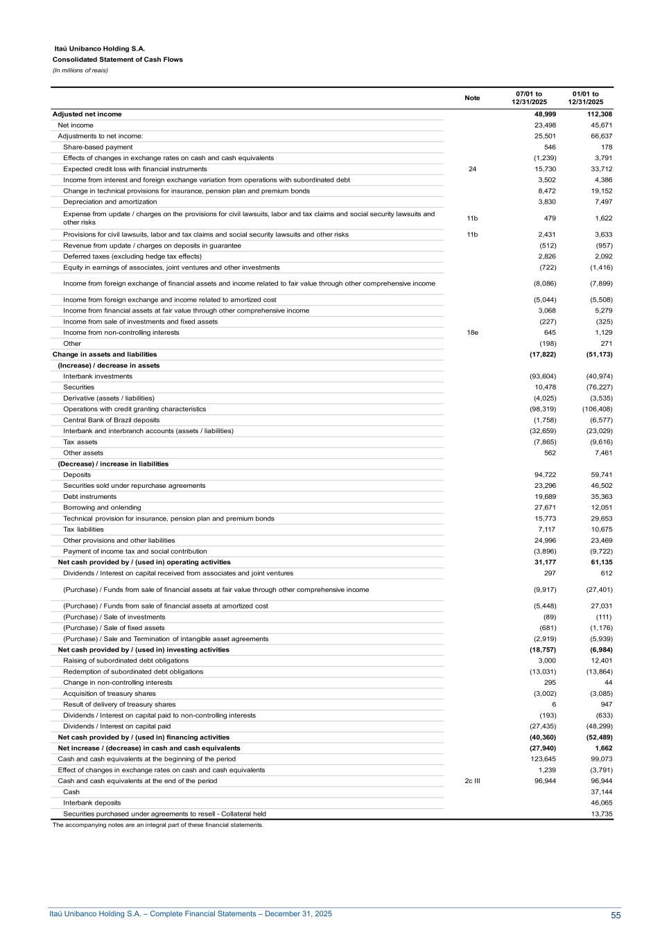 Itaú Unibanco Holding S.A. – Complete Financial Statements – December 31, 2025 Itaú Unibanco Holding S.A. Consolidated Statement of Cash Flows 1 (In millions of reais) Note 07/01 to 12/31/2025 01/01 to 12/31/2025 Adjusted net income 48,999 112,308 Net income 23,498 45,671 Adjustments to net income: 25,501 66,637 Share-based payment 546 178 Effects of changes in exchange rates on cash and cash equivalents (1,239) 3,791 Expected credit loss with financial instruments 24 15,730 33,712 Income from interest and foreign exchange variation from operations with subordinated debt 3,502 4,386 Change in technical provisions for insurance, pension plan and premium bonds 8,472 19,152 Depreciation and amortization 3,830 7,497 Expense from update / charges on the provisions for civil lawsuits, labor and tax claims and social security lawsuits and other risks 11b 479 1,622 Provisions for civil lawsuits, labor and tax claims and social security lawsuits and other risks 11b 2,431 3,633 Revenue from update / charges on deposits in guarantee (512) (957) Deferred taxes (excluding hedge tax effects) 2,826 2,092 Equity in earnings of associates, joint ventures and other investments (722) (1,416) Income from foreign exchange of financial assets and income related to fair value through other comprehensive income (8,086) (7,899) Income from foreign exchange and income related to amortized cost (5,044) (5,508) Income from financial assets at fair value through other comprehensive income 3,068 5,279 Income from sale of investments and fixed assets (227) (325) Income from non-controlling interests 18e 645 1,129 Other (198) 271 Change in assets and liabilities (17,822) (51,173) (Increase) / decrease in assets Interbank investments (93,604) (40,974) Securities 10,478 (76,227) Derivative (assets / liabilities) (4,025) (3,535) Operations with credit granting characteristics (98,319) (106,408) Central Bank of Brazil deposits (1,758) (6,577) Interbank and interbranch accounts (assets / liabilities) (32,659) (23,029) Tax assets (7,865) (9,616) Other assets 562 7,461 (Decrease) / increase in liabilities Deposits 94,722 59,741 Securities sold under repurchase agreements 23,296 46,502 Debt instruments 19,689 35,363 Borrowing and onlending 27,671 12,051 Technical provision for insurance, pension plan and premium bonds 15,773 29,653 Tax liabilities 7,117 10,675 Other provisions and other liabilities 24,996 23,469 Payment of income tax and social contribution (3,896) (9,722) Net cash provided by / (used in) operating activities 31,177 61,135 Dividends / Interest on capital received from associates and joint ventures 297 612 (Purchase) / Funds from sale of financial assets at fair value through other comprehensive income (9,917) (27,401) (Purchase) / Funds from sale of financial assets at amortized cost (5,448) 27,031 (Purchase) / Sale of investments (89) (111) (Purchase) / Sale of fixed assets (681) (1,176) (Purchase) / Sale and Termination of intangible asset agreements (2,919) (5,939) Net cash provided by / (used in) investing activities (18,757) (6,984) Raising of subordinated debt obligations 3,000 12,401 Redemption of subordinated debt obligations (13,031) (13,864) Change in non-controlling interests 295 44 Acquisition of treasury shares (3,002) (3,085) Result of delivery of treasury shares 6 947 Dividends / Interest on capital paid to non-controlling interests (193) (633) Dividends / Interest on capital paid (27,435) (48,299) Net cash provided by / (used in) financing activities (40,360) (52,489) Net increase / (decrease) in cash and cash equivalents (27,940) 1,662 Cash and cash equivalents at the beginning of the period 123,645 99,073 Effect of changes in exchange rates on cash and cash equivalents 1,239 (3,791) Cash and cash equivalents at the end of the period 2c III 96,944 96,944 Cash 37,144 Interbank deposits 46,065 Securities purchased under agreements to resell - Collateral held 13,735 The accompanying notes are an integral part of these financial statements. 55