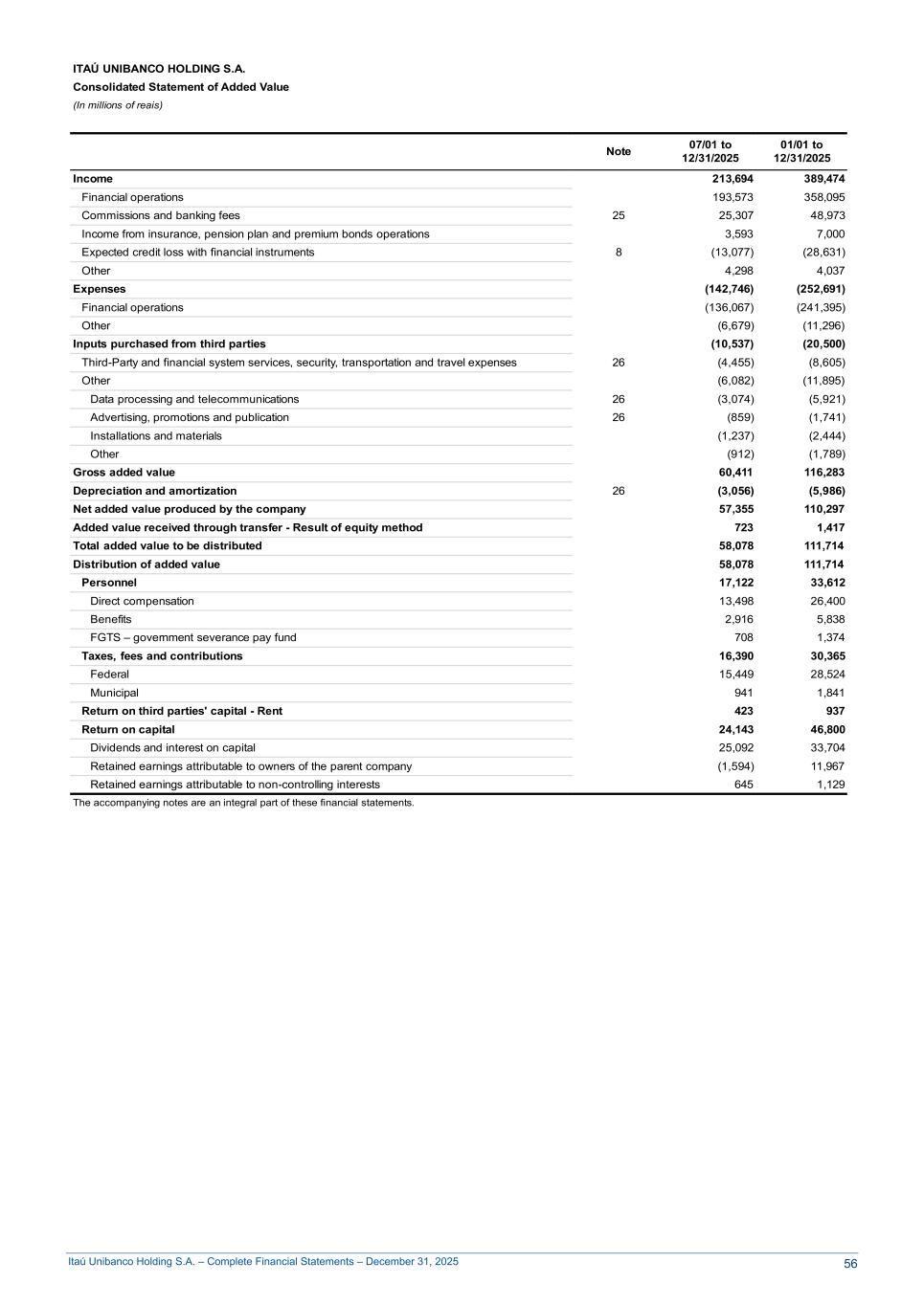 Itaú Unibanco Holding S.A. – Complete Financial Statements – December 31, 2025 ITAÚ UNIBANCO HOLDING S.A. Consolidated Statement of Added Value (In millions of reais) Note 07/01 to 12/31/2025 01/01 to 12/31/2025 Income 213,694 389,474 Financial operations 193,573 358,095 Commissions and banking fees 25 25,307 48,973 Income from insurance, pension plan and premium bonds operations 3,593 7,000 Expected credit loss with financial instruments 8 (13,077) (28,631) Other 4,298 4,037 Expenses (142,746) (252,691) Financial operations (136,067) (241,395) Other (6,679) (11,296) Inputs purchased from third parties (10,537) (20,500) Third-Party and financial system services, security, transportation and travel expenses 26 (4,455) (8,605) Other (6,082) (11,895) Data processing and telecommunications 26 (3,074) (5,921) Advertising, promotions and publication 26 (859) (1,741) Installations and materials (1,237) (2,444) Other (912) (1,789) Gross added value 60,411 116,283 Depreciation and amortization 26 (3,056) (5,986) Net added value produced by the company 57,355 110,297 Added value received through transfer - Result of equity method 723 1,417 Total added value to be distributed 58,078 111,714 Distribution of added value 58,078 111,714 Personnel 17,122 33,612 Direct compensation 13,498 26,400 Benefits 2,916 5,838 FGTS – government severance pay fund 708 1,374 Taxes, fees and contributions 16,390 30,365 Federal 15,449 28,524 Municipal 941 1,841 Return on third parties' capital - Rent 423 937 Return on capital 24,143 46,800 Dividends and interest on capital 25,092 33,704 Retained earnings attributable to owners of the parent company (1,594) 11,967 Retained earnings attributable to non-controlling interests 645 1,129 The accompanying notes are an integral part of these financial statements. 56