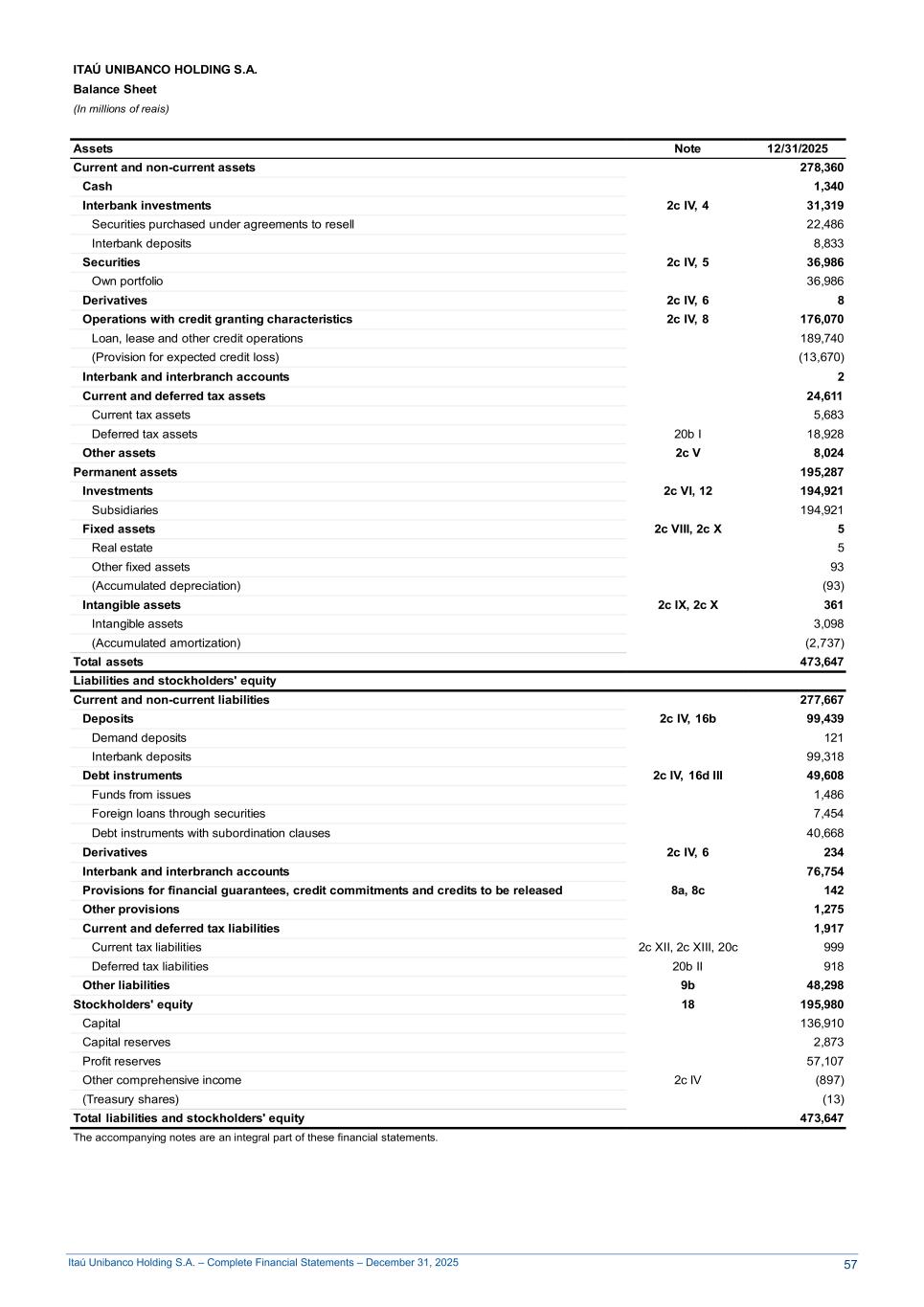 Itaú Unibanco Holding S.A. – Complete Financial Statements – December 31, 2025 ITAÚ UNIBANCO HOLDING S.A. Balance Sheet (In millions of reais) Assets Note 12/31/2025 Current and non-current assets 278,360 Cash 1,340 Interbank investments 2c IV, 4 31,319 Securities purchased under agreements to resell 22,486 Interbank deposits 8,833 Securities 2c IV, 5 36,986 Own portfolio 36,986 Derivatives 2c IV, 6 8 Operations with credit granting characteristics 2c IV, 8 176,070 Loan, lease and other credit operations 189,740 (Provision for expected credit loss) (13,670) Interbank and interbranch accounts 2 Current and deferred tax assets 24,611 Current tax assets 5,683 Deferred tax assets 20b I 18,928 Other assets 2c V 8,024 Permanent assets 195,287 Investments 2c VI, 12 194,921 Subsidiaries 194,921 Fixed assets 2c VIII, 2c X 5 Real estate 5 Other fixed assets 93 (Accumulated depreciation) (93) Intangible assets 2c IX, 2c X 361 Intangible assets 3,098 (Accumulated amortization) (2,737) Total assets 473,647 Liabilities and stockholders' equity Current and non-current liabilities 277,667 Deposits 2c IV, 16b 99,439 Demand deposits 121 Interbank deposits 99,318 Debt instruments 2c IV, 16d III 49,608 Funds from issues 1,486 Foreign loans through securities 7,454 Debt instruments with subordination clauses 40,668 Derivatives 2c IV, 6 234 Interbank and interbranch accounts 76,754 Provisions for financial guarantees, credit commitments and credits to be released 8a, 8c 142 Other provisions 1,275 Current and deferred tax liabilities 1,917 Current tax liabilities 2c XII, 2c XIII, 20c 999 Deferred tax liabilities 20b II 918 Other liabilities 9b 48,298 Stockholders' equity 18 195,980 Capital 136,910 Capital reserves 2,873 Profit reserves 57,107 Other comprehensive income 2c IV (897) (Treasury shares) (13) Total liabilities and stockholders' equity 473,647 The accompanying notes are an integral part of these financial statements. 57