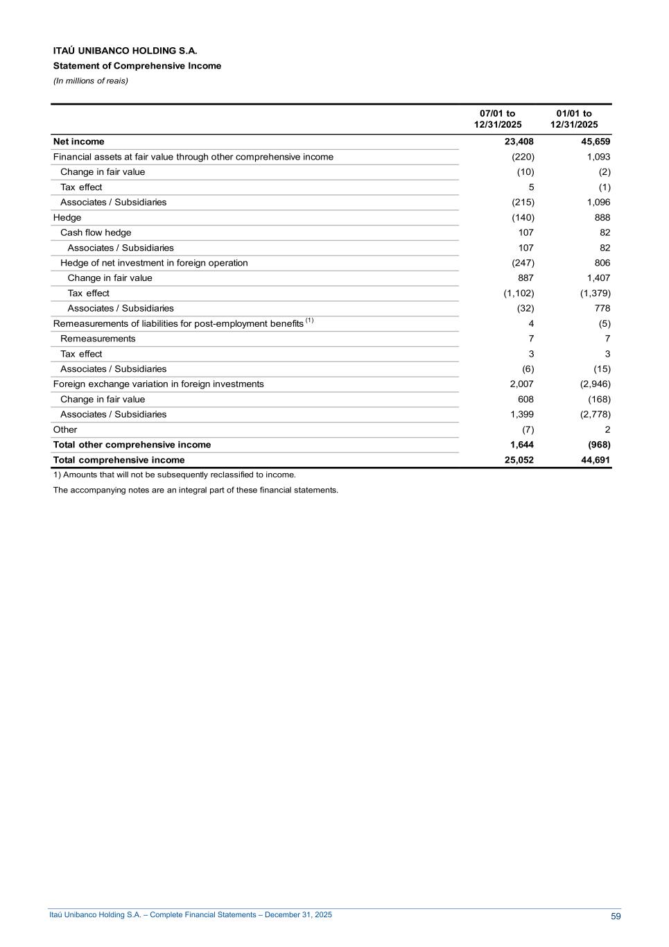 Itaú Unibanco Holding S.A. – Complete Financial Statements – December 31, 2025 ITAÚ UNIBANCO HOLDING S.A. Statement of Comprehensive Income (In millions of reais) 07/01 to 12/31/2025 01/01 to 12/31/2025 Net income 23,408 45,659 Financial assets at fair value through other comprehensive income (220) 1,093 Change in fair value (10) (2) Tax effect 5 (1) Associates / Subsidiaries (215) 1,096 Hedge (140) 888 Cash flow hedge 107 82 Associates / Subsidiaries 107 82 Hedge of net investment in foreign operation (247) 806 Change in fair value 887 1,407 Tax effect (1,102) (1,379) Associates / Subsidiaries (32) 778 Remeasurements of liabilities for post-employment benefits (1) 4 (5) Remeasurements 7 7 Tax effect 3 3 Associates / Subsidiaries (6) (15) Foreign exchange variation in foreign investments 2,007 (2,946) Change in fair value 608 (168) Associates / Subsidiaries 1,399 (2,778) Other (7) 2 Total other comprehensive income 1,644 (968) Total comprehensive income 25,052 44,691 1) Amounts that will not be subsequently reclassified to income. The accompanying notes are an integral part of these financial statements. 59