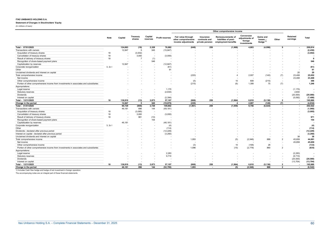 Itaú Unibanco Holding S.A. – Complete Financial Statements – December 31, 2025 ITAÚ UNIBANCO HOLDING S.A. Statement of Changes in Stockholders’ Equity (In millions of reais) Note Capital Treasury shares Capital reserves Profit reserves Other comprehensive income Retained earnings TotalFair value through other comprehensive income adjustments Insurance contracts and private pension Remeasurements of liabilities of post- employment benefits Conversion adjustments of foreign investments Gains and losses – Hedge (1) Other Total - 07/01/2025 124,063 (18) 2,328 76,982 (648) 259 (1,968) 4,803 (4,996) 9 - 200,814 Transactions with owners 12,847 5 545 (15,847) - - - - - - - (2,450) Acquisition of treasury shares 18 - (3,002) - - - - - - - - - (3,002) Cancellation of treasury shares 18 - 3,000 - (3,000) - - - - - - - - Result of delivery of treasury shares 18 - 7 (1) - - - - - - - - 6 Recognition of share-based payment plans - - 546 - - - - - - - - 546 Capitalization by reserves 12,847 - - (12,847) - - - - - - - - Corporate reorganization 3, 2c I - - - (61) - - - - - - - (61) Other - - - 91 - - - - - - - 91 Unclaimed dividends and Interest on capital - - - - - - - - - - 20 20 Total comprehensive income - - - - (220) - 4 2,007 (140) (7) 23,408 25,052 Net income - - - - - - - - - - 23,408 23,408 Other comprehensive income - - - - (5) - 10 608 (215) - - 398 Portion of other comprehensive income from investments in associates and subsidiaries - - - - (215) - (6) 1,399 75 (7) - 1,246 Appropriations: Legal reserve - - - 1,170 - - - - - - (1,170) - Statutory reserves - - - (2,834) - - - - - - 2,834 - Dividends - - - - - - - - - - (20,000) (20,000) Interest on capital - - - (2,394) - - - - - - (5,092) (7,486) Total - 12/31/2025 18 136,910 (13) 2,873 57,107 (868) 259 (1,964) 6,810 (5,136) 2 - 195,980 Change in the period 12,847 5 545 (19,875) (220) - 4 2,007 (140) (7) - (4,834) Total - 01/01/2025 90,729 (909) 2,729 109,902 (1,961) 259 (1,959) 9,756 (6,024) - - 202,522 Transactions with owners 46,181 896 144 (49,181) - - - - - - - (1,960) Acquisition of treasury shares 18 - (3,085) - - - - - - - - - (3,085) Cancellation of treasury shares 18 - 3,000 - (3,000) - - - - - - - - Result of delivery of treasury shares 18 - 981 (10) - - - - - - - - 971 Recognition of share-based payment plans - - 154 - - - - - - - - 154 Capitalization by reserves 46,181 - - (46,181) - - - - - - - - Corporate reorganization 3, 2c I - - - (4) - - - - - - - (4) Other - - - (114) - - - - - - - (114) Dividends - declared after previous period - - - (12,229) - - - - - - - (12,229) Interest on capital - declared after previous period - - - (3,260) - - - - - - - (3,260) Unclaimed dividends and Interest on capital - - - - - - - - - - 38 38 Total comprehensive income - - - - 1,093 - (5) (2,946) 888 2 45,659 44,691 Net income - - - - - - - - - - 45,659 45,659 Other comprehensive income - - - - (3) - 10 (168) 28 - - (133) Portion of other comprehensive income from investments in associates and subsidiaries - - - - 1,096 - (15) (2,778) 860 2 - (835) Appropriations: Legal reserve - - - 2,283 - - - - - - (2,283) - Statutory reserves - - - 9,710 - - - - - - (9,710) - Dividends - - - - - - - - - - (20,000) (20,000) Interest on capital - - - - - - - - - - (13,704) (13,704) Total - 12/31/2025 18 136,910 (13) 2,873 57,107 (868) 259 (1,964) 6,810 (5,136) 2 - 195,980 Change in the period 46,181 896 144 (52,795) 1,093 - (5) (2,946) 888 2 - (6,542) 1) Includes Cash flow hedge and hedge of net investment in foreign operation. The accompanying notes are an integral part of these financial statements. 60