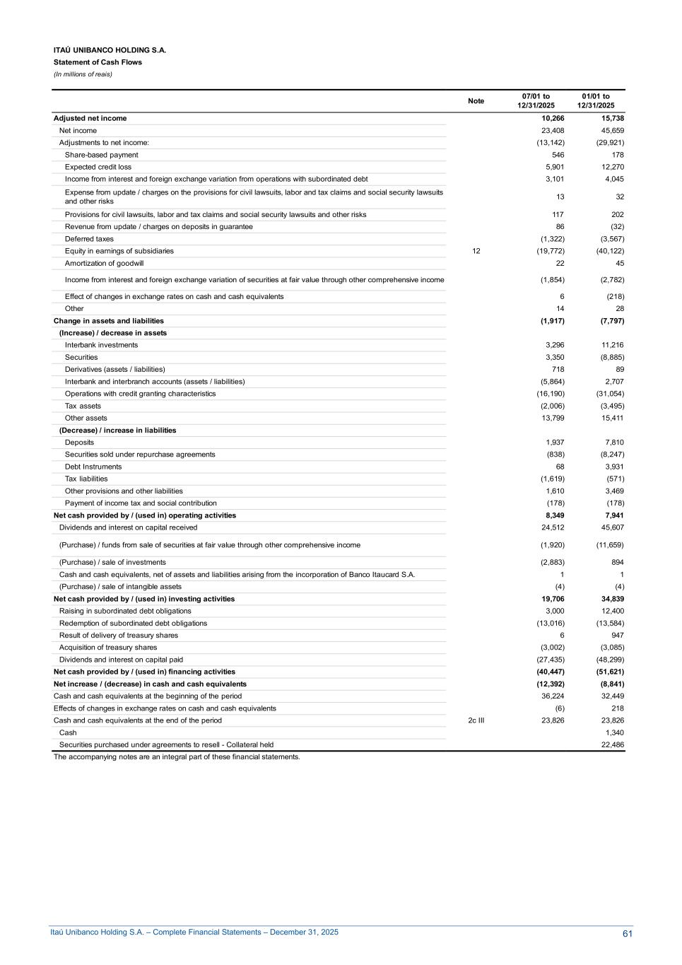 Itaú Unibanco Holding S.A. – Complete Financial Statements – December 31, 2025 ITAÚ UNIBANCO HOLDING S.A. Statement of Cash Flows (In millions of reais) Note 07/01 to 12/31/2025 01/01 to 12/31/2025 Adjusted net income 10,266 15,738 Net income 23,408 45,659 Adjustments to net income: (13,142) (29,921) Share-based payment 546 178 Expected credit loss 5,901 12,270 Income from interest and foreign exchange variation from operations with subordinated debt 3,101 4,045 Expense from update / charges on the provisions for civil lawsuits, labor and tax claims and social security lawsuits and other risks 13 32 Provisions for civil lawsuits, labor and tax claims and social security lawsuits and other risks 117 202 Revenue from update / charges on deposits in guarantee 86 (32) Deferred taxes (1,322) (3,567) Equity in earnings of subsidiaries 12 (19,772) (40,122) Amortization of goodwill 22 45 Income from interest and foreign exchange variation of securities at fair value through other comprehensive income (1,854) (2,782) Effect of changes in exchange rates on cash and cash equivalents 6 (218) Other 14 28 Change in assets and liabilities (1,917) (7,797) (Increase) / decrease in assets Interbank investments 3,296 11,216 Securities 3,350 (8,885) Derivatives (assets / liabilities) 718 89 Interbank and interbranch accounts (assets / liabilities) (5,864) 2,707 Operations with credit granting characteristics (16,190) (31,054) Tax assets (2,006) (3,495) Other assets 13,799 15,411 (Decrease) / increase in liabilities Deposits 1,937 7,810 Securities sold under repurchase agreements (838) (8,247) Debt Instruments 68 3,931 Tax liabilities (1,619) (571) Other provisions and other liabilities 1,610 3,469 Payment of income tax and social contribution (178) (178) Net cash provided by / (used in) operating activities 8,349 7,941 Dividends and interest on capital received 24,512 45,607 (Purchase) / funds from sale of securities at fair value through other comprehensive income (1,920) (11,659) (Purchase) / sale of investments (2,883) 894 Cash and cash equivalents, net of assets and liabilities arising from the incorporation of Banco Itaucard S.A. 1 1 (Purchase) / sale of intangible assets (4) (4) Net cash provided by / (used in) investing activities 19,706 34,839 Raising in subordinated debt obligations 3,000 12,400 Redemption of subordinated debt obligations (13,016) (13,584) Result of delivery of treasury shares 6 947 Acquisition of treasury shares (3,002) (3,085) Dividends and interest on capital paid (27,435) (48,299) Net cash provided by / (used in) financing activities (40,447) (51,621) Net increase / (decrease) in cash and cash equivalents (12,392) (8,841) Cash and cash equivalents at the beginning of the period 36,224 32,449 Effects of changes in exchange rates on cash and cash equivalents (6) 218 Cash and cash equivalents at the end of the period 2c III 23,826 23,826 Cash 1,340 Securities purchased under agreements to resell - Collateral held 22,486 The accompanying notes are an integral part of these financial statements. 61