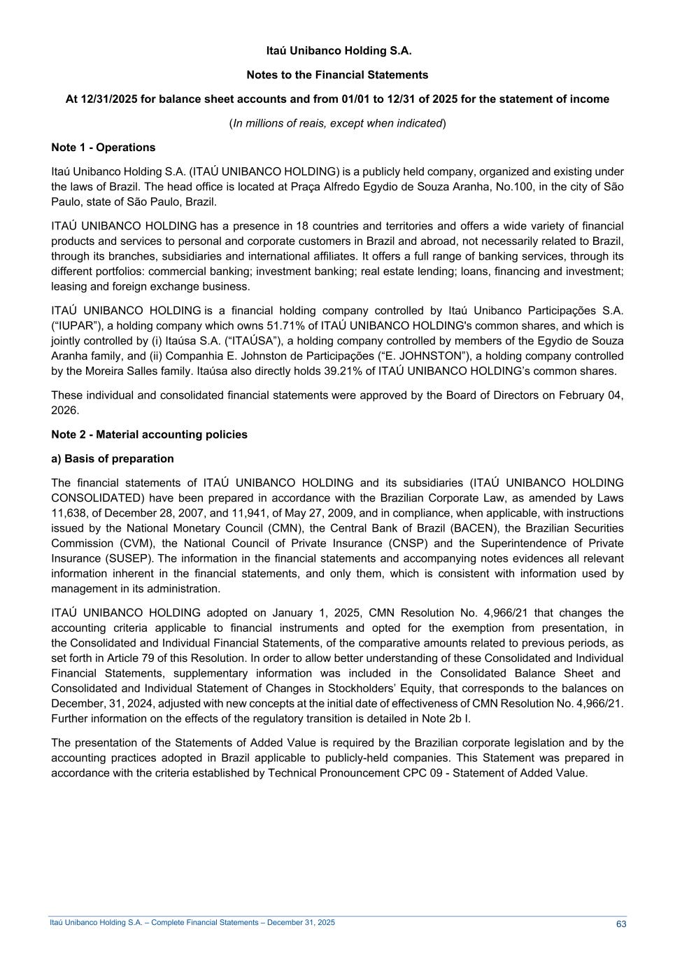 Itaú Unibanco Holding S.A. – Complete Financial Statements – December 31, 2025 Itaú Unibanco Holding S.A. Notes to the Financial Statements At 12/31/2025 for balance sheet accounts and from 01/01 to 12/31 of 2025 for the statement of income (In millions of reais, except when indicated) Note 1 - Operations Itaú Unibanco Holding S.A. (ITAÚ UNIBANCO HOLDING) is a publicly held company, organized and existing under the laws of Brazil. The head office is located at Praça Alfredo Egydio de Souza Aranha, No.100, in the city of São Paulo, state of São Paulo, Brazil. ITAÚ UNIBANCO HOLDING has a presence in 18 countries and territories and offers a wide variety of financial products and services to personal and corporate customers in Brazil and abroad, not necessarily related to Brazil, through its branches, subsidiaries and international affiliates. It offers a full range of banking services, through its different portfolios: commercial banking; investment banking; real estate lending; loans, financing and investment; leasing and foreign exchange business. ITAÚ UNIBANCO HOLDING is a financial holding company controlled by Itaú Unibanco Participações S.A. (“IUPAR”), a holding company which owns 51.71% of ITAÚ UNIBANCO HOLDING's common shares, and which is jointly controlled by (i) Itaúsa S.A. (“ITAÚSA”), a holding company controlled by members of the Egydio de Souza Aranha family, and (ii) Companhia E. Johnston de Participações (“E. JOHNSTON”), a holding company controlled by the Moreira Salles family. Itaúsa also directly holds 39.21% of ITAÚ UNIBANCO HOLDING’s common shares. These individual and consolidated financial statements were approved by the Board of Directors on February 04, 2026. Note 2 - Material accounting policies a) Basis of preparation The financial statements of ITAÚ UNIBANCO HOLDING and its subsidiaries (ITAÚ UNIBANCO HOLDING CONSOLIDATED) have been prepared in accordance with the Brazilian Corporate Law, as amended by Laws 11,638, of December 28, 2007, and 11,941, of May 27, 2009, and in compliance, when applicable, with instructions issued by the National Monetary Council (CMN), the Central Bank of Brazil (BACEN), the Brazilian Securities Commission (CVM), the National Council of Private Insurance (CNSP) and the Superintendence of Private Insurance (SUSEP). The information in the financial statements and accompanying notes evidences all relevant information inherent in the financial statements, and only them, which is consistent with information used by management in its administration. ITAÚ UNIBANCO HOLDING adopted on January 1, 2025, CMN Resolution No. 4,966/21 that changes the accounting criteria applicable to financial instruments and opted for the exemption from presentation, in the Consolidated and Individual Financial Statements, of the comparative amounts related to previous periods, as set forth in Article 79 of this Resolution. In order to allow better understanding of these Consolidated and Individual Financial Statements, supplementary information was included in the Consolidated Balance Sheet and Consolidated and Individual Statement of Changes in Stockholders’ Equity, that corresponds to the balances on December, 31, 2024, adjusted with new concepts at the initial date of effectiveness of CMN Resolution No. 4,966/21. Further information on the effects of the regulatory transition is detailed in Note 2b I. The presentation of the Statements of Added Value is required by the Brazilian corporate legislation and by the accounting practices adopted in Brazil applicable to publicly-held companies. This Statement was prepared in accordance with the criteria established by Technical Pronouncement CPC 09 - Statement of Added Value. 63