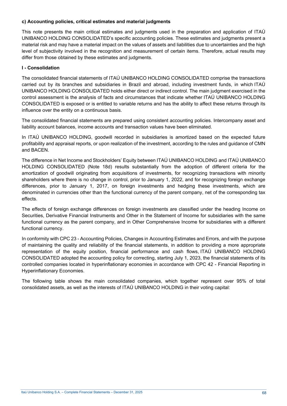 Itaú Unibanco Holding S.A. – Complete Financial Statements – December 31, 2025 c) Accounting policies, critical estimates and material judgments This note presents the main critical estimates and judgments used in the preparation and application of ITAÚ UNIBANCO HOLDING CONSOLIDATED’s specific accounting policies. These estimates and judgments present a material risk and may have a material impact on the values of assets and liabilities due to uncertainties and the high level of subjectivity involved in the recognition and measurement of certain items. Therefore, actual results may differ from those obtained by these estimates and judgments. I - Consolidation The consolidated financial statements of ITAÚ UNIBANCO HOLDING CONSOLIDATED comprise the transactions carried out by its branches and subsidiaries in Brazil and abroad, including investment funds, in which ITAÚ UNIBANCO HOLDING CONSOLIDATED holds either direct or indirect control. The main judgment exercised in the control assessment is the analysis of facts and circumstances that indicate whether ITAÚ UNIBANCO HOLDING CONSOLIDATED is exposed or is entitled to variable returns and has the ability to affect these returns through its influence over the entity on a continuous basis. The consolidated financial statements are prepared using consistent accounting policies. Intercompany asset and liability account balances, income accounts and transaction values have been eliminated. In ITAÚ UNIBANCO HOLDING, goodwill recorded in subsidiaries is amortized based on the expected future profitability and appraisal reports, or upon realization of the investment, according to the rules and guidance of CMN and BACEN. The difference in Net Income and Stockholders’ Equity between ITAÚ UNIBANCO HOLDING and ITAÚ UNIBANCO HOLDING CONSOLIDATED (Note 18d) results substantially from the adoption of different criteria for the amortization of goodwill originating from acquisitions of investments, for recognizing transactions with minority shareholders where there is no change in control, prior to January 1, 2022, and for recognizing foreign exchange differences, prior to January 1, 2017, on foreign investments and hedging these investments, which are denominated in currencies other than the functional currency of the parent company, net of the corresponding tax effects. The effects of foreign exchange differences on foreign investments are classified under the heading Income on Securities, Derivative Financial Instruments and Other in the Statement of Income for subsidiaries with the same functional currency as the parent company, and in Other Comprehensive Income for subsidiaries with a different functional currency. In conformity with CPC 23 - Accounting Policies, Changes in Accounting Estimates and Errors, and with the purpose of maintaining the quality and reliability of the financial statements, in addition to providing a more appropriate representation of the equity position, financial performance and cash flows, ITAÚ UNIBANCO HOLDING CONSOLIDATED adopted the accounting policy for correcting, starting July 1, 2023, the financial statements of its controlled companies located in hyperinflationary economies in accordance with CPC 42 - Financial Reporting in Hyperinflationary Economies. The following table shows the main consolidated companies, which together represent over 95% of total consolidated assets, as well as the interests of ITAÚ UNIBANCO HOLDING in their voting capital: 68
