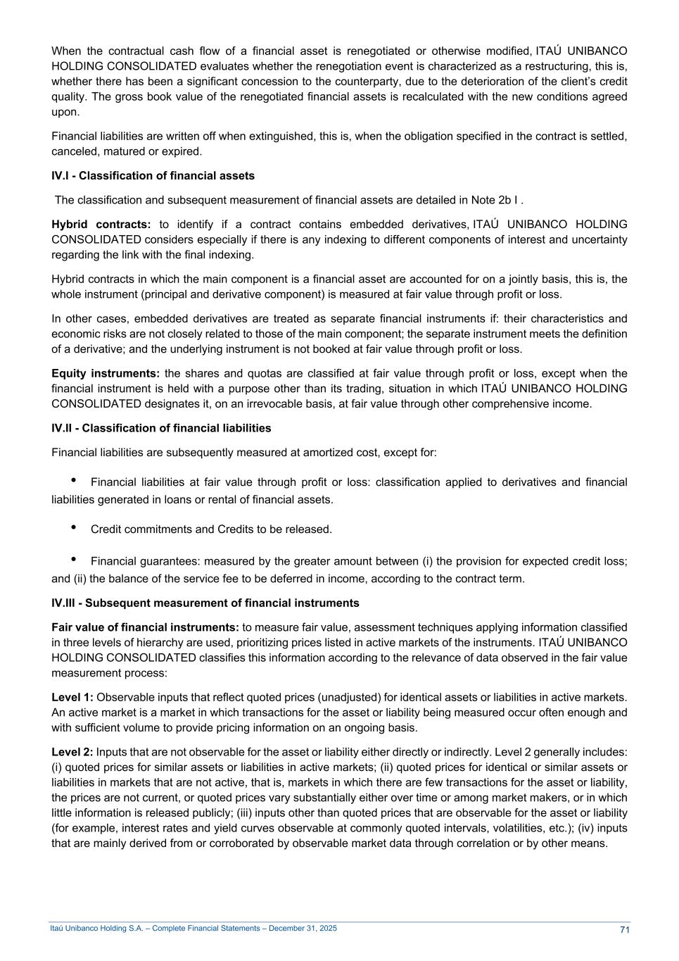 Itaú Unibanco Holding S.A. – Complete Financial Statements – December 31, 2025 When the contractual cash flow of a financial asset is renegotiated or otherwise modified, ITAÚ UNIBANCO HOLDING CONSOLIDATED evaluates whether the renegotiation event is characterized as a restructuring, this is, whether there has been a significant concession to the counterparty, due to the deterioration of the client’s credit quality. The gross book value of the renegotiated financial assets is recalculated with the new conditions agreed upon. Financial liabilities are written off when extinguished, this is, when the obligation specified in the contract is settled, canceled, matured or expired. IV.I - Classification of financial assets The classification and subsequent measurement of financial assets are detailed in Note 2b I . Hybrid contracts: to identify if a contract contains embedded derivatives, ITAÚ UNIBANCO HOLDING CONSOLIDATED considers especially if there is any indexing to different components of interest and uncertainty regarding the link with the final indexing. Hybrid contracts in which the main component is a financial asset are accounted for on a jointly basis, this is, the whole instrument (principal and derivative component) is measured at fair value through profit or loss. In other cases, embedded derivatives are treated as separate financial instruments if: their characteristics and economic risks are not closely related to those of the main component; the separate instrument meets the definition of a derivative; and the underlying instrument is not booked at fair value through profit or loss. Equity instruments: the shares and quotas are classified at fair value through profit or loss, except when the financial instrument is held with a purpose other than its trading, situation in which ITAÚ UNIBANCO HOLDING CONSOLIDATED designates it, on an irrevocable basis, at fair value through other comprehensive income. IV.II - Classification of financial liabilities Financial liabilities are subsequently measured at amortized cost, except for: • Financial liabilities at fair value through profit or loss: classification applied to derivatives and financial liabilities generated in loans or rental of financial assets. • Credit commitments and Credits to be released. • Financial guarantees: measured by the greater amount between (i) the provision for expected credit loss; and (ii) the balance of the service fee to be deferred in income, according to the contract term. IV.III - Subsequent measurement of financial instruments Fair value of financial instruments: to measure fair value, assessment techniques applying information classified in three levels of hierarchy are used, prioritizing prices listed in active markets of the instruments. ITAÚ UNIBANCO HOLDING CONSOLIDATED classifies this information according to the relevance of data observed in the fair value measurement process: Level 1: Observable inputs that reflect quoted prices (unadjusted) for identical assets or liabilities in active markets. An active market is a market in which transactions for the asset or liability being measured occur often enough and with sufficient volume to provide pricing information on an ongoing basis. Level 2: Inputs that are not observable for the asset or liability either directly or indirectly. Level 2 generally includes: (i) quoted prices for similar assets or liabilities in active markets; (ii) quoted prices for identical or similar assets or liabilities in markets that are not active, that is, markets in which there are few transactions for the asset or liability, the prices are not current, or quoted prices vary substantially either over time or among market makers, or in which little information is released publicly; (iii) inputs other than quoted prices that are observable for the asset or liability (for example, interest rates and yield curves observable at commonly quoted intervals, volatilities, etc.); (iv) inputs that are mainly derived from or corroborated by observable market data through correlation or by other means. 71