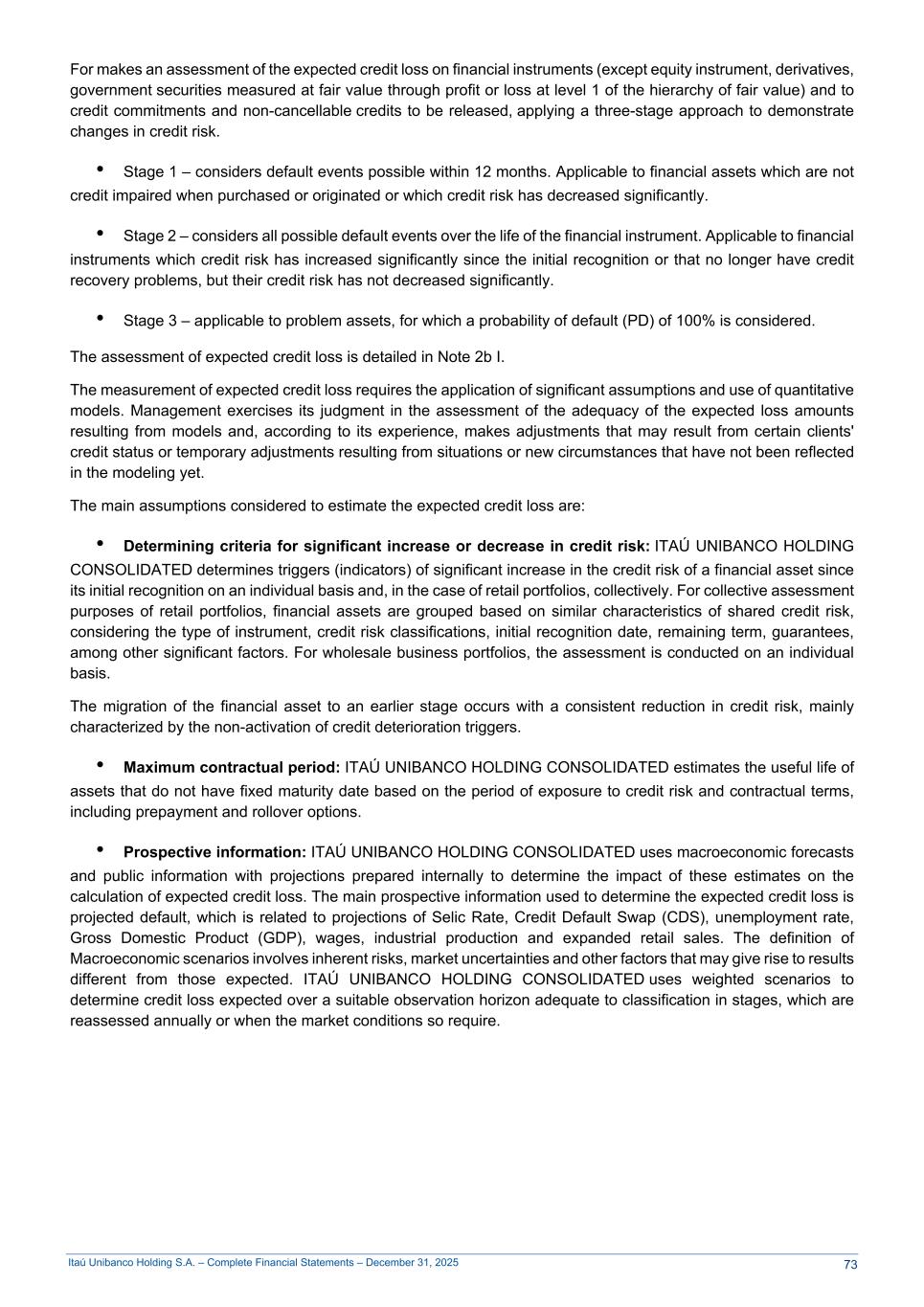 Itaú Unibanco Holding S.A. – Complete Financial Statements – December 31, 2025 For makes an assessment of the expected credit loss on financial instruments (except equity instrument, derivatives, government securities measured at fair value through profit or loss at level 1 of the hierarchy of fair value) and to credit commitments and non-cancellable credits to be released, applying a three-stage approach to demonstrate changes in credit risk. • Stage 1 – considers default events possible within 12 months. Applicable to financial assets which are not credit impaired when purchased or originated or which credit risk has decreased significantly. • Stage 2 – considers all possible default events over the life of the financial instrument. Applicable to financial instruments which credit risk has increased significantly since the initial recognition or that no longer have credit recovery problems, but their credit risk has not decreased significantly. • Stage 3 – applicable to problem assets, for which a probability of default (PD) of 100% is considered. The assessment of expected credit loss is detailed in Note 2b I. The measurement of expected credit loss requires the application of significant assumptions and use of quantitative models. Management exercises its judgment in the assessment of the adequacy of the expected loss amounts resulting from models and, according to its experience, makes adjustments that may result from certain clients' credit status or temporary adjustments resulting from situations or new circumstances that have not been reflected in the modeling yet. The main assumptions considered to estimate the expected credit loss are: • Determining criteria for significant increase or decrease in credit risk: ITAÚ UNIBANCO HOLDING CONSOLIDATED determines triggers (indicators) of significant increase in the credit risk of a financial asset since its initial recognition on an individual basis and, in the case of retail portfolios, collectively. For collective assessment purposes of retail portfolios, financial assets are grouped based on similar characteristics of shared credit risk, considering the type of instrument, credit risk classifications, initial recognition date, remaining term, guarantees, among other significant factors. For wholesale business portfolios, the assessment is conducted on an individual basis. The migration of the financial asset to an earlier stage occurs with a consistent reduction in credit risk, mainly characterized by the non-activation of credit deterioration triggers. • Maximum contractual period: ITAÚ UNIBANCO HOLDING CONSOLIDATED estimates the useful life of assets that do not have fixed maturity date based on the period of exposure to credit risk and contractual terms, including prepayment and rollover options. • Prospective information: ITAÚ UNIBANCO HOLDING CONSOLIDATED uses macroeconomic forecasts and public information with projections prepared internally to determine the impact of these estimates on the calculation of expected credit loss. The main prospective information used to determine the expected credit loss is projected default, which is related to projections of Selic Rate, Credit Default Swap (CDS), unemployment rate, Gross Domestic Product (GDP), wages, industrial production and expanded retail sales. The definition of Macroeconomic scenarios involves inherent risks, market uncertainties and other factors that may give rise to results different from those expected. ITAÚ UNIBANCO HOLDING CONSOLIDATED uses weighted scenarios to determine credit loss expected over a suitable observation horizon adequate to classification in stages, which are reassessed annually or when the market conditions so require. 73