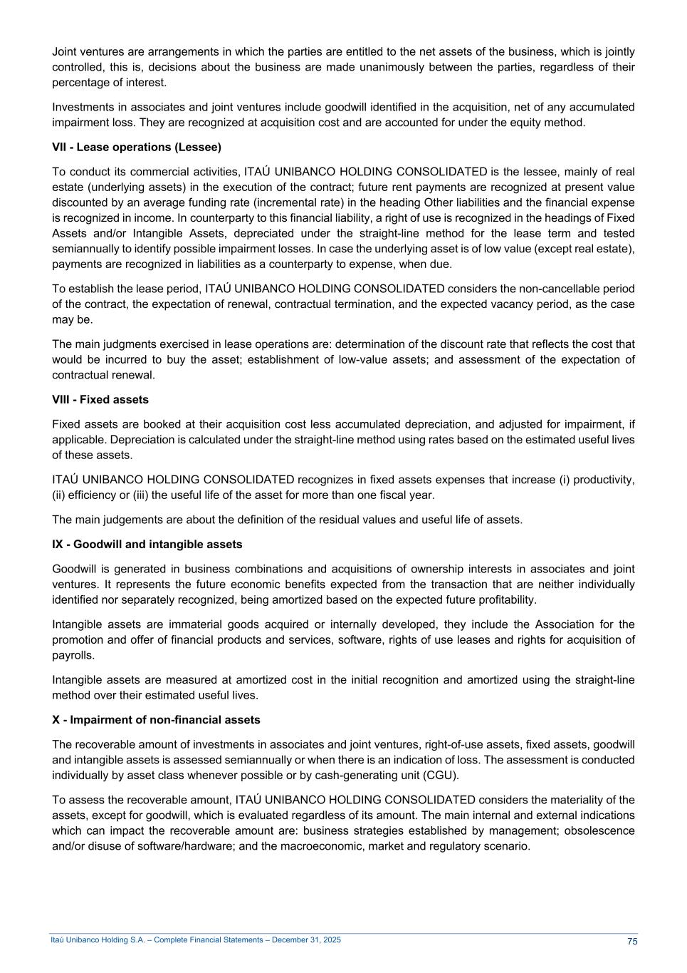 Itaú Unibanco Holding S.A. – Complete Financial Statements – December 31, 2025 Joint ventures are arrangements in which the parties are entitled to the net assets of the business, which is jointly controlled, this is, decisions about the business are made unanimously between the parties, regardless of their percentage of interest. Investments in associates and joint ventures include goodwill identified in the acquisition, net of any accumulated impairment loss. They are recognized at acquisition cost and are accounted for under the equity method. VII - Lease operations (Lessee) To conduct its commercial activities, ITAÚ UNIBANCO HOLDING CONSOLIDATED is the lessee, mainly of real estate (underlying assets) in the execution of the contract; future rent payments are recognized at present value discounted by an average funding rate (incremental rate) in the heading Other liabilities and the financial expense is recognized in income. In counterparty to this financial liability, a right of use is recognized in the headings of Fixed Assets and/or Intangible Assets, depreciated under the straight-line method for the lease term and tested semiannually to identify possible impairment losses. In case the underlying asset is of low value (except real estate), payments are recognized in liabilities as a counterparty to expense, when due. To establish the lease period, ITAÚ UNIBANCO HOLDING CONSOLIDATED considers the non-cancellable period of the contract, the expectation of renewal, contractual termination, and the expected vacancy period, as the case may be. The main judgments exercised in lease operations are: determination of the discount rate that reflects the cost that would be incurred to buy the asset; establishment of low-value assets; and assessment of the expectation of contractual renewal. VIII - Fixed assets Fixed assets are booked at their acquisition cost less accumulated depreciation, and adjusted for impairment, if applicable. Depreciation is calculated under the straight-line method using rates based on the estimated useful lives of these assets. ITAÚ UNIBANCO HOLDING CONSOLIDATED recognizes in fixed assets expenses that increase (i) productivity, (ii) efficiency or (iii) the useful life of the asset for more than one fiscal year. The main judgements are about the definition of the residual values and useful life of assets. IX - Goodwill and intangible assets Goodwill is generated in business combinations and acquisitions of ownership interests in associates and joint ventures. It represents the future economic benefits expected from the transaction that are neither individually identified nor separately recognized, being amortized based on the expected future profitability. Intangible assets are immaterial goods acquired or internally developed, they include the Association for the promotion and offer of financial products and services, software, rights of use leases and rights for acquisition of payrolls. Intangible assets are measured at amortized cost in the initial recognition and amortized using the straight-line method over their estimated useful lives. X - Impairment of non-financial assets The recoverable amount of investments in associates and joint ventures, right-of-use assets, fixed assets, goodwill and intangible assets is assessed semiannually or when there is an indication of loss. The assessment is conducted individually by asset class whenever possible or by cash-generating unit (CGU). To assess the recoverable amount, ITAÚ UNIBANCO HOLDING CONSOLIDATED considers the materiality of the assets, except for goodwill, which is evaluated regardless of its amount. The main internal and external indications which can impact the recoverable amount are: business strategies established by management; obsolescence and/or disuse of software/hardware; and the macroeconomic, market and regulatory scenario. 75
