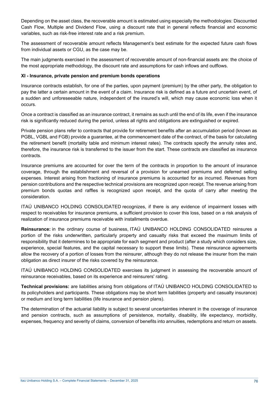 Itaú Unibanco Holding S.A. – Complete Financial Statements – December 31, 2025 Depending on the asset class, the recoverable amount is estimated using especially the methodologies: Discounted Cash Flow, Multiple and Dividend Flow, using a discount rate that in general reflects financial and economic variables, such as risk-free interest rate and a risk premium. The assessment of recoverable amount reflects Management’s best estimate for the expected future cash flows from individual assets or CGU, as the case may be. The main judgments exercised in the assessment of recoverable amount of non-financial assets are: the choice of the most appropriate methodology, the discount rate and assumptions for cash inflows and outflows. XI - Insurance, private pension and premium bonds operations Insurance contracts establish, for one of the parties, upon payment (premium) by the other party, the obligation to pay the latter a certain amount in the event of a claim. Insurance risk is defined as a future and uncertain event, of a sudden and unforeseeable nature, independent of the insured’s will, which may cause economic loss when it occurs. Once a contract is classified as an insurance contract, it remains as such until the end of its life, even if the insurance risk is significantly reduced during the period, unless all rights and obligations are extinguished or expired. Private pension plans refer to contracts that provide for retirement benefits after an accumulation period (known as PGBL, VGBL and FGB) provide a guarantee, at the commencement date of the contract, of the basis for calculating the retirement benefit (mortality table and minimum interest rates). The contracts specify the annuity rates and, therefore, the insurance risk is transferred to the issuer from the start. These contracts are classified as insurance contracts. Insurance premiums are accounted for over the term of the contracts in proportion to the amount of insurance coverage, through the establishment and reversal of a provision for unearned premiums and deferred selling expenses. Interest arising from fractioning of insurance premiums is accounted for as incurred. Revenues from pension contributions and the respective technical provisions are recognized upon receipt. The revenue arising from premium bonds quotas and raffles is recognized upon receipt, and the quota of carry after meeting the consideration. ITAÚ UNIBANCO HOLDING CONSOLIDATED recognizes, if there is any evidence of impairment losses with respect to receivables for insurance premiums, a sufficient provision to cover this loss, based on a risk analysis of realization of insurance premiums receivable with installments overdue. Reinsurance: in the ordinary course of business, ITAÚ UNIBANCO HOLDING CONSOLIDATED reinsures a portion of the risks underwritten, particularly property and casualty risks that exceed the maximum limits of responsibility that it determines to be appropriate for each segment and product (after a study which considers size, experience, special features, and the capital necessary to support these limits). These reinsurance agreements allow the recovery of a portion of losses from the reinsurer, although they do not release the insurer from the main obligation as direct insurer of the risks covered by the reinsurance. ITAÚ UNIBANCO HOLDING CONSOLIDATED exercises its judgment in assessing the recoverable amount of reinsurance receivables, based on its experience and reinsurers' rating. Technical provisions: are liabilities arising from obligations of ITAÚ UNIBANCO HOLDING CONSOLIDATED to its policyholders and participants. These obligations may be short term liabilities (property and casualty insurance) or medium and long term liabilities (life insurance and pension plans). The determination of the actuarial liability is subject to several uncertainties inherent in the coverage of insurance and pension contracts, such as assumptions of persistence, mortality, disability, life expectancy, morbidity, expenses, frequency and severity of claims, conversion of benefits into annuities, redemptions and return on assets. 76