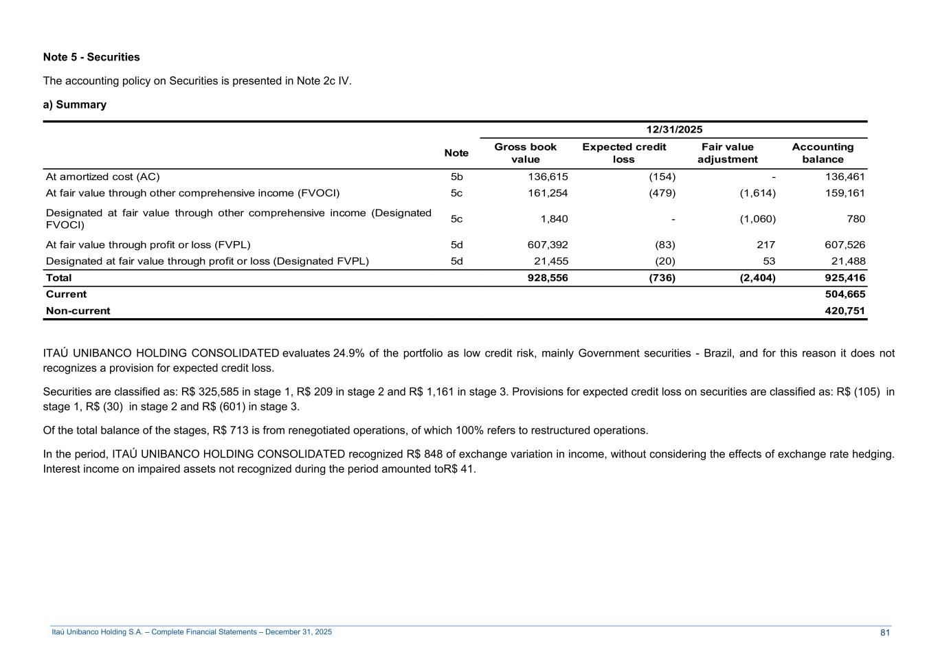 Itaú Unibanco Holding S.A. – Complete Financial Statements – December 31, 2025 Note 5 - Securities The accounting policy on Securities is presented in Note 2c IV. a) Summary 12/31/2025 Note Gross book value Expected credit loss Fair value adjustment Accounting balance At amortized cost (AC) 5b 136,615 (154) - 136,461 At fair value through other comprehensive income (FVOCI) 5c 161,254 (479) (1,614) 159,161 Designated at fair value through other comprehensive income (Designated FVOCI) 5c 1,840 - (1,060) 780 At fair value through profit or loss (FVPL) 5d 607,392 (83) 217 607,526 Designated at fair value through profit or loss (Designated FVPL) 5d 21,455 (20) 53 21,488 Total 928,556 (736) (2,404) 925,416 Current 504,665 Non-current 420,751 ITAÚ UNIBANCO HOLDING CONSOLIDATED evaluates 24.9% of the portfolio as low credit risk, mainly Government securities - Brazil, and for this reason it does not recognizes a provision for expected credit loss. Securities are classified as: R$ 325,585 in stage 1, R$ 209 in stage 2 and R$ 1,161 in stage 3. Provisions for expected credit loss on securities are classified as: R$ (105) in stage 1, R$ (30) in stage 2 and R$ (601) in stage 3. Of the total balance of the stages, R$ 713 is from renegotiated operations, of which 100% refers to restructured operations. In the period, ITAÚ UNIBANCO HOLDING CONSOLIDATED recognized R$ 848 of exchange variation in income, without considering the effects of exchange rate hedging. Interest income on impaired assets not recognized during the period amounted toR$ 41. 81