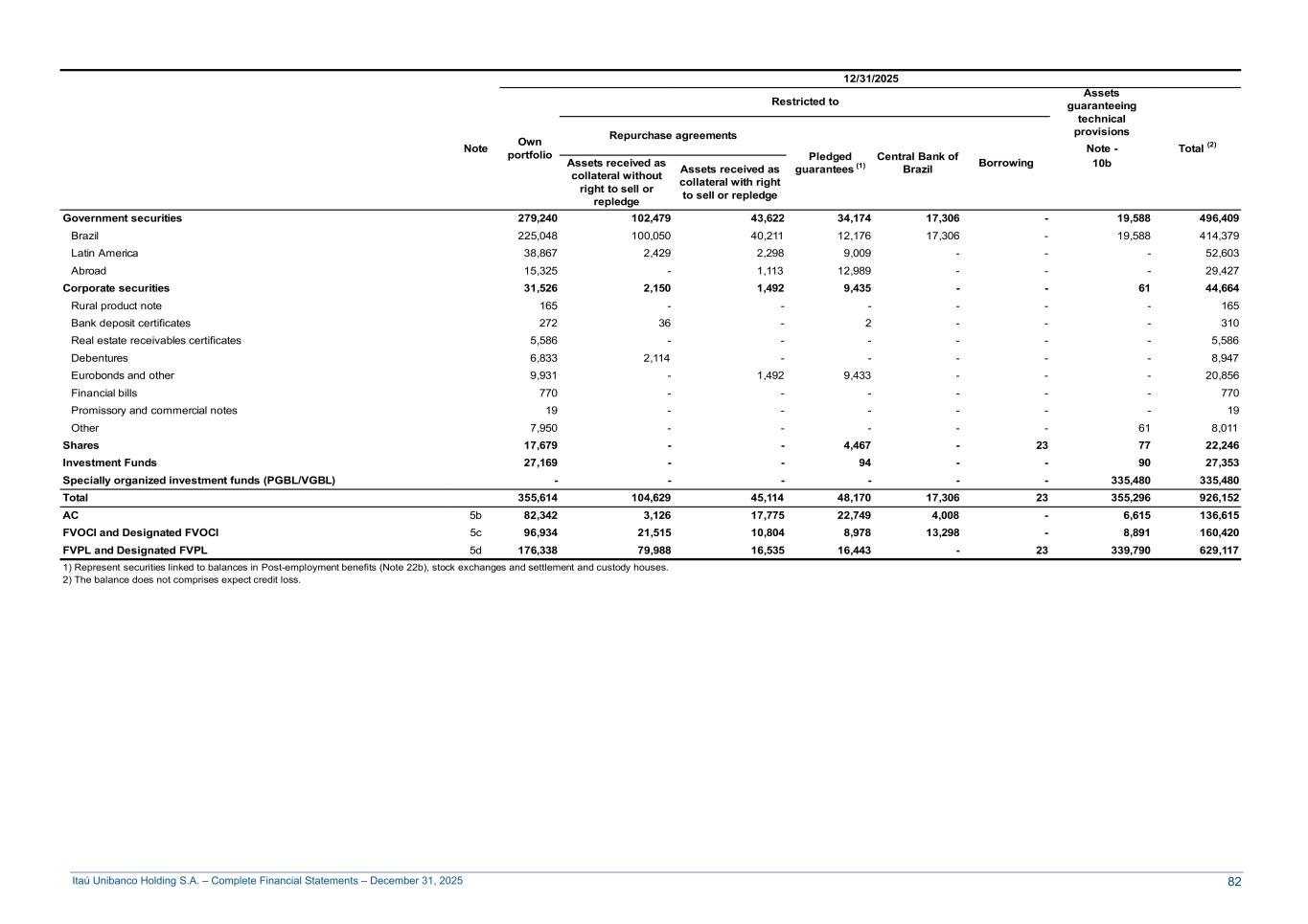 Itaú Unibanco Holding S.A. – Complete Financial Statements – December 31, 2025 12/31/2025 Note Own portfolio Restricted to Assets guaranteeing technical provisions Total (2) Repurchase agreements Pledged guarantees (1) Central Bank of Brazil Borrowing Note - Assets received as collateral without right to sell or repledge Assets received as collateral with right to sell or repledge 10b Government securities 279,240 102,479 43,622 34,174 17,306 - 19,588 496,409 Brazil 225,048 100,050 40,211 12,176 17,306 - 19,588 414,379 Latin America 38,867 2,429 2,298 9,009 - - - 52,603 Abroad 15,325 - 1,113 12,989 - - - 29,427 Corporate securities 31,526 2,150 1,492 9,435 - - 61 44,664 Rural product note 165 - - - - - - 165 Bank deposit certificates 272 36 - 2 - - - 310 Real estate receivables certificates 5,586 - - - - - - 5,586 Debentures 6,833 2,114 - - - - - 8,947 Eurobonds and other 9,931 - 1,492 9,433 - - - 20,856 Financial bills 770 - - - - - - 770 Promissory and commercial notes 19 - - - - - - 19 Other 7,950 - - - - - 61 8,011 Shares 17,679 - - 4,467 - 23 77 22,246 Investment Funds 27,169 - - 94 - - 90 27,353 Specially organized investment funds (PGBL/VGBL) - - - - - - 335,480 335,480 Total 355,614 104,629 45,114 48,170 17,306 23 355,296 926,152 AC 5b 82,342 3,126 17,775 22,749 4,008 - 6,615 136,615 FVOCI and Designated FVOCI 5c 96,934 21,515 10,804 8,978 13,298 - 8,891 160,420 FVPL and Designated FVPL 5d 176,338 79,988 16,535 16,443 - 23 339,790 629,117 1) Represent securities linked to balances in Post-employment benefits (Note 22b), stock exchanges and settlement and custody houses. 2) The balance does not comprises expect credit loss. 82