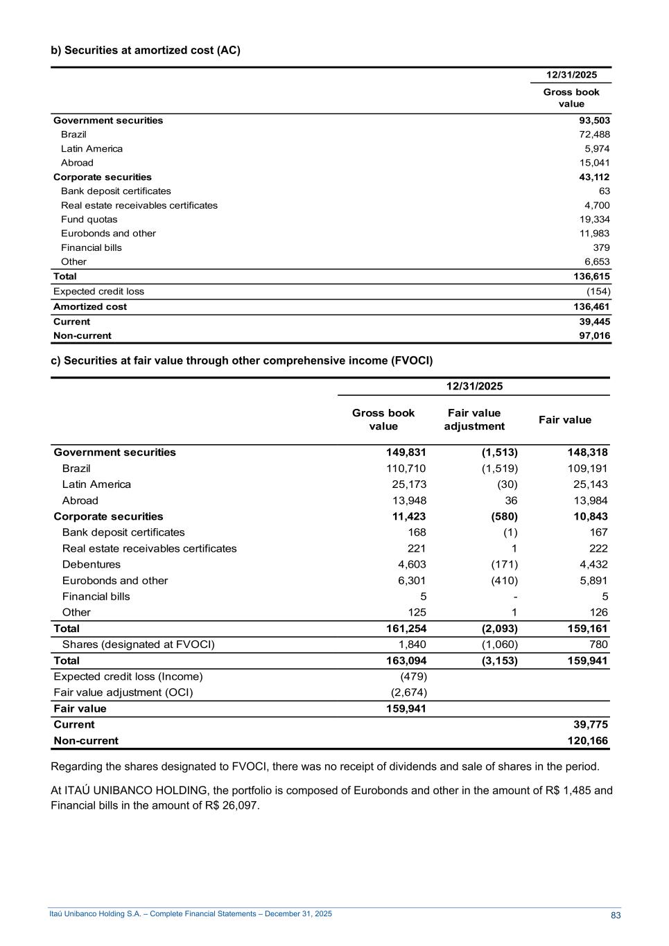Itaú Unibanco Holding S.A. – Complete Financial Statements – December 31, 2025 b) Securities at amortized cost (AC) 12/31/2025 Gross book value Government securities 93,503 Brazil 72,488 Latin America 5,974 Abroad 15,041 Corporate securities 43,112 Bank deposit certificates 63 Real estate receivables certificates 4,700 Fund quotas 19,334 Eurobonds and other 11,983 Financial bills 379 Other 6,653 Total 136,615 Expected credit loss (154) Amortized cost 136,461 Current 39,445 Non-current 97,016 c) Securities at fair value through other comprehensive income (FVOCI) 12/31/2025 Gross book value Fair value adjustment Fair value Government securities 149,831 (1,513) 148,318 Brazil 110,710 (1,519) 109,191 Latin America 25,173 (30) 25,143 Abroad 13,948 36 13,984 Corporate securities 11,423 (580) 10,843 Bank deposit certificates 168 (1) 167 Real estate receivables certificates 221 1 222 Debentures 4,603 (171) 4,432 Eurobonds and other 6,301 (410) 5,891 Financial bills 5 - 5 Other 125 1 126 Total 161,254 (2,093) 159,161 Shares (designated at FVOCI) 1,840 (1,060) 780 Total 163,094 (3,153) 159,941 Expected credit loss (Income) (479) Fair value adjustment (OCI) (2,674) Fair value 159,941 Current 39,775 Non-current 120,166 Regarding the shares designated to FVOCI, there was no receipt of dividends and sale of shares in the period. At ITAÚ UNIBANCO HOLDING, the portfolio is composed of Eurobonds and other in the amount of R$ 1,485 and Financial bills in the amount of R$ 26,097. 83