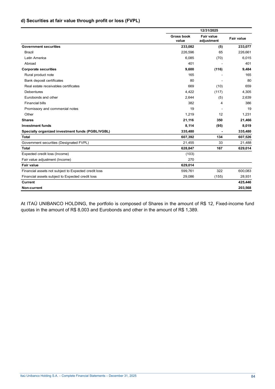Itaú Unibanco Holding S.A. – Complete Financial Statements – December 31, 2025 d) Securities at fair value through profit or loss (FVPL) 12/31/2025 Gross book value Fair value adjustment Fair value Government securities 233,082 (5) 233,077 Brazil 226,596 65 226,661 Latin America 6,085 (70) 6,015 Abroad 401 - 401 Corporate securities 9,600 (116) 9,484 Rural product note 165 - 165 Bank deposit certificates 80 - 80 Real estate receivables certificates 669 (10) 659 Debentures 4,422 (117) 4,305 Eurobonds and other 2,644 (5) 2,639 Financial bills 382 4 386 Promissory and commercial notes 19 - 19 Other 1,219 12 1,231 Shares 21,116 350 21,466 Investment funds 8,114 (95) 8,019 Specially organized investment funds (PGBL/VGBL) 335,480 - 335,480 Total 607,392 134 607,526 Government securities (Designated FVPL) 21,455 33 21,488 Total 628,847 167 629,014 Expected credit loss (Income) (103) Fair value adjustment (Income) 270 Fair value 629,014 Financial assets not subject to Expected credit loss 599,761 322 600,083 Financial assets subject to Expected credit loss 29,086 (155) 28,931 Current 425,446 Non-current 203,568 At ITAÚ UNIBANCO HOLDING, the portfolio is composed of Shares in the amount of R$ 12, Fixed-income fund quotas in the amount of R$ 8,003 and Eurobonds and other in the amount of R$ 1,389. 84