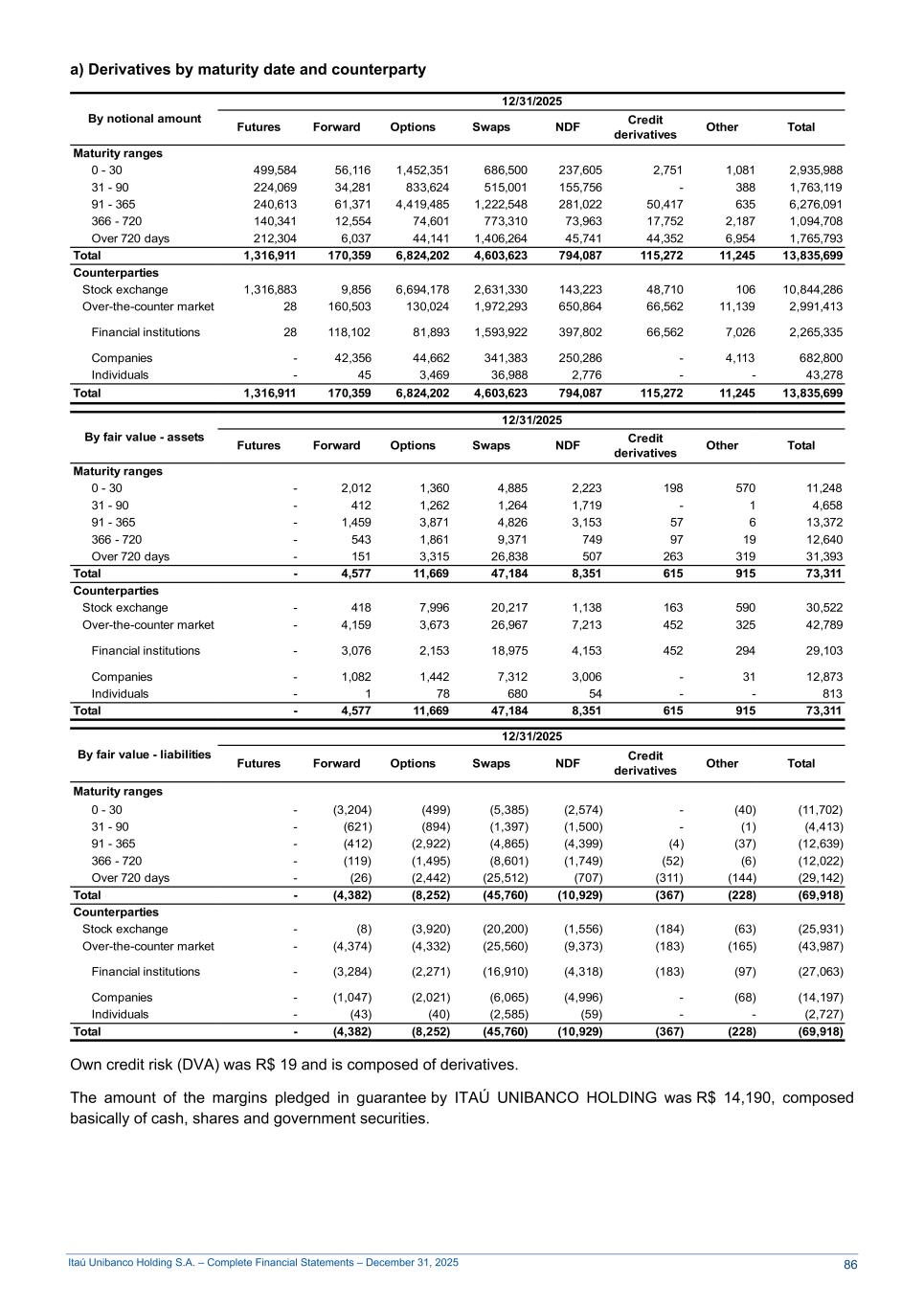 Itaú Unibanco Holding S.A. – Complete Financial Statements – December 31, 2025 a) Derivatives by maturity date and counterparty By notional amount 12/31/2025 Futures Forward Options Swaps NDF Credit derivatives Other Total Maturity ranges 0 - 30 499,584 56,116 1,452,351 686,500 237,605 2,751 1,081 2,935,988 31 - 90 224,069 34,281 833,624 515,001 155,756 - 388 1,763,119 91 - 365 240,613 61,371 4,419,485 1,222,548 281,022 50,417 635 6,276,091 366 - 720 140,341 12,554 74,601 773,310 73,963 17,752 2,187 1,094,708 Over 720 days 212,304 6,037 44,141 1,406,264 45,741 44,352 6,954 1,765,793 Total 1,316,911 170,359 6,824,202 4,603,623 794,087 115,272 11,245 13,835,699 Counterparties Stock exchange 1,316,883 9,856 6,694,178 2,631,330 143,223 48,710 106 10,844,286 Over-the-counter market 28 160,503 130,024 1,972,293 650,864 66,562 11,139 2,991,413 Financial institutions 28 118,102 81,893 1,593,922 397,802 66,562 7,026 2,265,335 Companies - 42,356 44,662 341,383 250,286 - 4,113 682,800 Individuals - 45 3,469 36,988 2,776 - - 43,278 Total 1,316,911 170,359 6,824,202 4,603,623 794,087 115,272 11,245 13,835,699 By fair value - assets 12/31/2025 Futures Forward Options Swaps NDF Credit derivatives Other Total Maturity ranges 0 - 30 - 2,012 1,360 4,885 2,223 198 570 11,248 31 - 90 - 412 1,262 1,264 1,719 - 1 4,658 91 - 365 - 1,459 3,871 4,826 3,153 57 6 13,372 366 - 720 - 543 1,861 9,371 749 97 19 12,640 Over 720 days - 151 3,315 26,838 507 263 319 31,393 Total - 4,577 11,669 47,184 8,351 615 915 73,311 Counterparties Stock exchange - 418 7,996 20,217 1,138 163 590 30,522 Over-the-counter market - 4,159 3,673 26,967 7,213 452 325 42,789 Financial institutions - 3,076 2,153 18,975 4,153 452 294 29,103 Companies - 1,082 1,442 7,312 3,006 - 31 12,873 Individuals - 1 78 680 54 - - 813 Total - 4,577 11,669 47,184 8,351 615 915 73,311 By fair value - liabilities 12/31/2025 Futures Forward Options Swaps NDF Credit derivatives Other Total Maturity ranges 0 - 30 - (3,204) (499) (5,385) (2,574) - (40) (11,702) 31 - 90 - (621) (894) (1,397) (1,500) - (1) (4,413) 91 - 365 - (412) (2,922) (4,865) (4,399) (4) (37) (12,639) 366 - 720 - (119) (1,495) (8,601) (1,749) (52) (6) (12,022) Over 720 days - (26) (2,442) (25,512) (707) (311) (144) (29,142) Total - (4,382) (8,252) (45,760) (10,929) (367) (228) (69,918) Counterparties Stock exchange - (8) (3,920) (20,200) (1,556) (184) (63) (25,931) Over-the-counter market - (4,374) (4,332) (25,560) (9,373) (183) (165) (43,987) Financial institutions - (3,284) (2,271) (16,910) (4,318) (183) (97) (27,063) Companies - (1,047) (2,021) (6,065) (4,996) - (68) (14,197) Individuals - (43) (40) (2,585) (59) - - (2,727) Total - (4,382) (8,252) (45,760) (10,929) (367) (228) (69,918) Own credit risk (DVA) was R$ 19 and is composed of derivatives. The amount of the margins pledged in guarantee by ITAÚ UNIBANCO HOLDING was R$ 14,190, composed basically of cash, shares and government securities. 86
