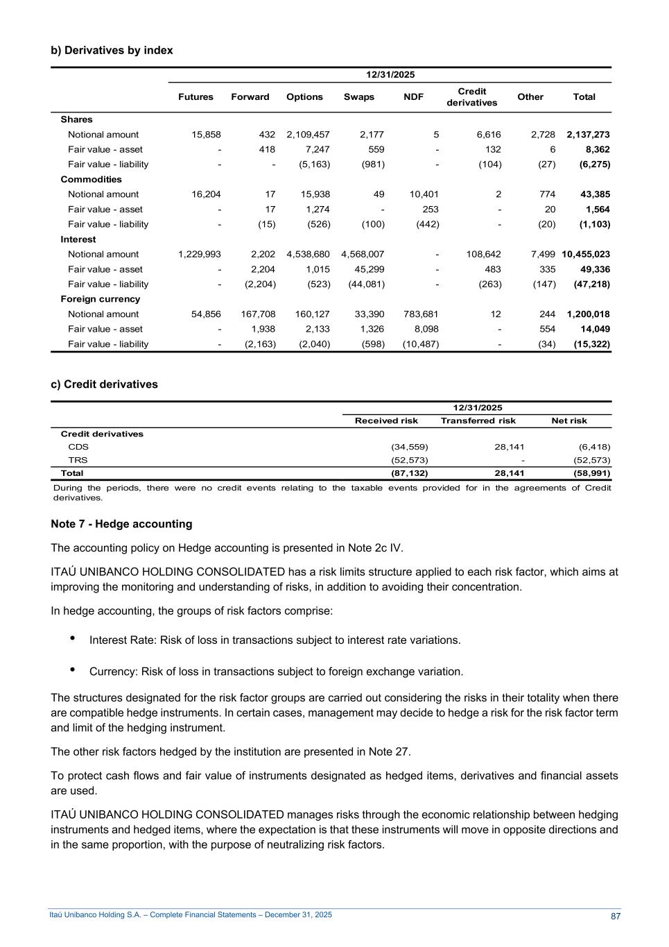 Itaú Unibanco Holding S.A. – Complete Financial Statements – December 31, 2025 b) Derivatives by index 12/31/2025 Futures Forward Options Swaps NDF Credit derivatives Other Total Shares Notional amount 15,858 432 2,109,457 2,177 5 6,616 2,728 2,137,273 Fair value - asset - 418 7,247 559 - 132 6 8,362 Fair value - liability - - (5,163) (981) - (104) (27) (6,275) Commodities Notional amount 16,204 17 15,938 49 10,401 2 774 43,385 Fair value - asset - 17 1,274 - 253 - 20 1,564 Fair value - liability - (15) (526) (100) (442) - (20) (1,103) Interest Notional amount 1,229,993 2,202 4,538,680 4,568,007 - 108,642 7,499 10,455,023 Fair value - asset - 2,204 1,015 45,299 - 483 335 49,336 Fair value - liability - (2,204) (523) (44,081) - (263) (147) (47,218) Foreign currency Notional amount 54,856 167,708 160,127 33,390 783,681 12 244 1,200,018 Fair value - asset - 1,938 2,133 1,326 8,098 - 554 14,049 Fair value - liability - (2,163) (2,040) (598) (10,487) - (34) (15,322) c) Credit derivatives 12/31/2025 Received risk Transferred risk Net risk Credit derivatives CDS (34,559) 28,141 (6,418) TRS (52,573) - (52,573) Total (87,132) 28,141 (58,991) During the periods, there were no credit events relating to the taxable events provided for in the agreements of Credit derivatives. Note 7 - Hedge accounting The accounting policy on Hedge accounting is presented in Note 2c IV. ITAÚ UNIBANCO HOLDING CONSOLIDATED has a risk limits structure applied to each risk factor, which aims at improving the monitoring and understanding of risks, in addition to avoiding their concentration. In hedge accounting, the groups of risk factors comprise: • Interest Rate: Risk of loss in transactions subject to interest rate variations. • Currency: Risk of loss in transactions subject to foreign exchange variation. The structures designated for the risk factor groups are carried out considering the risks in their totality when there are compatible hedge instruments. In certain cases, management may decide to hedge a risk for the risk factor term and limit of the hedging instrument. The other risk factors hedged by the institution are presented in Note 27. To protect cash flows and fair value of instruments designated as hedged items, derivatives and financial assets are used. ITAÚ UNIBANCO HOLDING CONSOLIDATED manages risks through the economic relationship between hedging instruments and hedged items, where the expectation is that these instruments will move in opposite directions and in the same proportion, with the purpose of neutralizing risk factors. 87