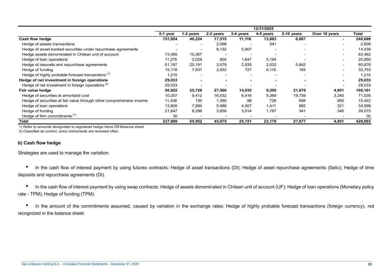 Itaú Unibanco Holding S.A. – Complete Financial Statements – December 31, 2025 12/31/2025 0-1 year 1-2 years 2-3 years 3-4 years 4-5 years 5-10 years Over 10 years Total Cash flow hedge 151,954 40,224 17,515 11,116 13,883 6,007 - 240,699 Hedge of assets transactions - - 2,068 - 541 - - 2,609 Hedge of asset-backed securities under repurchase agreements - - 8,132 5,907 - - - 14,039 Hedge assets denominated in Chilean unit of account 73,095 10,367 - - - - - 83,462 Hedge of loan operations 11,276 2,029 804 1,647 5,194 - - 20,950 Hedge of deposits and repurchase agreements 51,197 20,191 3,579 2,835 2,032 5,842 - 85,676 Hedge of funding 15,176 7,637 2,932 727 6,116 165 - 32,753 Hedge of highly probable forecast transactions (1) 1,210 - - - - - - 1,210 Hedge of net investment in foreign operations 29,033 - - - - - - 29,033 Hedge of net investment in foreign operations (2) 29,033 - - - - - - 29,033 Fair value hedge 56,922 25,728 27,560 14,035 9,295 21,670 4,951 160,161 Hedge of securities at amortized cost 10,207 9,412 16,532 6,416 5,369 19,759 3,340 71,035 Hedge of securities at fair value through other comprehensive income 11,438 130 1,390 98 728 688 950 15,422 Hedge of loan operations 13,600 7,890 5,988 4,507 1,411 882 321 34,599 Hedge of funding 21,647 8,296 3,650 3,014 1,787 341 340 39,075 Hedge of firm commitments (1) 30 - - - - - - 30 Total 237,909 65,952 45,075 25,151 23,178 27,677 4,951 429,893 1) Refer to amounts designated to registered hedge items Off-Balance sheet. 2) Classified as current, since instruments are renewed often. b) Cash flow hedge Strategies are used to manage the variation: • In the cash flow of interest payment by using futures contracts: Hedge of asset transactions (DI); Hedge of asset repurchase agreements (Selic); Hedge of time deposits and repurchase agreements (DI). • In the cash flow of interest payment by using swap contracts: Hedge of assets denominated in Chilean unit of account (UF); Hedge of loan operations (Monetary policy rate - TPM); Hedge of funding (TPM). • In the amount of the commitments assumed, caused by variation in the exchange rates: Hedge of highly probable forecast transactions (foreign currency), not recognized in the balance sheet. 89
