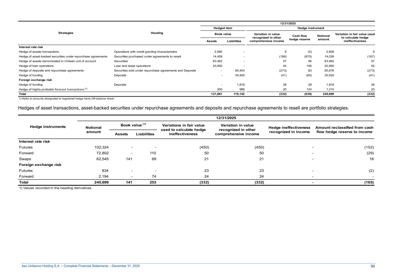 Itaú Unibanco Holding S.A. – Complete Financial Statements – December 31, 2025 Strategies Heading 12/31/2025 Hedged item Hedge instrument Book value Variation in value recognized in other comprehensive income Cash flow hedge reserve Notional amount Variation in fair value used to calculate hedge ineffectivenessAssets Liabilities Interest rate risk Hedge of assets transactions Operations with credit granting characteristics 2,590 - 9 (5) 2,609 9 Hedge of asset-backed securities under repurchase agreements Securities purchased under agreements to resell 14,459 - (186) (875) 14,039 (187) Hedge of assets denominated in Chilean unit of account Securities 83,462 - 57 56 83,462 57 Hedge of loan operations Loan and lease operations 20,950 - 54 106 20,950 55 Hedge of deposits and repurchase agreements Securities sold under repurchase agreements and Deposits - 85,403 (273) (8) 85,676 (273) Hedge of funding Deposits - 30,935 (41) (65) 30,935 (41) Foreign exchange risk Hedge of funding Deposits - 1,818 28 28 1,818 28 Hedge of highly probable forecast transactions (1) 200 986 20 124 1,210 20 Total 121,661 119,142 (332) (639) 240,699 (332) 1) Refer to amounts designated to registered hedge items Off-balance sheet. Hedges of asset transactions, asset-backed securities under repurchase agreements and deposits and repurchase agreements to resell are portfolio strategies. Hedge instruments 12/31/2025 Notional amount Book value (1) Variations in fair value used to calculate hedge ineffectiveness Variation in value recognized in other comprehensive income Hedge ineffectiveness recognized in income Amount reclassified from cash flow hedge reserve to incomeAssets Liabilities Interest rate risk Futures 102,324 - - (450) (450) - (152) Forward 72,802 - 110 50 50 - (29) Swaps 62,545 141 69 21 21 - 18 Foreign exchange risk Futures 834 - - 23 23 - (2) Forward 2,194 - 74 24 24 - - Total 240,699 141 253 (332) (332) - (165) 1) Values recorded in the heading derivatives. 90