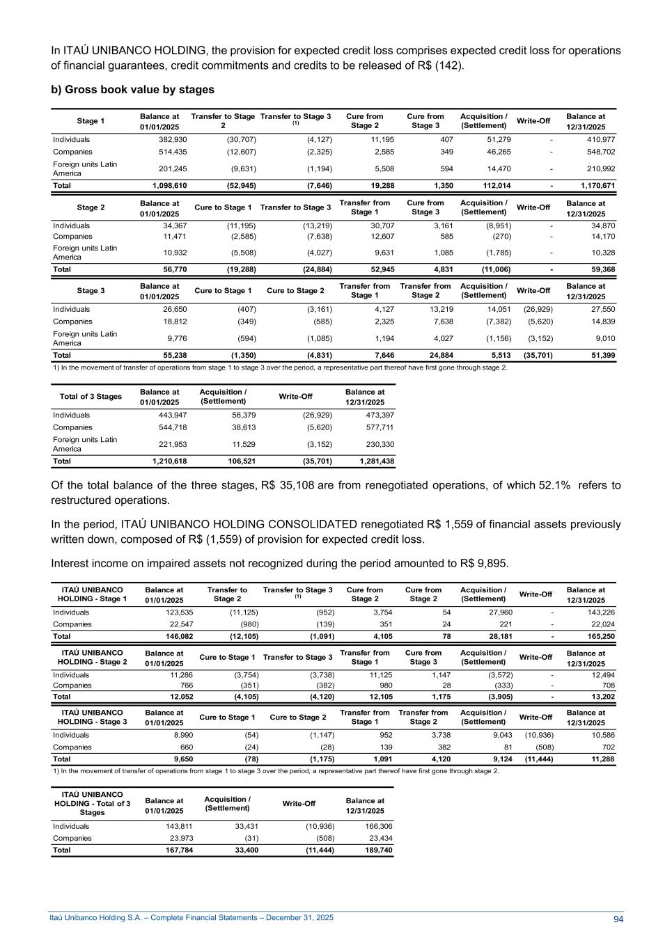 Itaú Unibanco Holding S.A. – Complete Financial Statements – December 31, 2025 In ITAÚ UNIBANCO HOLDING, the provision for expected credit loss comprises expected credit loss for operations of financial guarantees, credit commitments and credits to be released of R$ (142). b) Gross book value by stages Stage 1 Balance at Transfer to Stage 2 Transfer to Stage 3 (1) Cure from Stage 2 Cure from Stage 3 Acquisition / (Settlement) Write-Off Balance at 01/01/2025 12/31/2025 Individuals 382,930 (30,707) (4,127) 11,195 407 51,279 - 410,977 Companies 514,435 (12,607) (2,325) 2,585 349 46,265 - 548,702 Foreign units Latin America 201,245 (9,631) (1,194) 5,508 594 14,470 - 210,992 Total 1,098,610 (52,945) (7,646) 19,288 1,350 112,014 - 1,170,671 Stage 2 Balance at Cure to Stage 1 Transfer to Stage 3 Transfer from Stage 1 Cure from Stage 3 Acquisition / (Settlement) Write-Off Balance at 01/01/2025 12/31/2025 Individuals 34,367 (11,195) (13,219) 30,707 3,161 (8,951) - 34,870 Companies 11,471 (2,585) (7,638) 12,607 585 (270) - 14,170 Foreign units Latin America 10,932 (5,508) (4,027) 9,631 1,085 (1,785) - 10,328 Total 56,770 (19,288) (24,884) 52,945 4,831 (11,006) - 59,368 Stage 3 Balance at Cure to Stage 1 Cure to Stage 2 Transfer from Stage 1 Transfer from Stage 2 Acquisition / (Settlement) Write-Off Balance at 01/01/2025 12/31/2025 Individuals 26,650 (407) (3,161) 4,127 13,219 14,051 (26,929) 27,550 Companies 18,812 (349) (585) 2,325 7,638 (7,382) (5,620) 14,839 Foreign units Latin America 9,776 (594) (1,085) 1,194 4,027 (1,156) (3,152) 9,010 Total 55,238 (1,350) (4,831) 7,646 24,884 5,513 (35,701) 51,399 1) In the movement of transfer of operations from stage 1 to stage 3 over the period, a representative part thereof have first gone through stage 2. Total of 3 Stages Balance at Acquisition / (Settlement) Write-Off Balance at 01/01/2025 12/31/2025 Individuals 443,947 56,379 (26,929) 473,397 Companies 544,718 38,613 (5,620) 577,711 Foreign units Latin America 221,953 11,529 (3,152) 230,330 Total 1,210,618 106,521 (35,701) 1,281,438 Of the total balance of the three stages, R$ 35,108 are from renegotiated operations, of which 52.1% refers to restructured operations. In the period, ITAÚ UNIBANCO HOLDING CONSOLIDATED renegotiated R$ 1,559 of financial assets previously written down, composed of R$ (1,559) of provision for expected credit loss. Interest income on impaired assets not recognized during the period amounted to R$ 9,895. ITAÚ UNIBANCO HOLDING - Stage 1 Balance at Transfer to Stage 2 Transfer to Stage 3 (1) Cure from Stage 2 Cure from Stage 2 Acquisition / (Settlement) Write-Off Balance at 01/01/2025 12/31/2025 Individuals 123,535 (11,125) (952) 3,754 54 27,960 - 143,226 Companies 22,547 (980) (139) 351 24 221 - 22,024 Total 146,082 (12,105) (1,091) 4,105 78 28,181 - 165,250 ITAÚ UNIBANCO HOLDING - Stage 2 Balance at Cure to Stage 1 Transfer to Stage 3 Transfer from Stage 1 Cure from Stage 3 Acquisition / (Settlement) Write-Off Balance at 01/01/2025 12/31/2025 Individuals 11,286 (3,754) (3,738) 11,125 1,147 (3,572) - 12,494 Companies 766 (351) (382) 980 28 (333) - 708 Total 12,052 (4,105) (4,120) 12,105 1,175 (3,905) - 13,202 ITAÚ UNIBANCO HOLDING - Stage 3 Balance at Cure to Stage 1 Cure to Stage 2 Transfer from Stage 1 Transfer from Stage 2 Acquisition / (Settlement) Write-Off Balance at 01/01/2025 12/31/2025 Individuals 8,990 (54) (1,147) 952 3,738 9,043 (10,936) 10,586 Companies 660 (24) (28) 139 382 81 (508) 702 Total 9,650 (78) (1,175) 1,091 4,120 9,124 (11,444) 11,288 1) In the movement of transfer of operations from stage 1 to stage 3 over the period, a representative part thereof have first gone through stage 2. ITAÚ UNIBANCO HOLDING - Total of 3 Stages Balance at Acquisition / (Settlement) Write-Off Balance at 01/01/2025 12/31/2025 Individuals 143,811 33,431 (10,936) 166,306 Companies 23,973 (31) (508) 23,434 Total 167,784 33,400 (11,444) 189,740 94