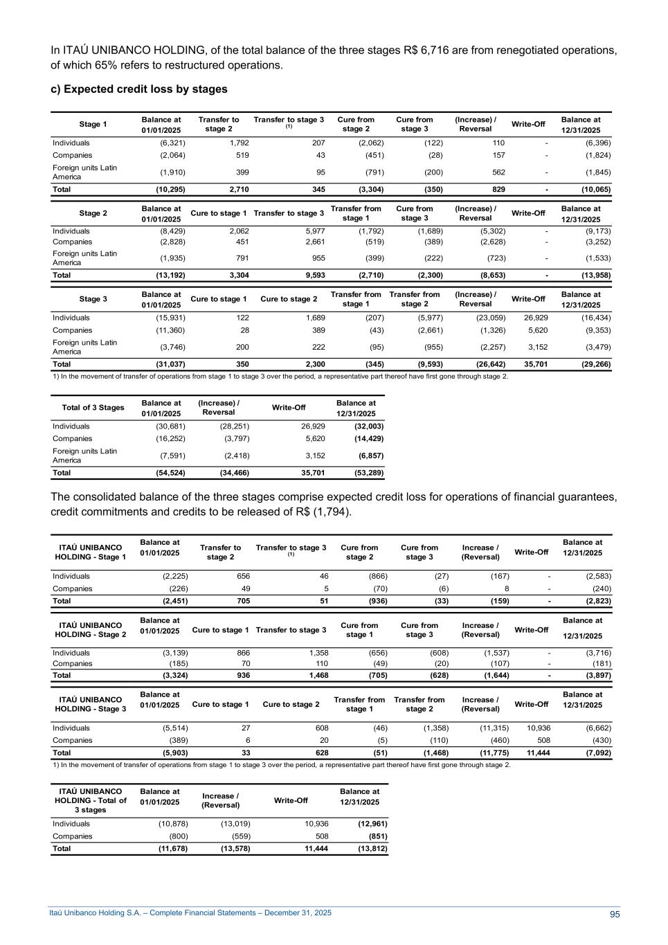 Itaú Unibanco Holding S.A. – Complete Financial Statements – December 31, 2025 In ITAÚ UNIBANCO HOLDING, of the total balance of the three stages R$ 6,716 are from renegotiated operations, of which 65% refers to restructured operations. c) Expected credit loss by stages Stage 1 Balance at Transfer to stage 2 Transfer to stage 3 (1) Cure from stage 2 Cure from stage 3 (Increase) / Reversal Write-Off Balance at 01/01/2025 12/31/2025 Individuals (6,321) 1,792 207 (2,062) (122) 110 - (6,396) Companies (2,064) 519 43 (451) (28) 157 - (1,824) Foreign units Latin America (1,910) 399 95 (791) (200) 562 - (1,845) Total (10,295) 2,710 345 (3,304) (350) 829 - (10,065) Stage 2 Balance at Cure to stage 1 Transfer to stage 3 Transfer from stage 1 Cure from stage 3 (Increase) / Reversal Write-Off Balance at 01/01/2025 12/31/2025 Individuals (8,429) 2,062 5,977 (1,792) (1,689) (5,302) - (9,173) Companies (2,828) 451 2,661 (519) (389) (2,628) - (3,252) Foreign units Latin America (1,935) 791 955 (399) (222) (723) - (1,533) Total (13,192) 3,304 9,593 (2,710) (2,300) (8,653) - (13,958) Stage 3 Balance at Cure to stage 1 Cure to stage 2 Transfer from stage 1 Transfer from stage 2 (Increase) / Reversal Write-Off Balance at 01/01/2025 12/31/2025 Individuals (15,931) 122 1,689 (207) (5,977) (23,059) 26,929 (16,434) Companies (11,360) 28 389 (43) (2,661) (1,326) 5,620 (9,353) Foreign units Latin America (3,746) 200 222 (95) (955) (2,257) 3,152 (3,479) Total (31,037) 350 2,300 (345) (9,593) (26,642) 35,701 (29,266) 1) In the movement of transfer of operations from stage 1 to stage 3 over the period, a representative part thereof have first gone through stage 2. Total of 3 Stages Balance at (Increase) / Reversal Write-Off Balance at 01/01/2025 12/31/2025 Individuals (30,681) (28,251) 26,929 (32,003) Companies (16,252) (3,797) 5,620 (14,429) Foreign units Latin America (7,591) (2,418) 3,152 (6,857) Total (54,524) (34,466) 35,701 (53,289) The consolidated balance of the three stages comprise expected credit loss for operations of financial guarantees, credit commitments and credits to be released of R$ (1,794). ITAÚ UNIBANCO HOLDING - Stage 1 Balance at Transfer to stage 2 Transfer to stage 3 (1) Cure from stage 2 Cure from stage 3 Increase / (Reversal) Write-Off Balance at 01/01/2025 12/31/2025 Individuals (2,225) 656 46 (866) (27) (167) - (2,583) Companies (226) 49 5 (70) (6) 8 - (240) Total (2,451) 705 51 (936) (33) (159) - (2,823) ITAÚ UNIBANCO HOLDING - Stage 2 Balance at Cure to stage 1 Transfer to stage 3 Cure from stage 1 Cure from stage 3 Increase / (Reversal) Write-Off Balance at 01/01/2025 12/31/2025 Individuals (3,139) 866 1,358 (656) (608) (1,537) - (3,716) Companies (185) 70 110 (49) (20) (107) - (181) Total (3,324) 936 1,468 (705) (628) (1,644) - (3,897) ITAÚ UNIBANCO HOLDING - Stage 3 Balance at Cure to stage 1 Cure to stage 2 Transfer from stage 1 Transfer from stage 2 Increase / (Reversal) Write-Off Balance at 01/01/2025 12/31/2025 Individuals (5,514) 27 608 (46) (1,358) (11,315) 10,936 (6,662) Companies (389) 6 20 (5) (110) (460) 508 (430) Total (5,903) 33 628 (51) (1,468) (11,775) 11,444 (7,092) 1) In the movement of transfer of operations from stage 1 to stage 3 over the period, a representative part thereof have first gone through stage 2. ITAÚ UNIBANCO HOLDING - Total of 3 stages Balance at Increase / (Reversal) Write-Off Balance at 01/01/2025 12/31/2025 Individuals (10,878) (13,019) 10,936 (12,961) Companies (800) (559) 508 (851) Total (11,678) (13,578) 11,444 (13,812) 95