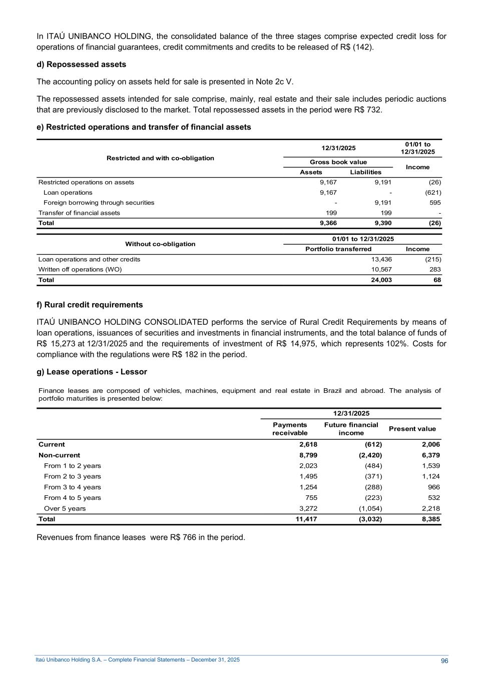 Itaú Unibanco Holding S.A. – Complete Financial Statements – December 31, 2025 In ITAÚ UNIBANCO HOLDING, the consolidated balance of the three stages comprise expected credit loss for operations of financial guarantees, credit commitments and credits to be released of R$ (142). d) Repossessed assets The accounting policy on assets held for sale is presented in Note 2c V. The repossessed assets intended for sale comprise, mainly, real estate and their sale includes periodic auctions that are previously disclosed to the market. Total repossessed assets in the period were R$ 732. e) Restricted operations and transfer of financial assets Restricted and with co-obligation 12/31/2025 01/01 to 12/31/2025 Gross book value Income Assets Liabilities Restricted operations on assets 9,167 9,191 (26) Loan operations 9,167 - (621) Foreign borrowing through securities - 9,191 595 Transfer of financial assets 199 199 - Total 9,366 9,390 (26) Without co-obligation 01/01 to 12/31/2025 Portfolio transferred Income Loan operations and other credits 13,436 (215) Written off operations (WO) 10,567 283 Total 24,003 68 f) Rural credit requirements ITAÚ UNIBANCO HOLDING CONSOLIDATED performs the service of Rural Credit Requirements by means of loan operations, issuances of securities and investments in financial instruments, and the total balance of funds of R$ 15,273 at 12/31/2025 and the requirements of investment of R$ 14,975, which represents 102%. Costs for compliance with the regulations were R$ 182 in the period. g) Lease operations - Lessor Finance leases are composed of vehicles, machines, equipment and real estate in Brazil and abroad. The analysis of portfolio maturities is presented below: 12/31/2025 Payments receivable Future financial income Present value Current 2,618 (612) 2,006 Non-current 8,799 (2,420) 6,379 From 1 to 2 years 2,023 (484) 1,539 From 2 to 3 years 1,495 (371) 1,124 From 3 to 4 years 1,254 (288) 966 From 4 to 5 years 755 (223) 532 Over 5 years 3,272 (1,054) 2,218 Total 11,417 (3,032) 8,385 Revenues from finance leases were R$ 766 in the period. 96
