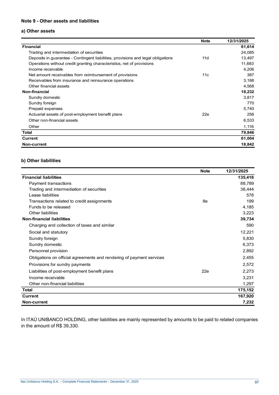 Itaú Unibanco Holding S.A. – Complete Financial Statements – December 31, 2025 Note 9 - Other assets and liabilities a) Other assets Note 12/31/2025 Financial 61,614 Trading and intermediation of securities 24,085 Deposits in guarantee - Contingent liabilities, provisions and legal obligations 11d 13,497 Operations without credit granting characteristics, net of provisions 11,683 Income receivable 4,206 Net amount receivables from reimbursement of provisions 11c 387 Receivables from insurance and reinsurance operations 3,188 Other financial assets 4,568 Non-financial 18,232 Sundry domestic 3,817 Sundry foreign 770 Prepaid expenses 5,740 Actuarial assets of post-employment benefit plans 22e 256 Other non-financial assets 6,533 Other 1,116 Total 79,846 Current 61,004 Non-current 18,842 b) Other liabilities Note 12/31/2025 Financial liabilities 135,418 Payment transactions 88,789 Trading and intermediation of securities 38,444 Lease liabilities 578 Transactions related to credit assignments 8e 199 Funds to be released 4,185 Other liabilities 3,223 Non-financial liabilities 39,734 Charging and collection of taxes and similar 590 Social and statutory 12,221 Sundry foreign 5,830 Sundry domestic 6,373 Personnel provision 2,892 Obligations on official agreements and rendering of payment services 2,455 Provisions for sundry payments 2,572 Liabilities of post-employment benefit plans 22e 2,273 Income receivable 3,231 Other non-financial liabilities 1,297 Total 175,152 Current 167,920 Non-current 7,232 In ITAÚ UNIBANCO HOLDING, other liabilities are mainly represented by amounts to be paid to related companies in the amount of R$ 39,330. 97