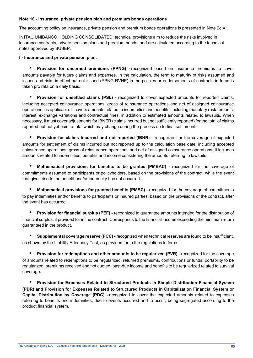 Itaú Unibanco Holding S.A. – Complete Financial Statements – December 31, 2025 Note 10 - Insurance, private pension plan and premium bonds operations The accounting policy on insurance, private pension and premium bonds operations is presented in Note 2c XI. In ITAÚ UNIBANCO HOLDING CONSOLIDATED, technical provisions aim to reduce the risks involved in insurance contracts, private pension plans and premium bonds, and are calculated according to the technical notes approved by SUSEP. I - Insurance and private pension plan: • Provision for unearned premiums (PPNG) - recognized based on insurance premiums to cover amounts payable for future claims and expenses. In the calculation, the term to maturity of risks assumed and issued and risks in effect but not issued (PPNG-RVNE) in the policies or endorsements of contracts in force is taken pro rata on a daily basis. • Provision for unsettled claims (PSL) - recognized to cover expected amounts for reported claims, including accepted coinsurance operations, gross of reinsurance operations and net of assigned coinsurance operations, as applicable. It covers amounts related to indemnities and benefits, including monetary restatements, interest, exchange variations and contractual fines, in addition to estimated amounts related to lawsuits. When necessary, it must cover adjustments for IBNER (claims incurred but not sufficiently reported) for the total of claims reported but not yet paid, a total which may change during the process up to final settlement. • Provision for claims incurred and not reported (IBNR) - recognized for the coverage of expected amounts for settlement of claims incurred but not reported up to the calculation base date, including accepted coinsurance operations, gross of reinsurance operations and net of assigned coinsurance operations. It includes amounts related to indemnities, benefits and income considering the amounts referring to lawsuits. • Mathematical provisions for benefits to be granted (PMBAC) - recognized for the coverage of commitments assumed to participants or policyholders, based on the provisions of the contract, while the event that gives rise to the benefit and/or indemnity has not occurred. • Mathematical provisions for granted benefits (PMBC) - recognized for the coverage of commitments to pay indemnities and/or benefits to participants or insured parties, based on the provisions of the contract, after the event has occurred. • Provision for financial surplus (PEF) - recognized to guarantee amounts intended for the distribution of financial surplus, if provided for in the contract. Corresponds to the financial income exceeding the minimum return guaranteed in the product. • Supplemental coverage reserve (PCC) - recognized when technical reserves are found to be insufficient, as shown by the Liability Adequacy Test, as provided for in the regulations in force. • Provision for redemptions and other amounts to be regularized (PVR) - recognized for the coverage of amounts related to redemptions to be regularized, returned premiums, contributions or funds, portability to be regularized, premiums received and not quoted, past-due income and benefits to be regularized related to survival coverage. • Provision for Expenses Related to Structured Products in Simple Distribution Financial System (PDR) and Provision for Expenses Related to Structured Products in Capitalization Financial System or Capital Distribution by Coverage (PDC) - recognized to cover the expected amounts related to expenses referring to benefits and indemnities, due to events occurred and to occur, being segregated according to the product financial system. 98